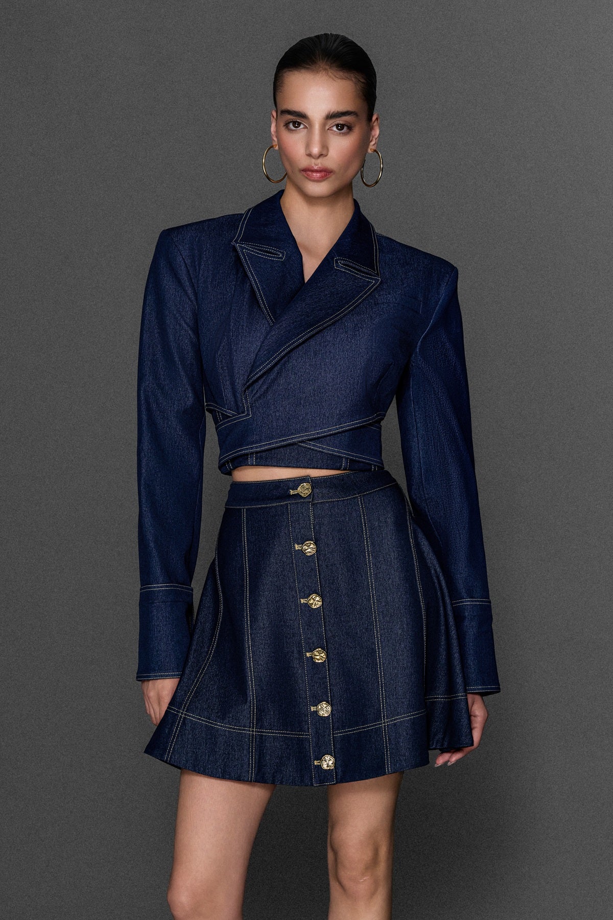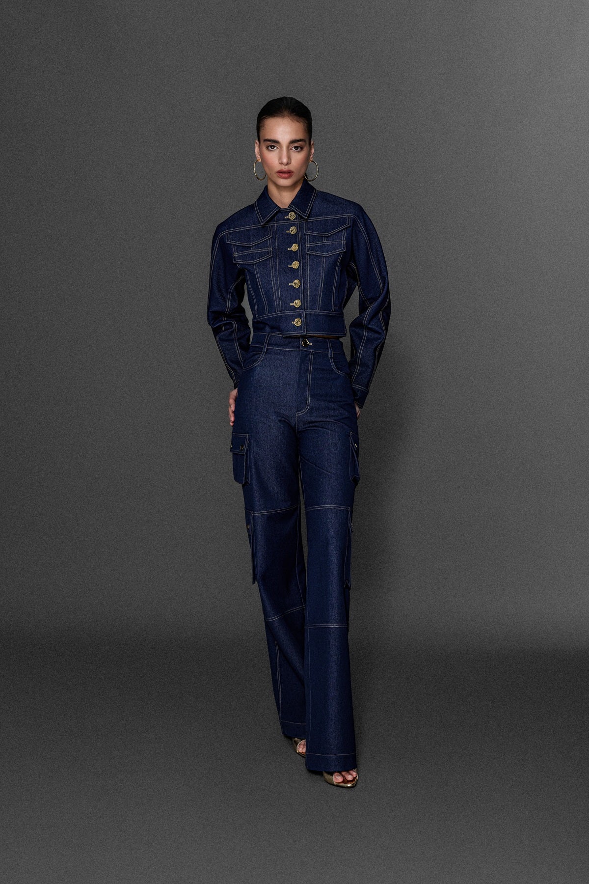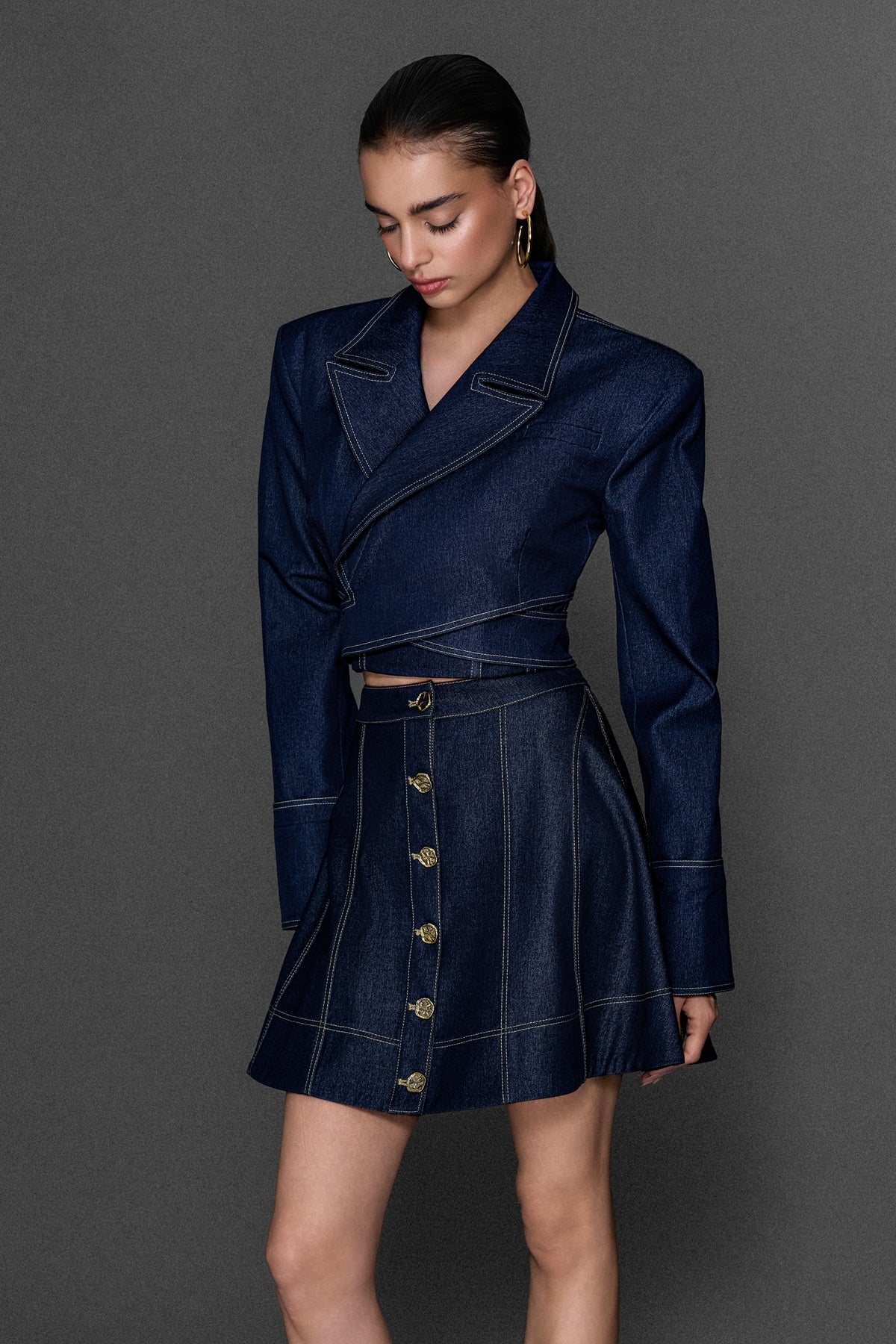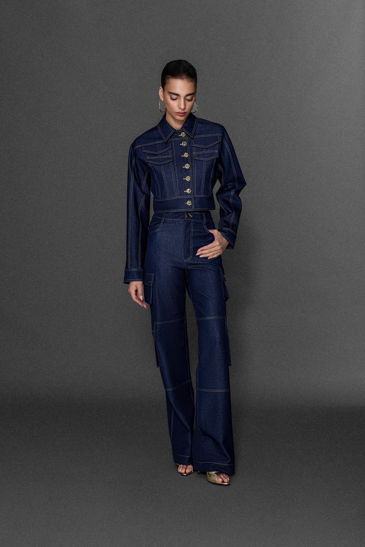 METAL DÜĞME VE DİKİŞ DETAYLI CROP KOT CEKET JEAN