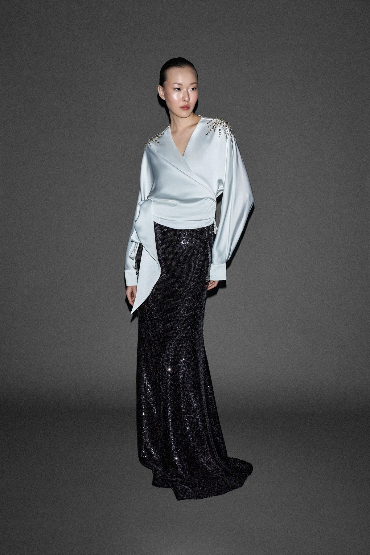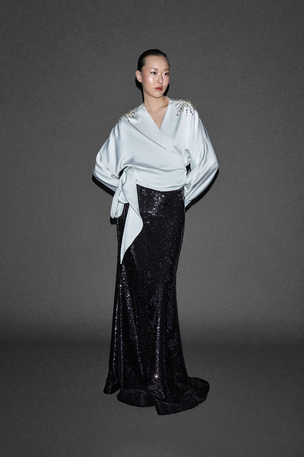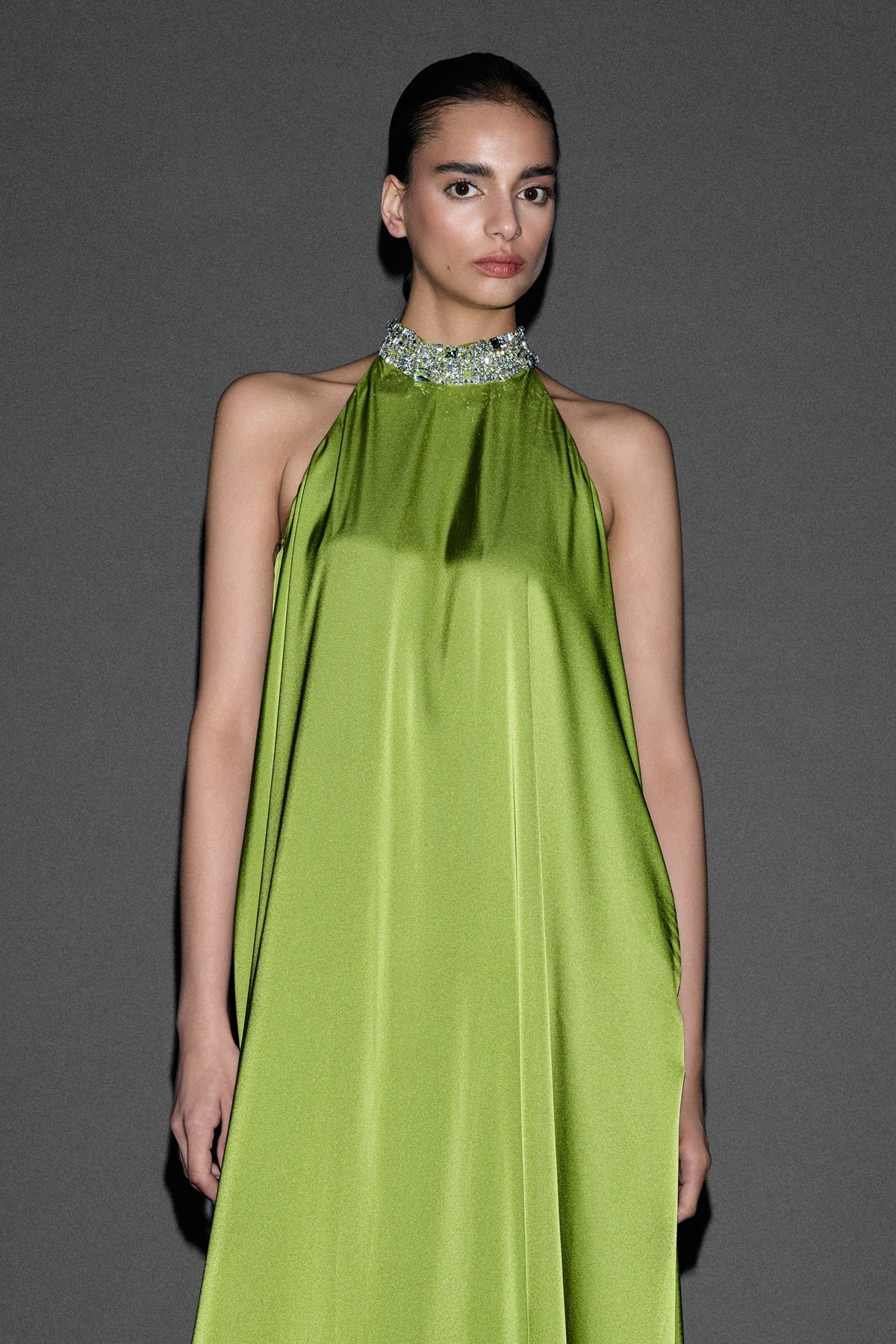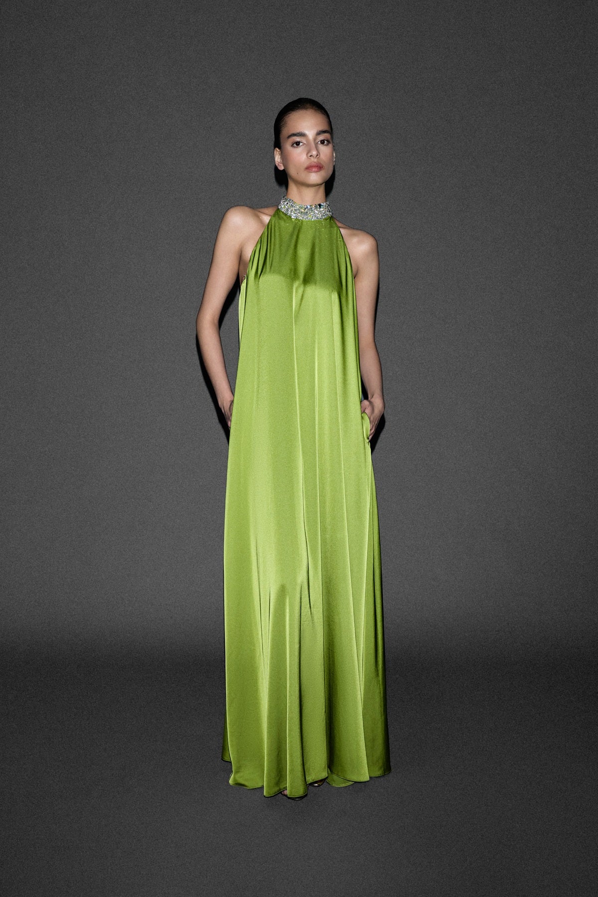 BOYUNDAN BAĞLAMALI TAŞ İŞLİ BOL KESİM UZUN SATEN ELBİSE YEŞİL