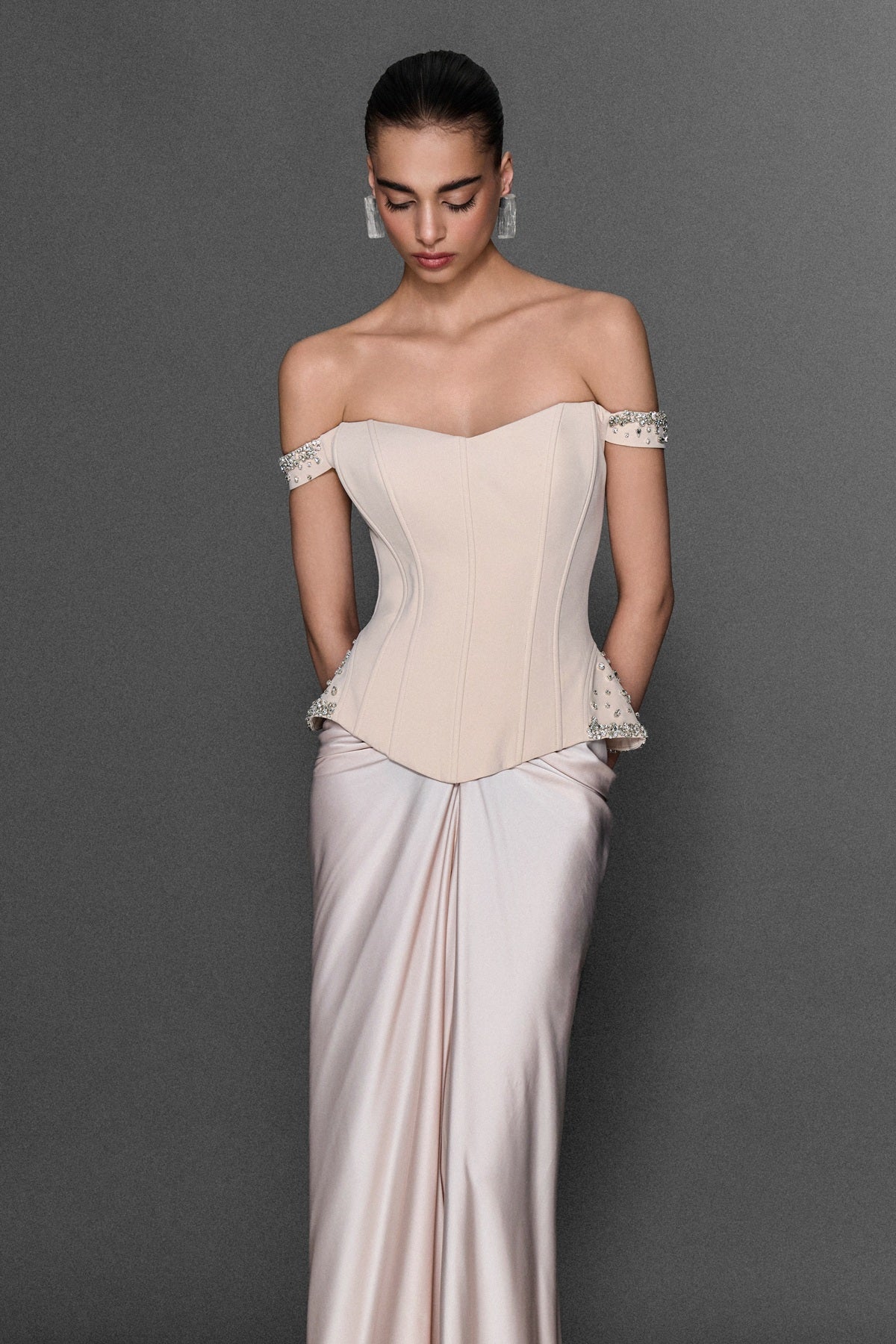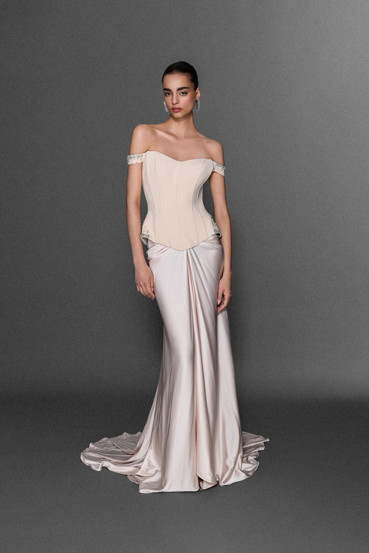 DÜŞÜK OMUZLU GEPİYERİNDE İŞLEME DETAYLI YIRTMAÇLI ELBİSE PUDRA