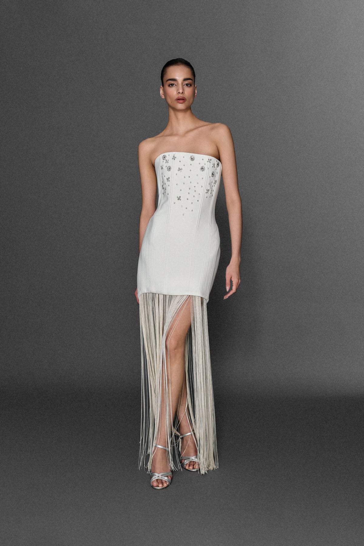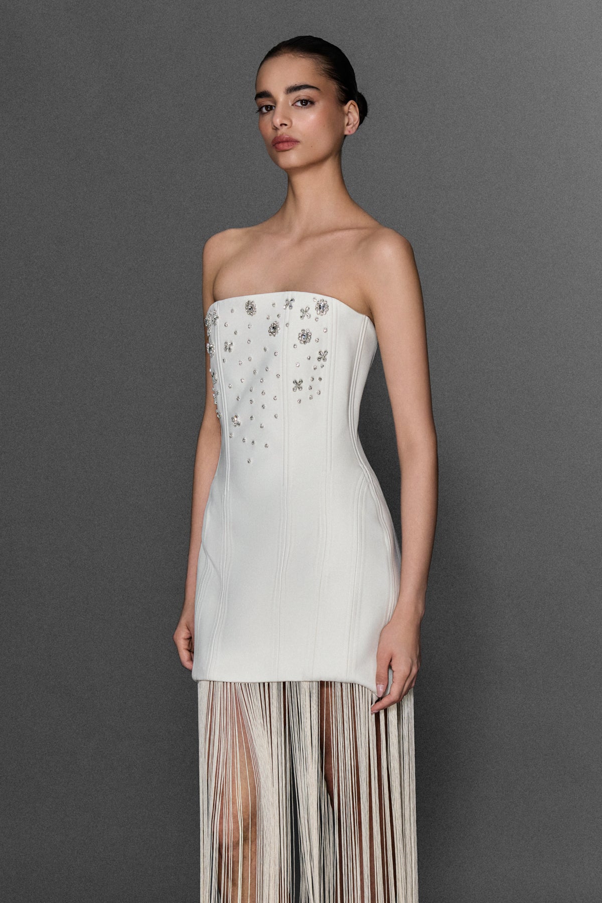 STRAPLEZ YAKALI BALENLİ İŞLEMELİ ETEKTEN PÜSKÜLLÜ KISA KREP ELBİSE EKRU
