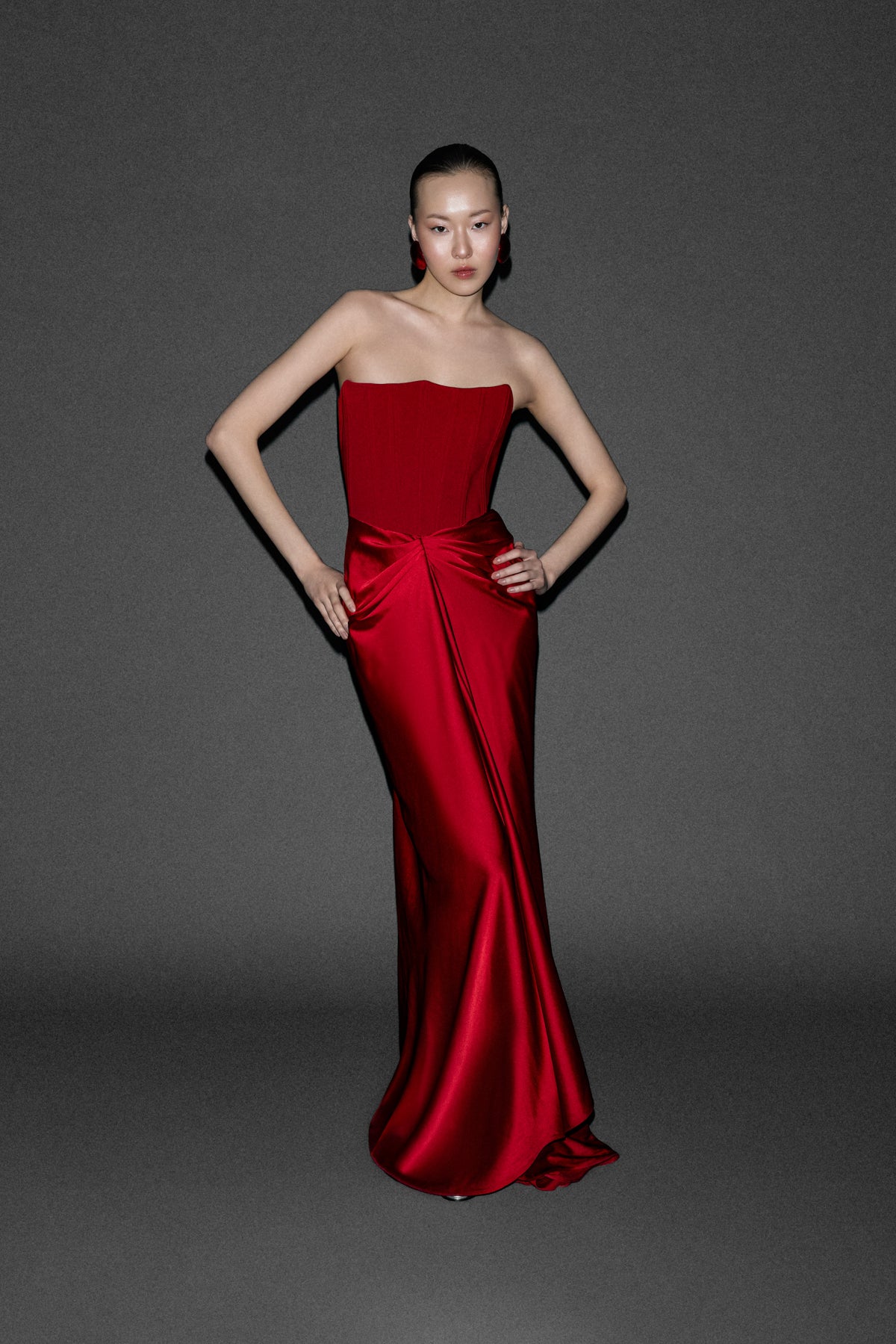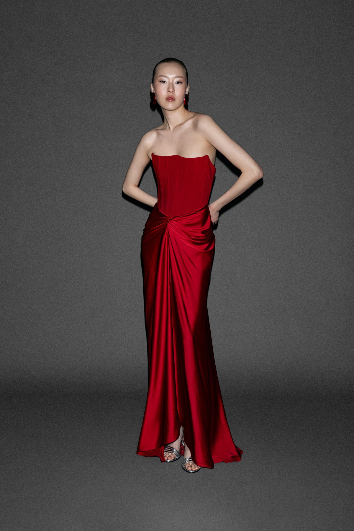 STRAPLEZ KUPLU BELE OTURAN KREP KUMAŞTAN GEPİYERLİ ETEĞİ SATEN ŞİFON UZUN ELBİSE KIRMIZI