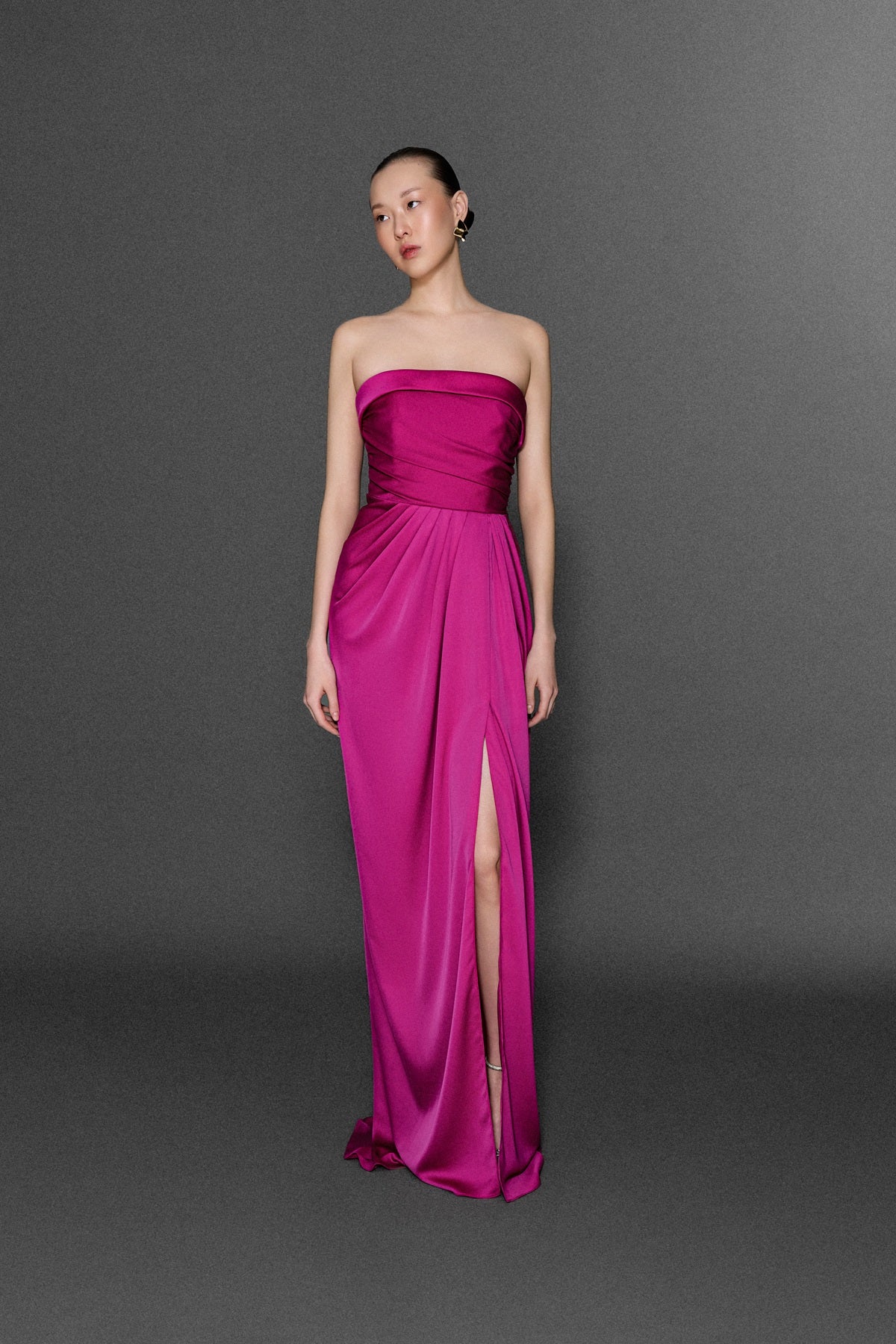 STRAPLEZ YAKALI YANDAN YIRTMAÇLI UZUN KREP ELBİSE FUSIA