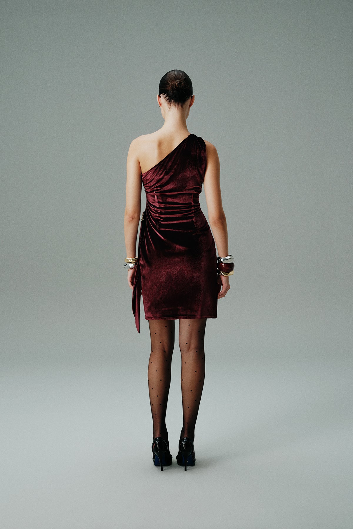TEK OMUZ BELDE TOPLAMA DETAYLI GOLD AKSESUARLI ETEĞİ ANVELOP MİNİ KADİFE ELBİSE MÜRDÜM