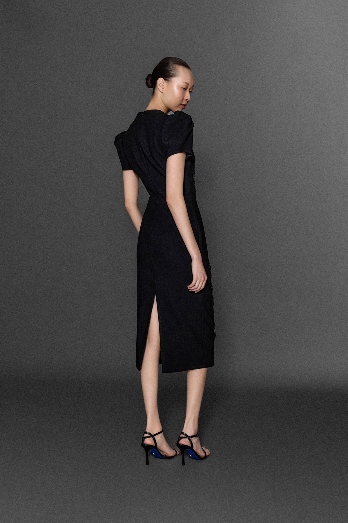 MOTİF İŞLEME DETAYLI BEDENE OTURAN MİDİ BOY ELBİSE SİYAH