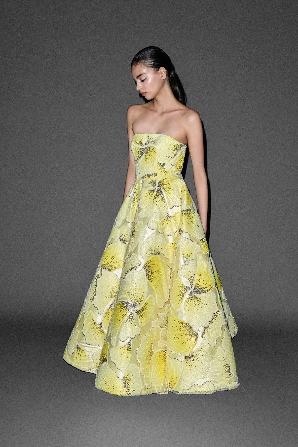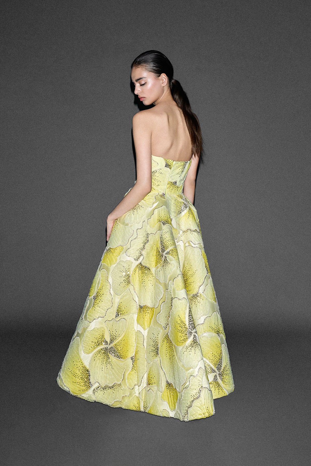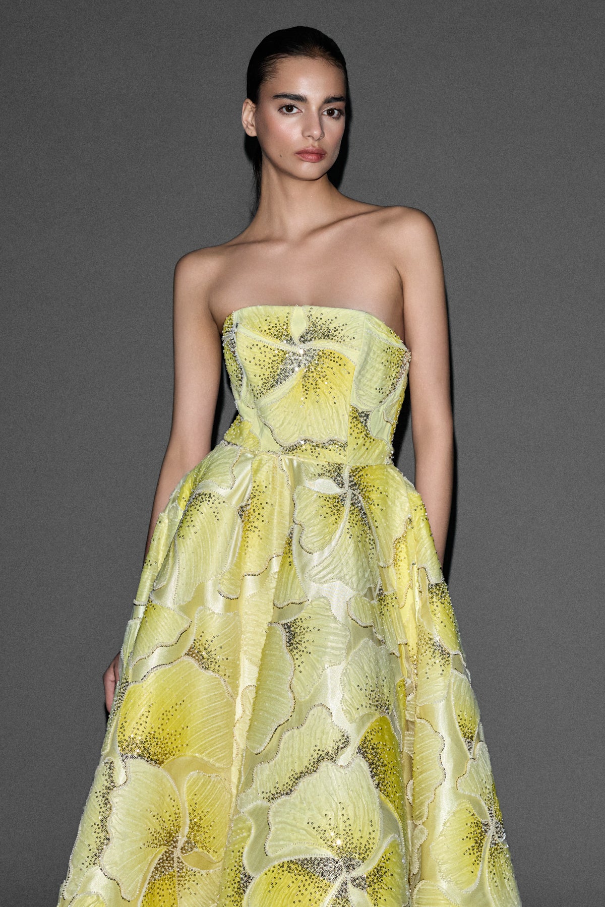 STRAPLEZ YAKALI DAİRE KLOŞ ETEKLİ UZUN İŞLEMELİ TÜL ELBİSE SARI