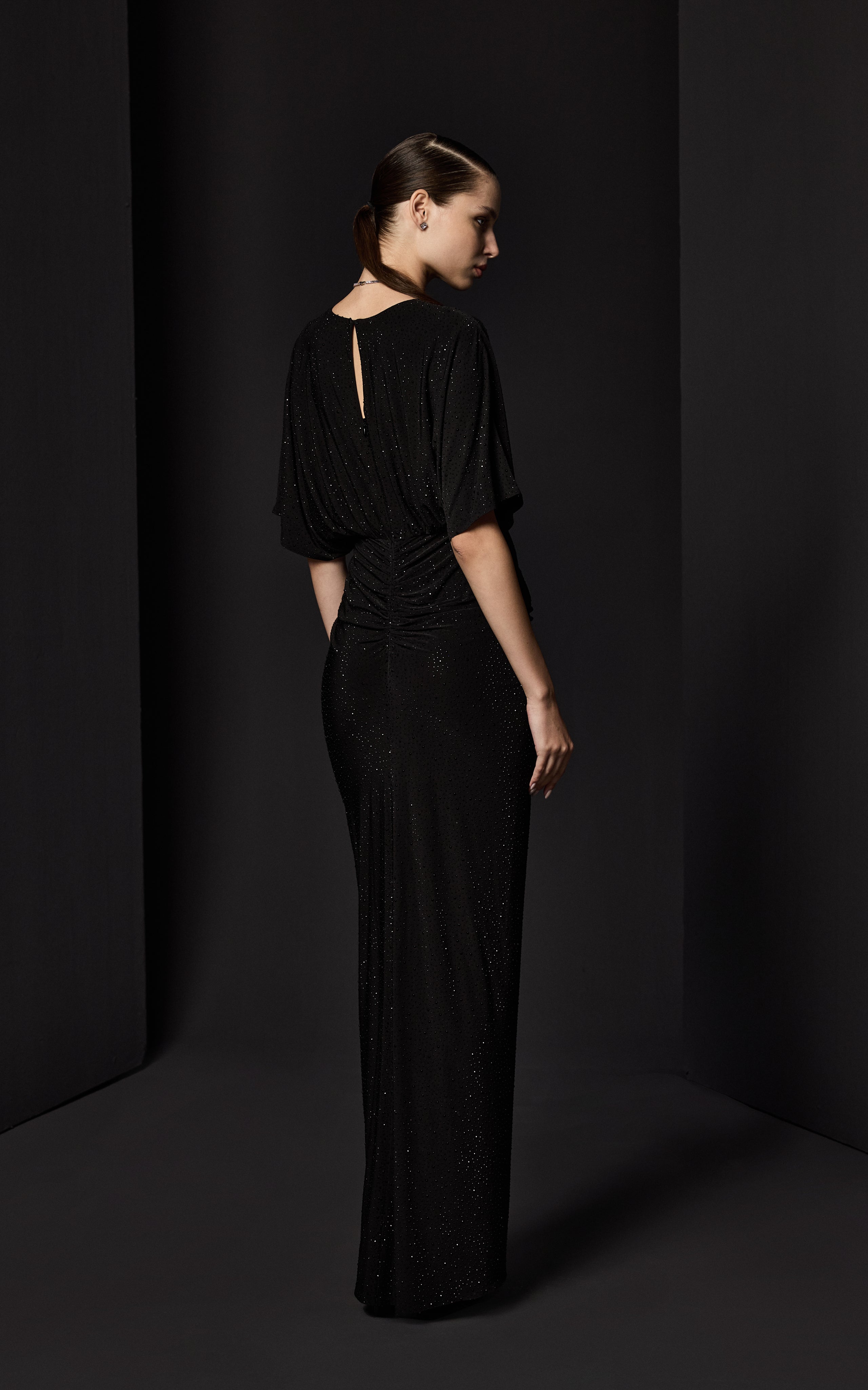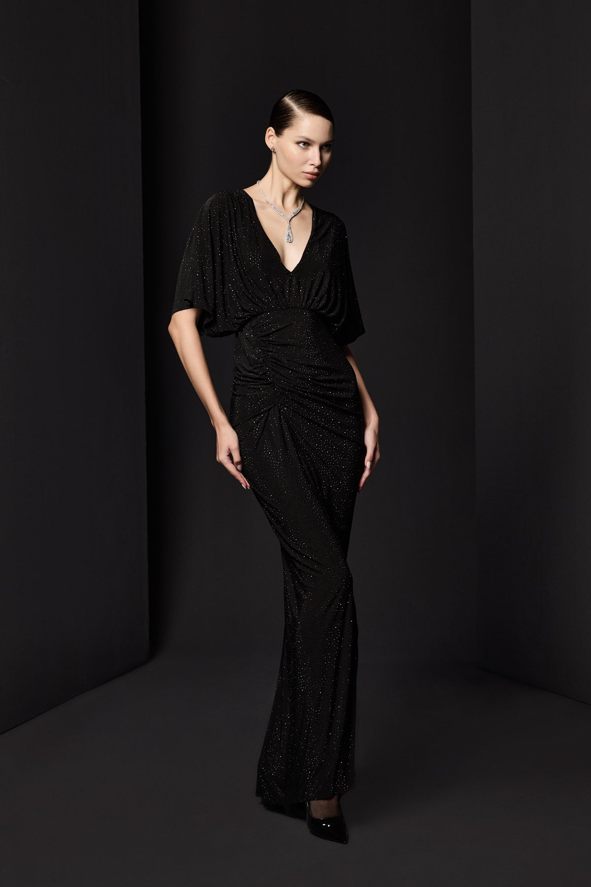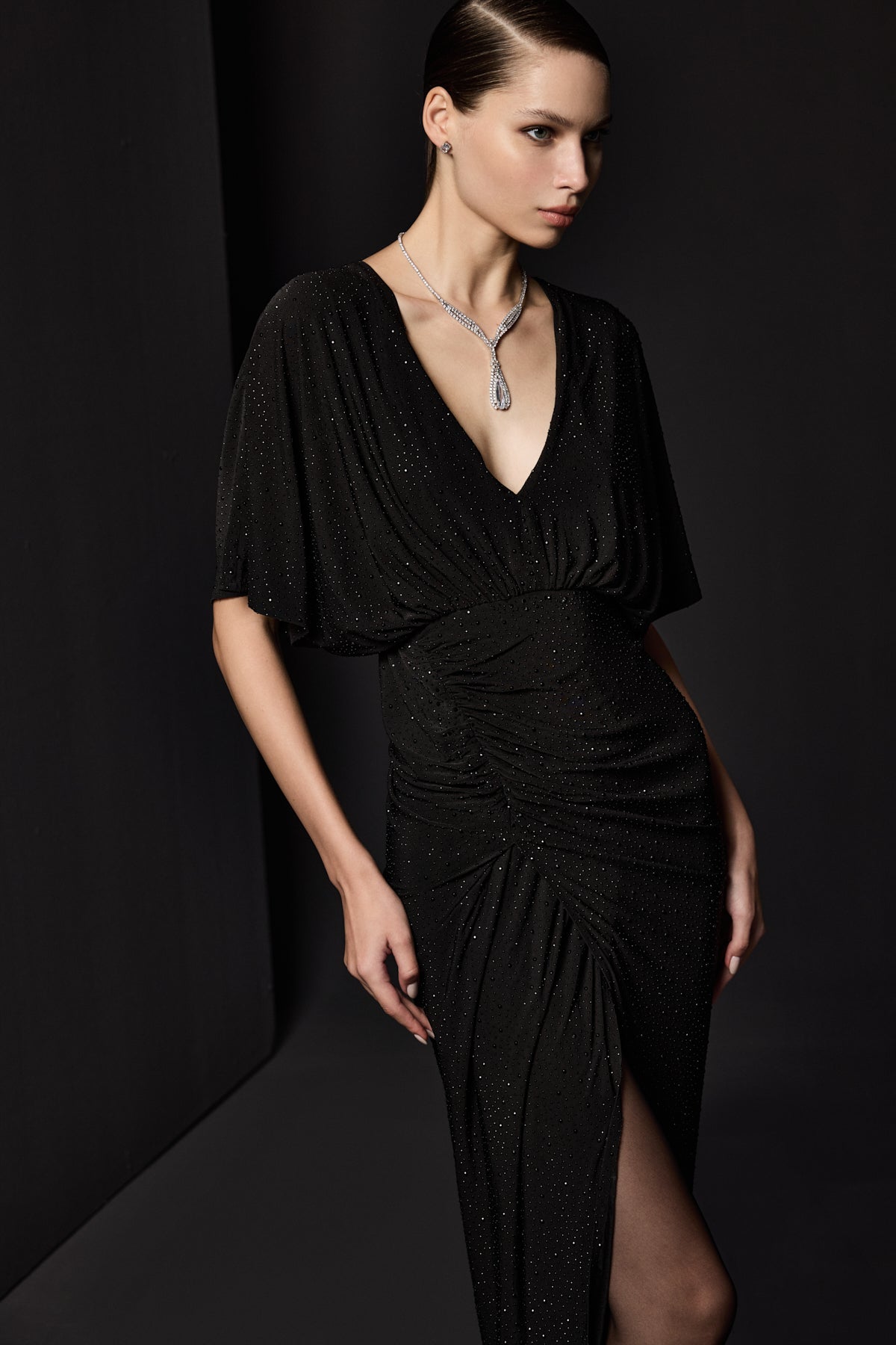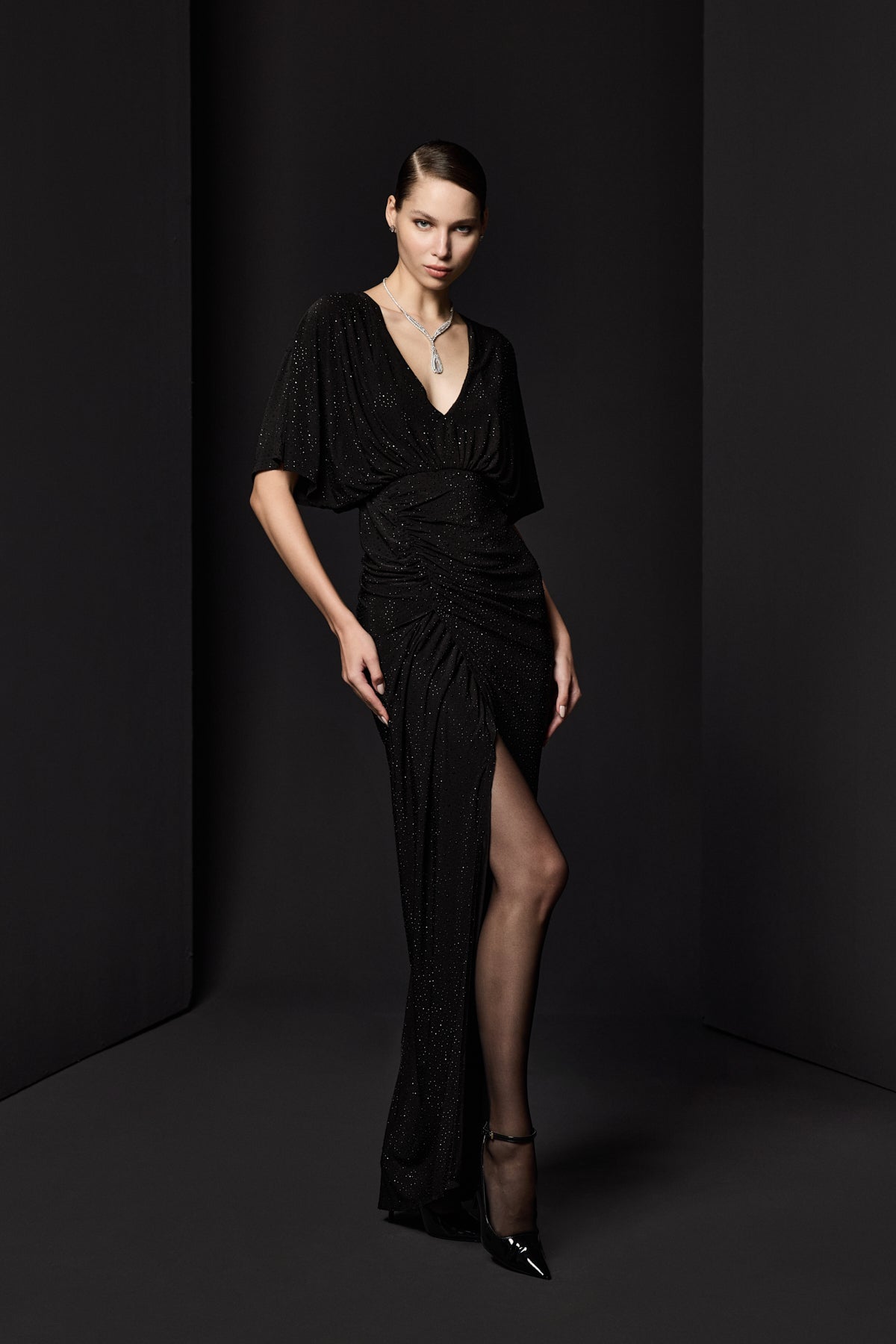BÜZGÜ DETAYLI DERİN YIRTMAÇLI PARILTILI JARSE SİYAH