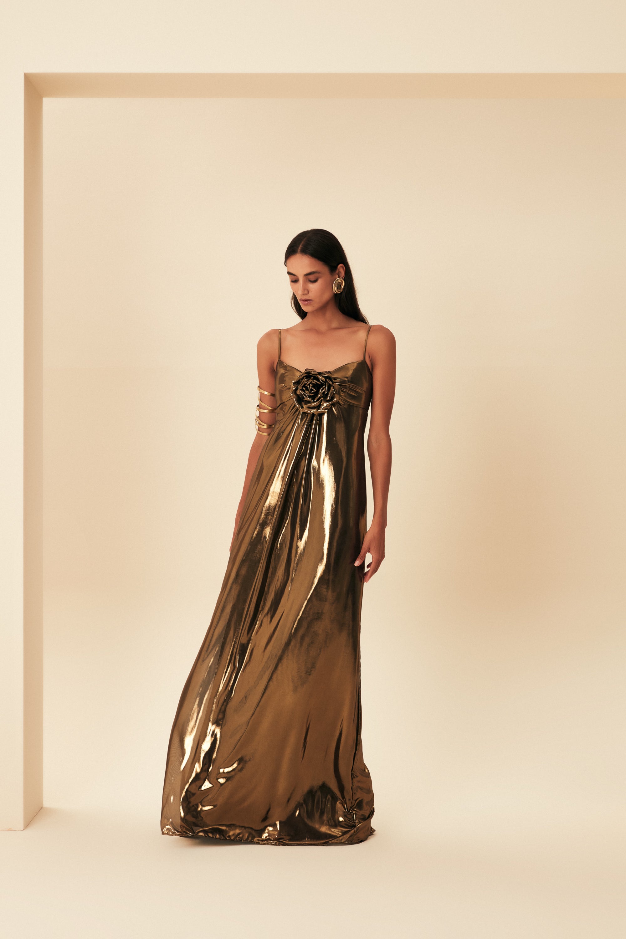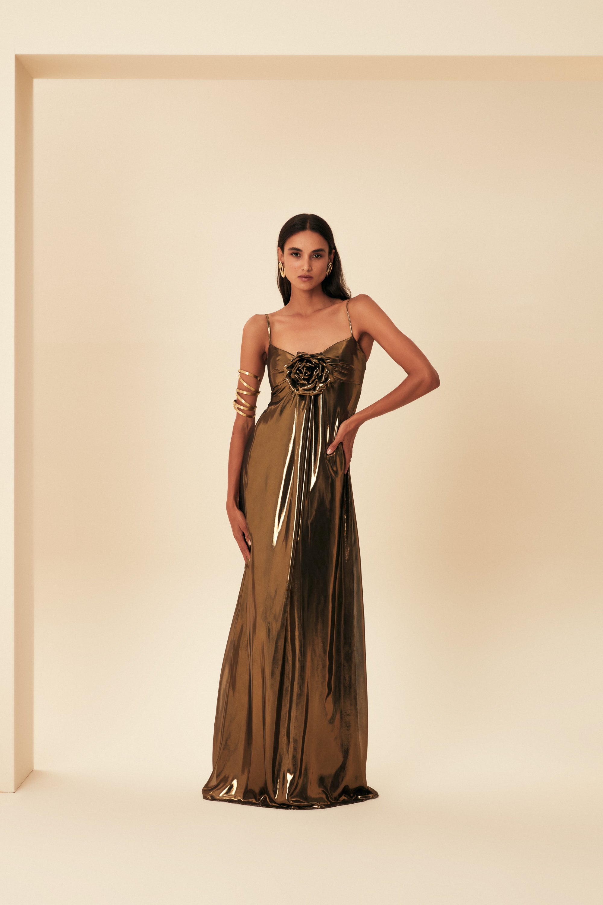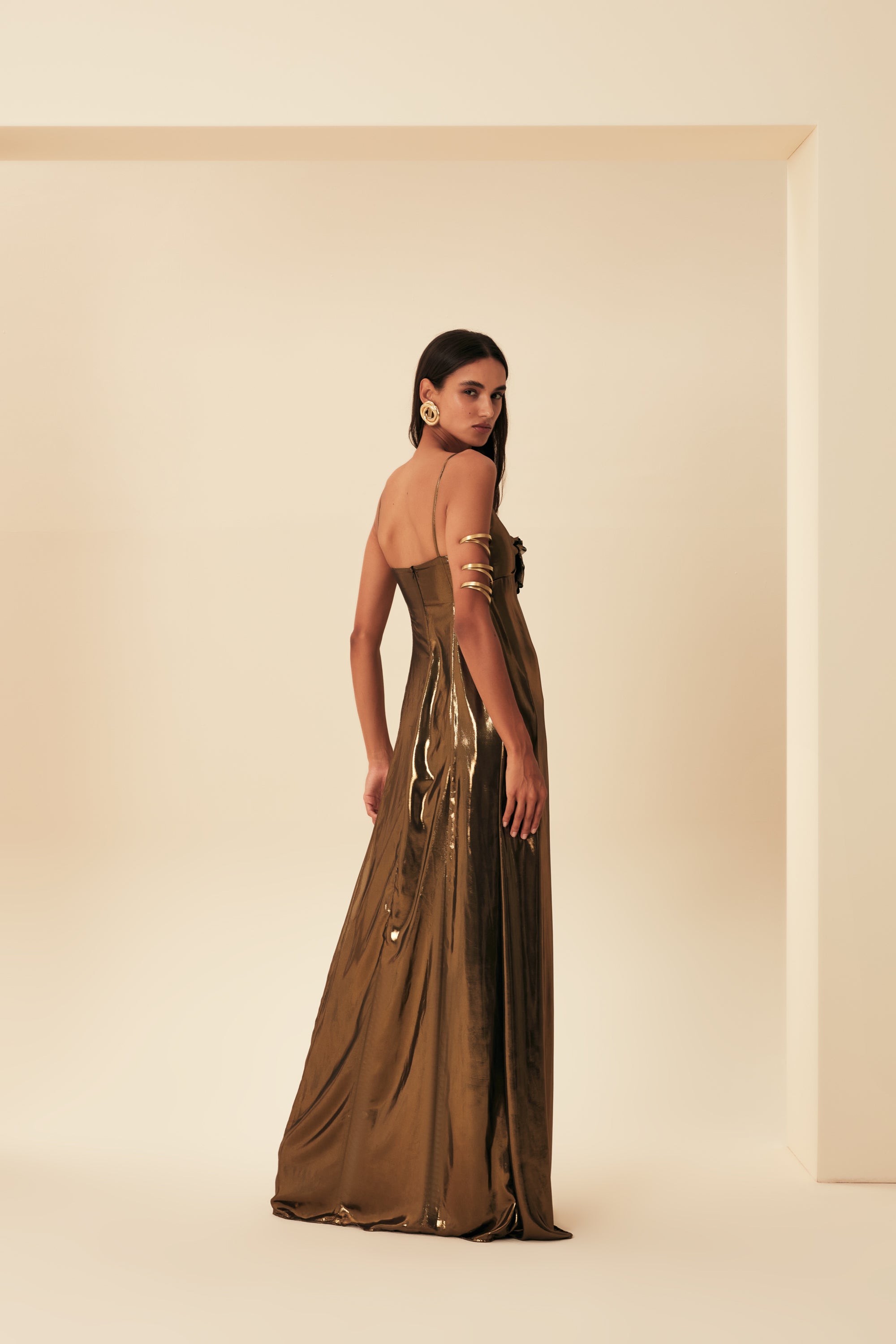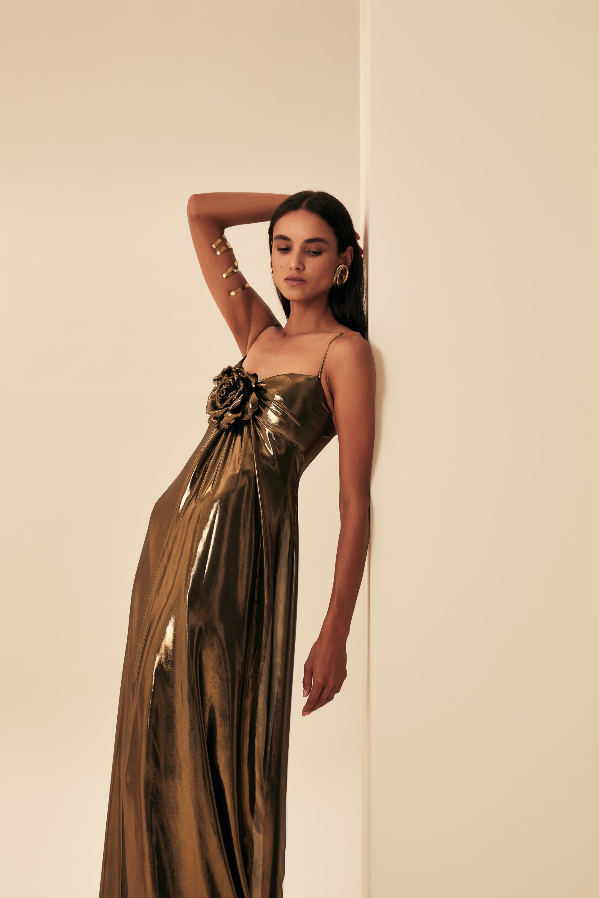 PARLAK KUMAŞ ÇİÇEK DETAYLI STRAPLEZ ABİYE GOLD