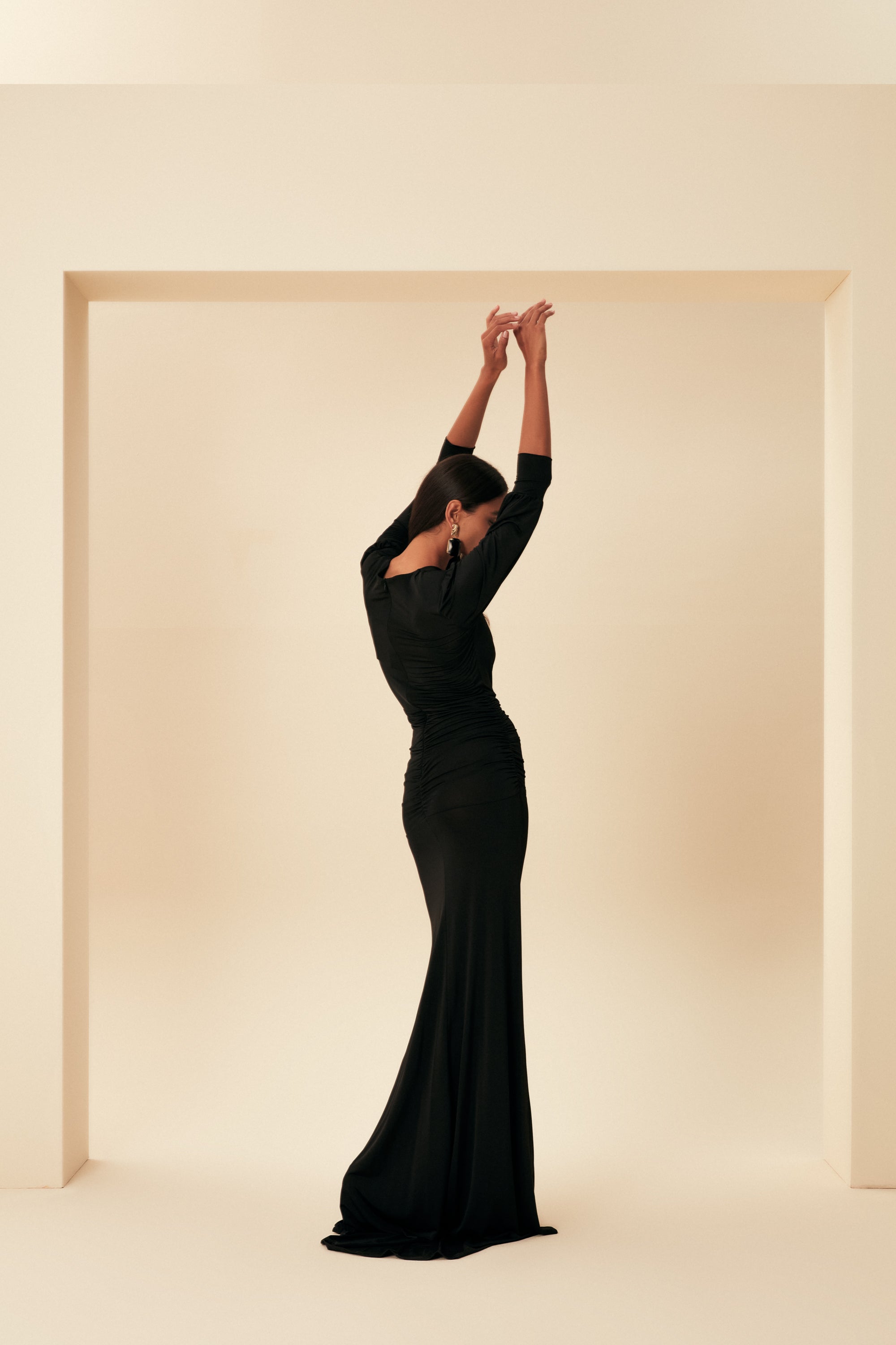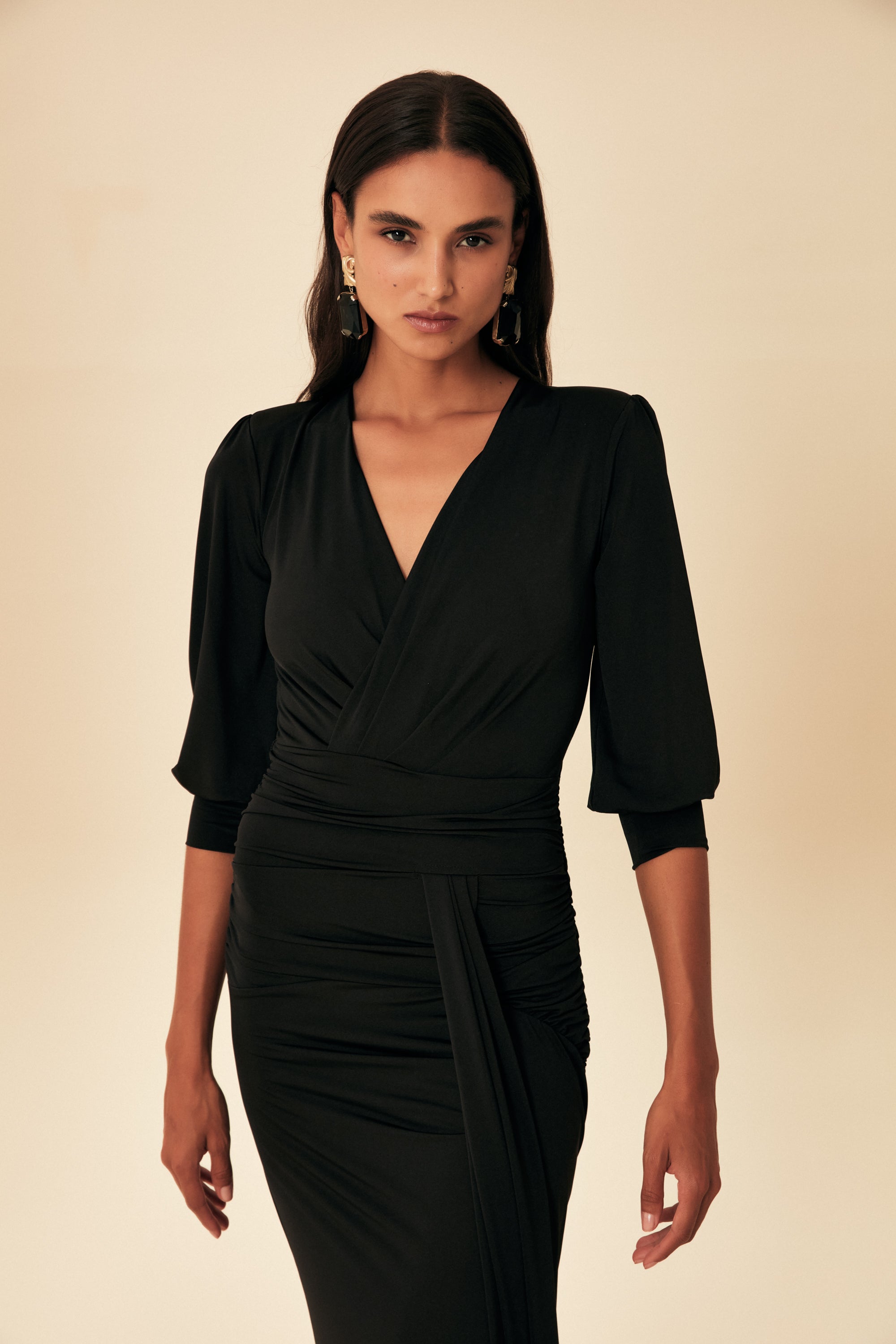 UZUN KOLLU BELİ VE GÖĞÜSÜ DRAPELİ V YAKA UZUN ELBİSE SİYAH