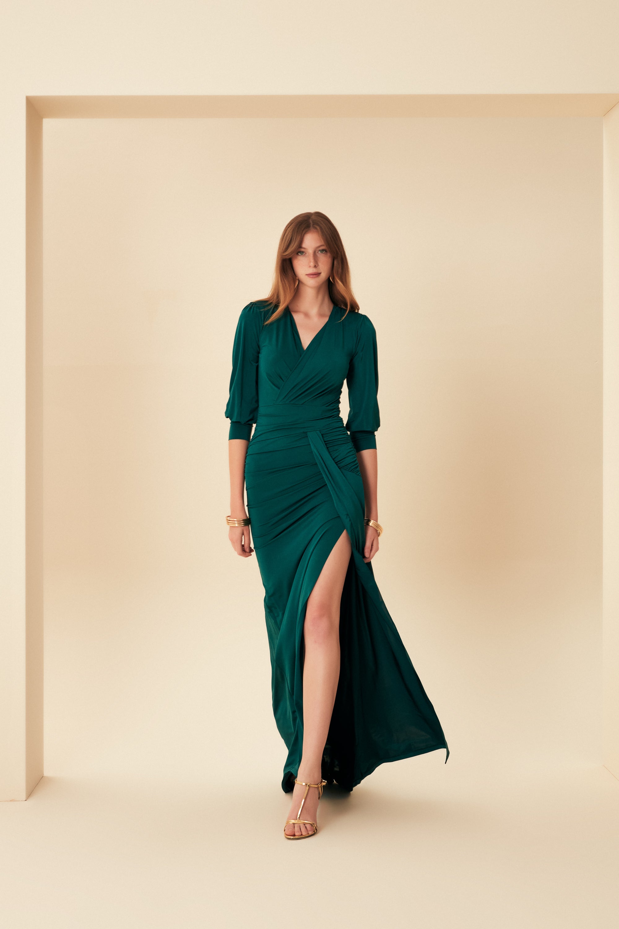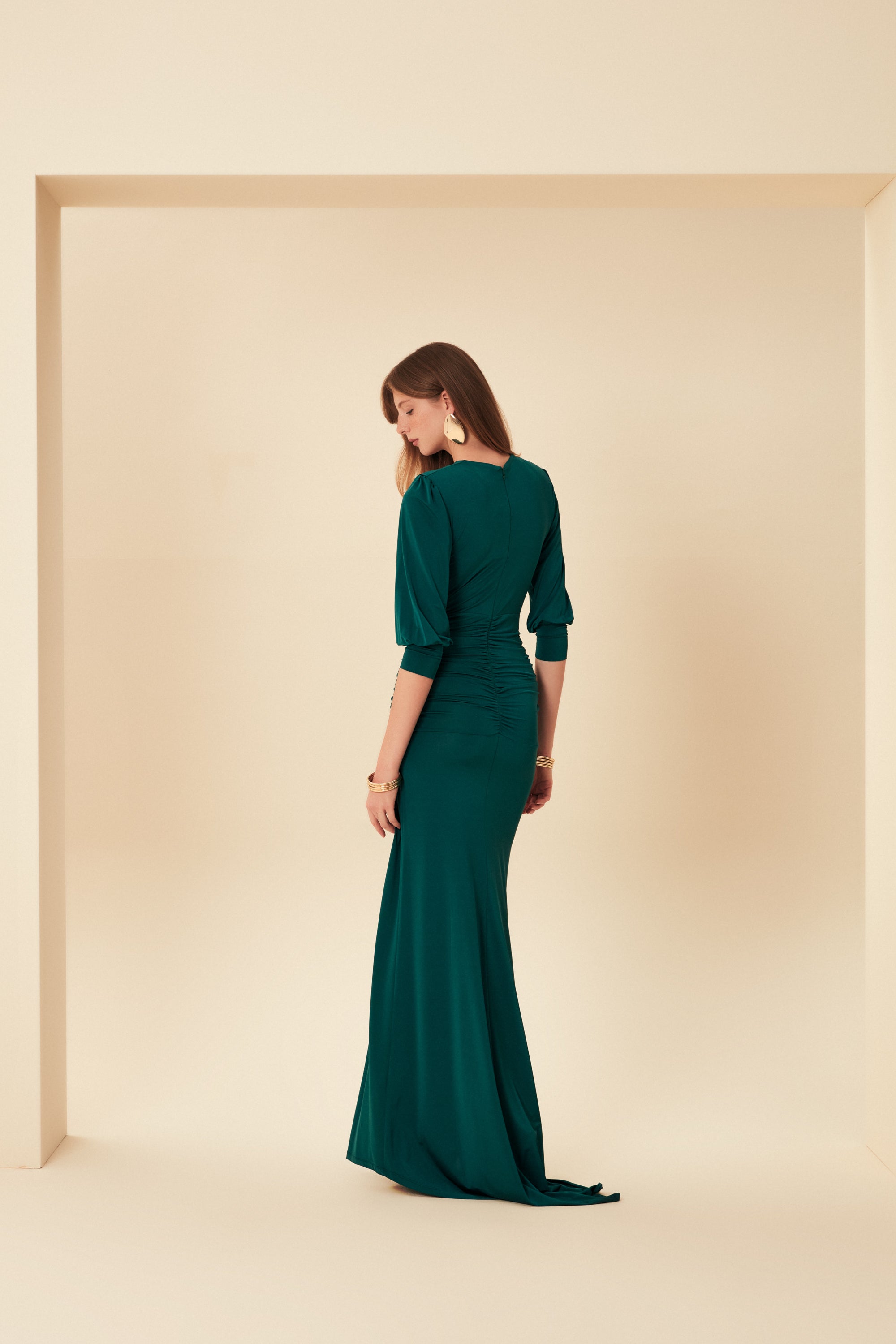 UZUN KOLLU BELİ VE GÖĞÜSÜ DRAPELİ V YAKA UZUN ELBİSE ZÜMRÜT YEŞİLİ