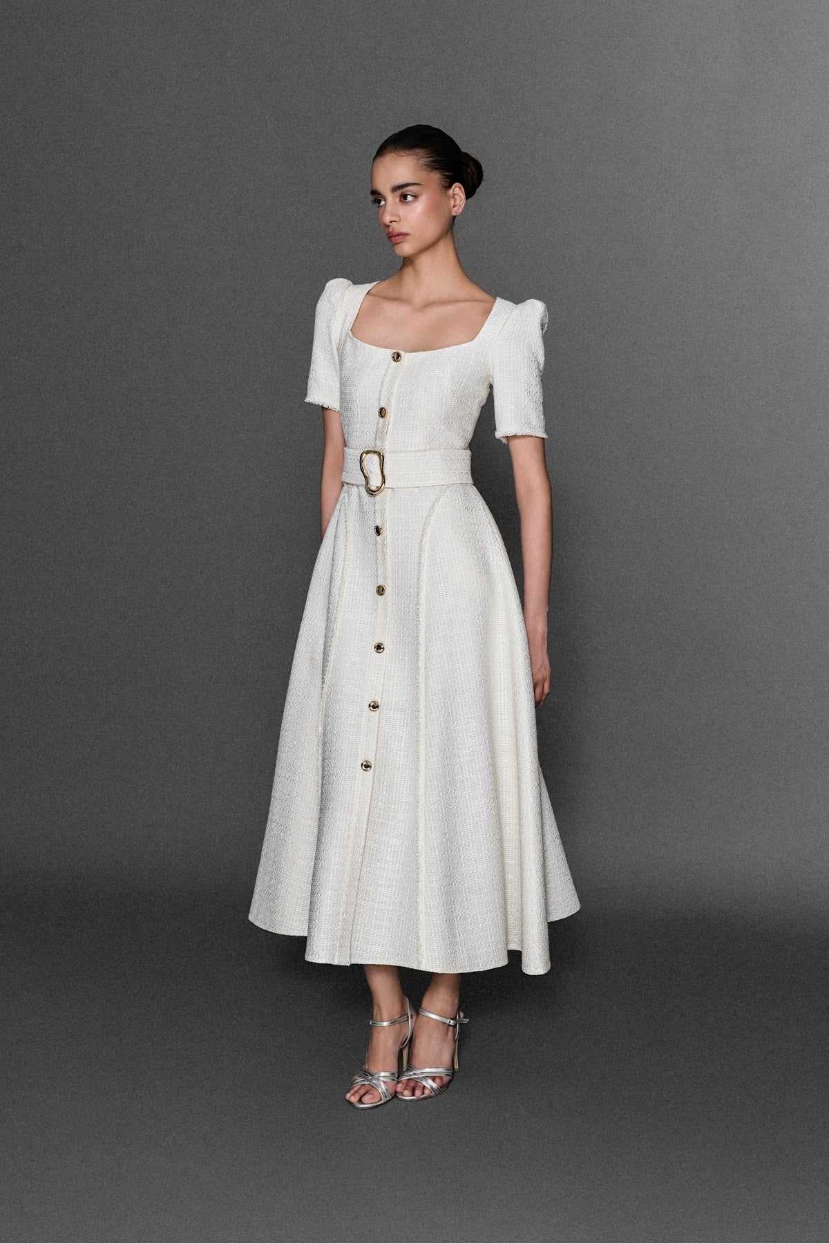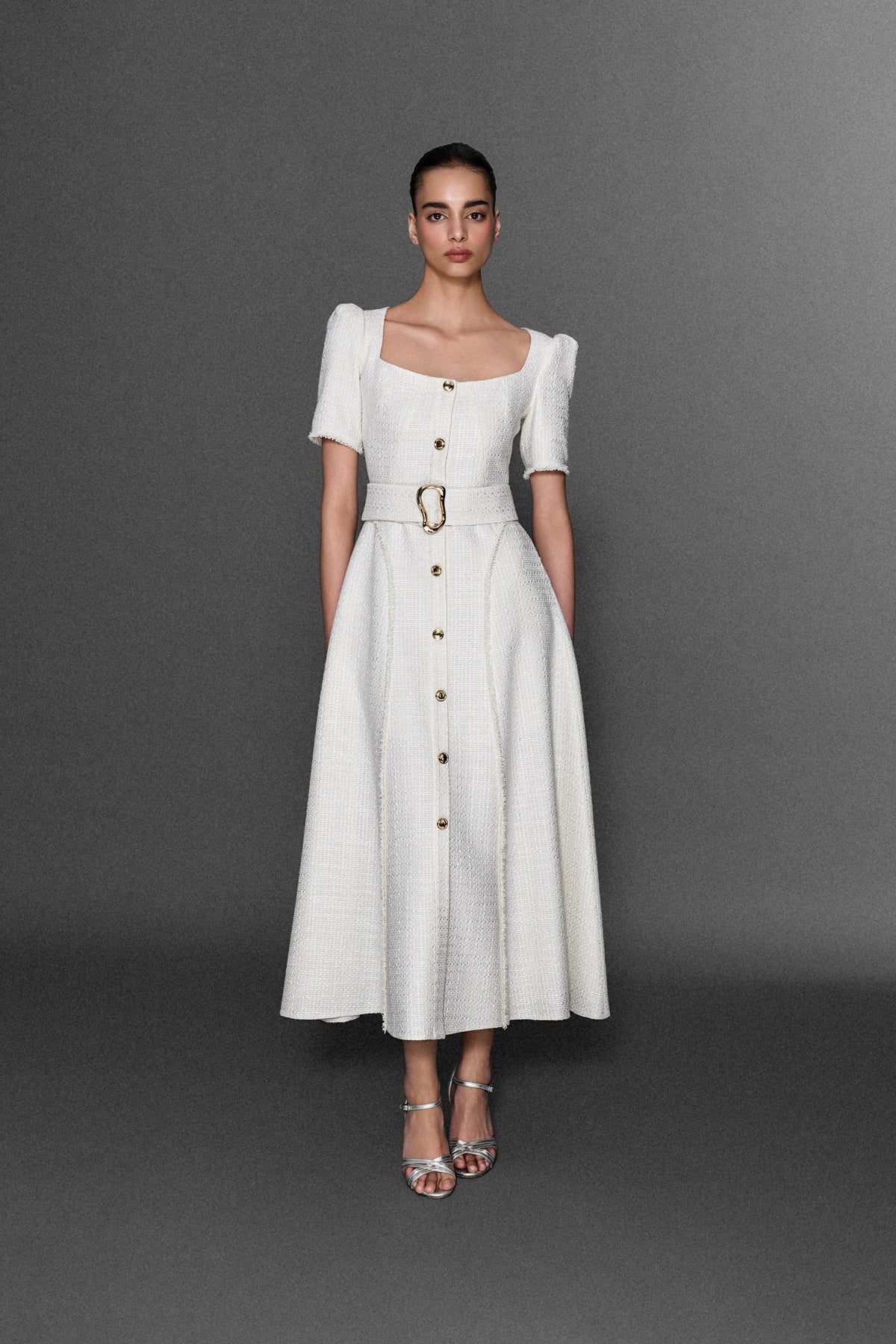 GOLD AKSESUAR DETAYLI MİDİ BOY TÜVİT ELBİSE EKRU