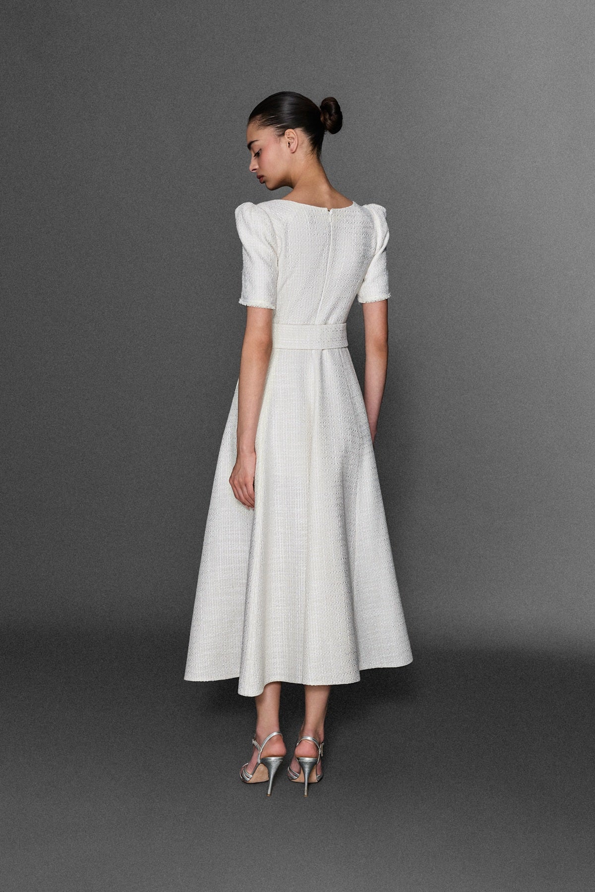 GOLD AKSESUAR DETAYLI MİDİ BOY TÜVİT ELBİSE EKRU