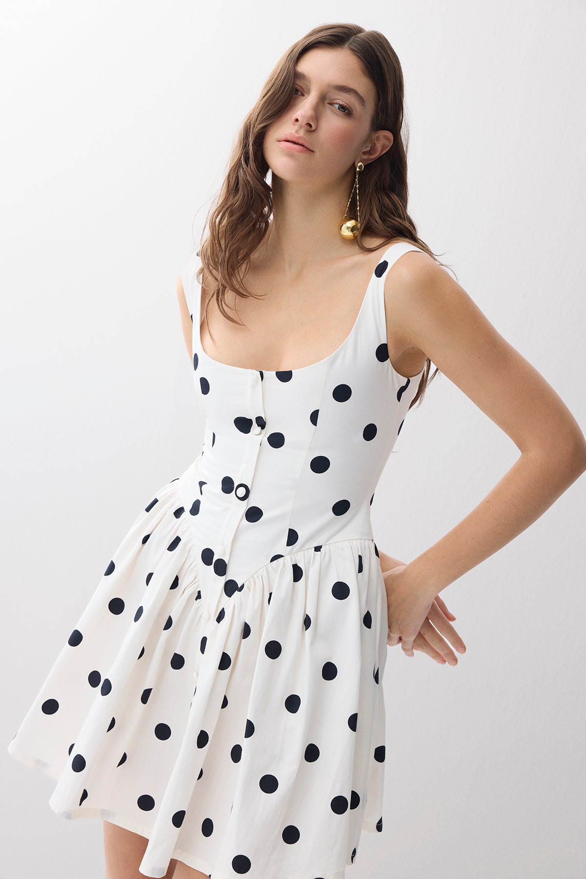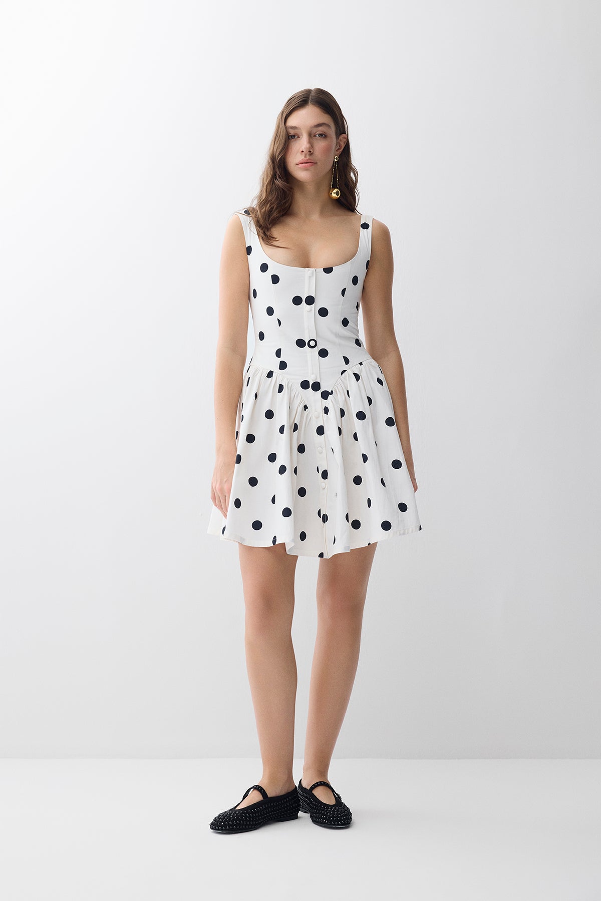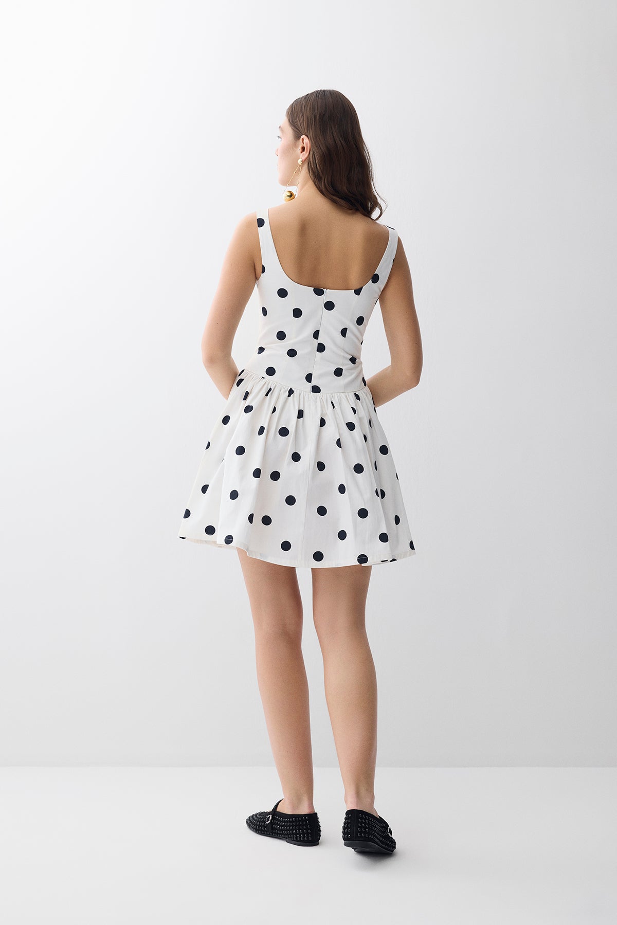 KARE YAKALI BELDEN BÜZGÜLÜ PUANTİYELİ KOTON MİNİ ELBİSE BEYAZ