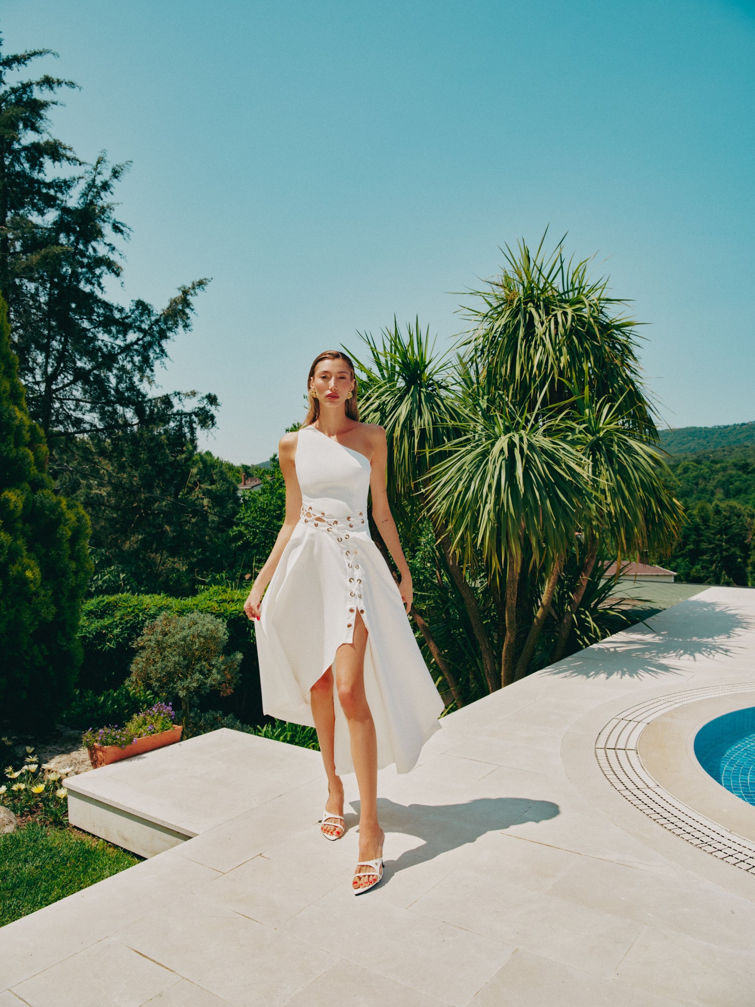 TEK OMUZ BELDEN İP AKSESUAR İLE BAĞLI ASİMETRİK FORMLU KOTON ELBİSE BEYAZ