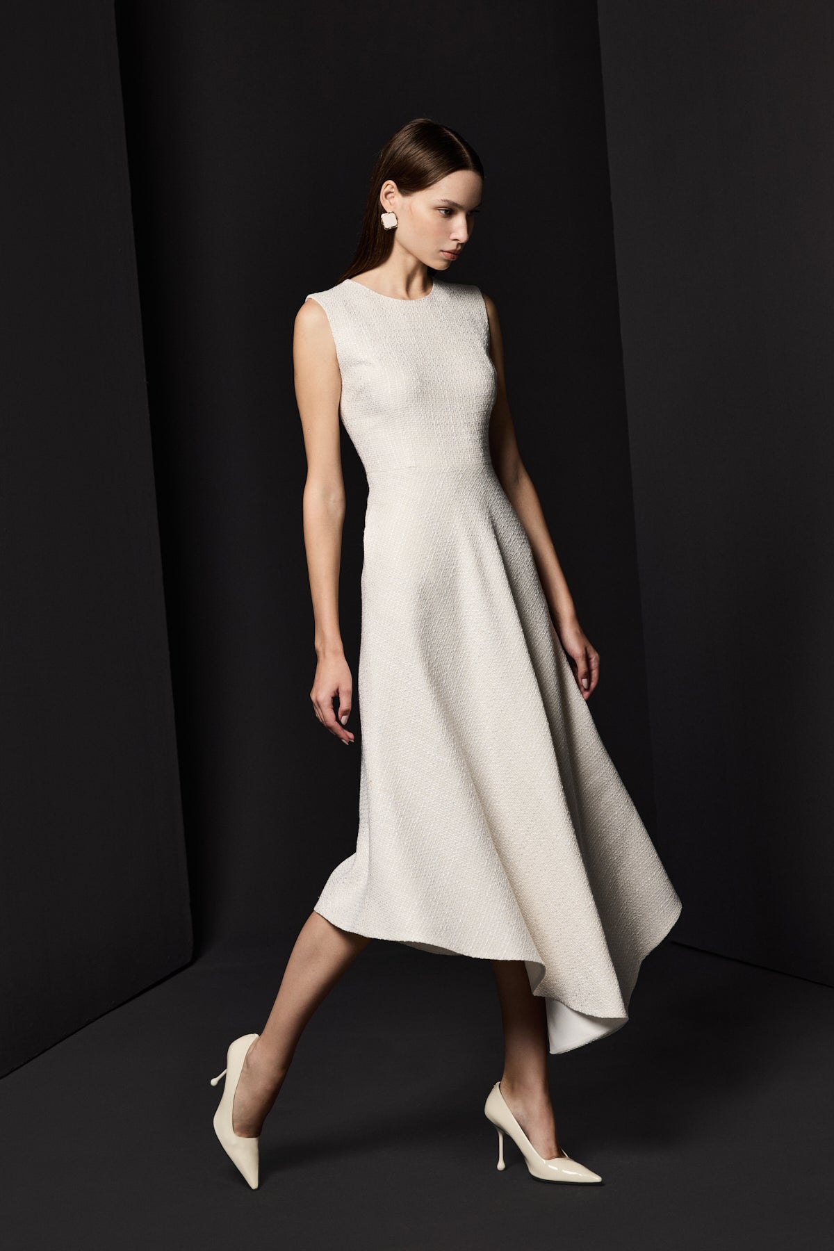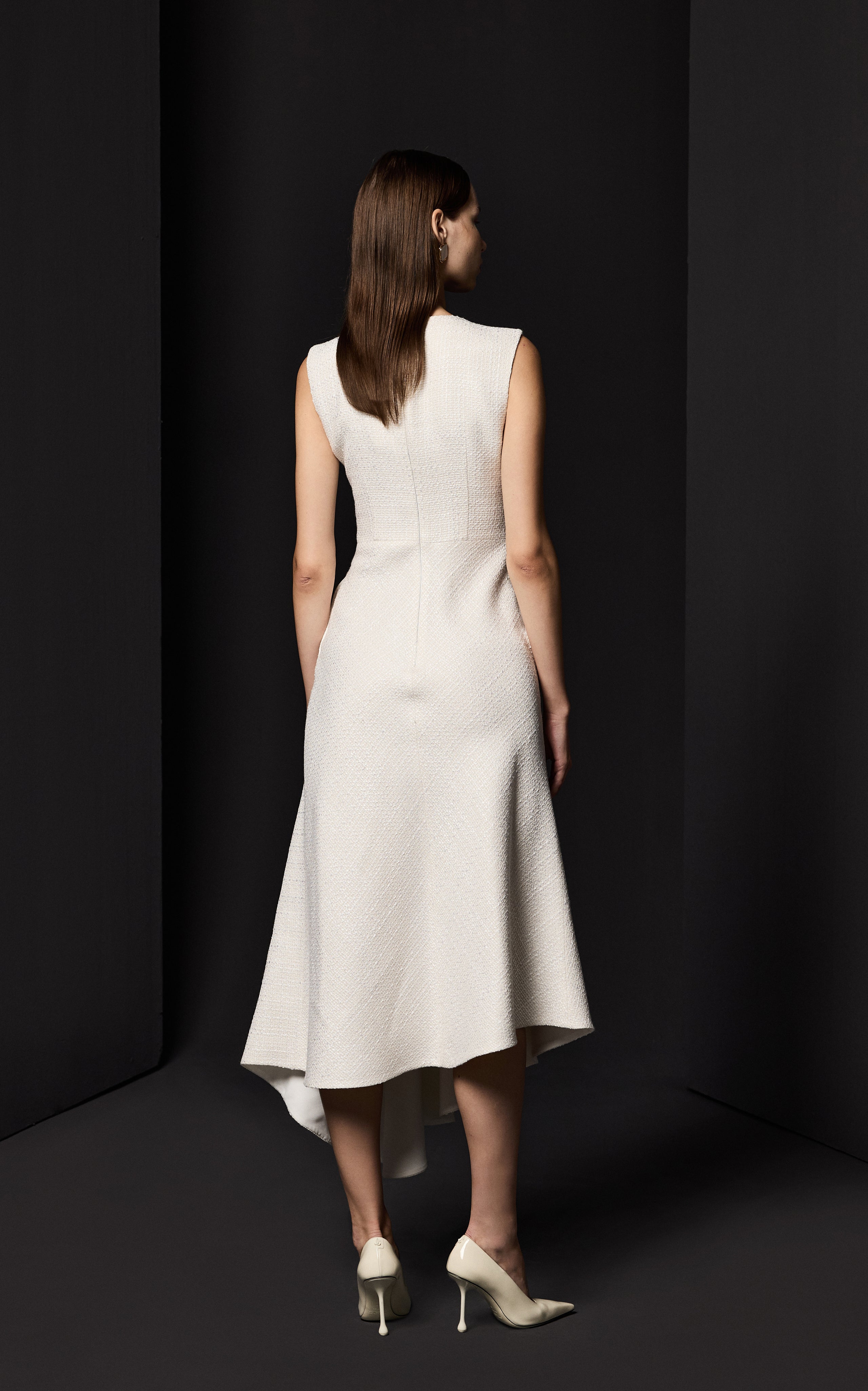 ASİMETRİK ETEK FORMLU MİDİ BOY ELBİSE EKRU