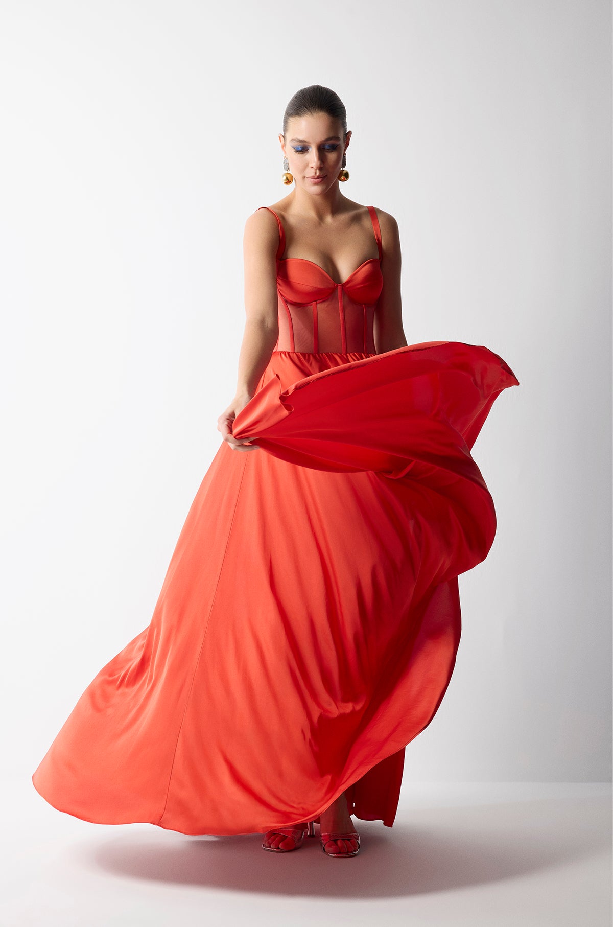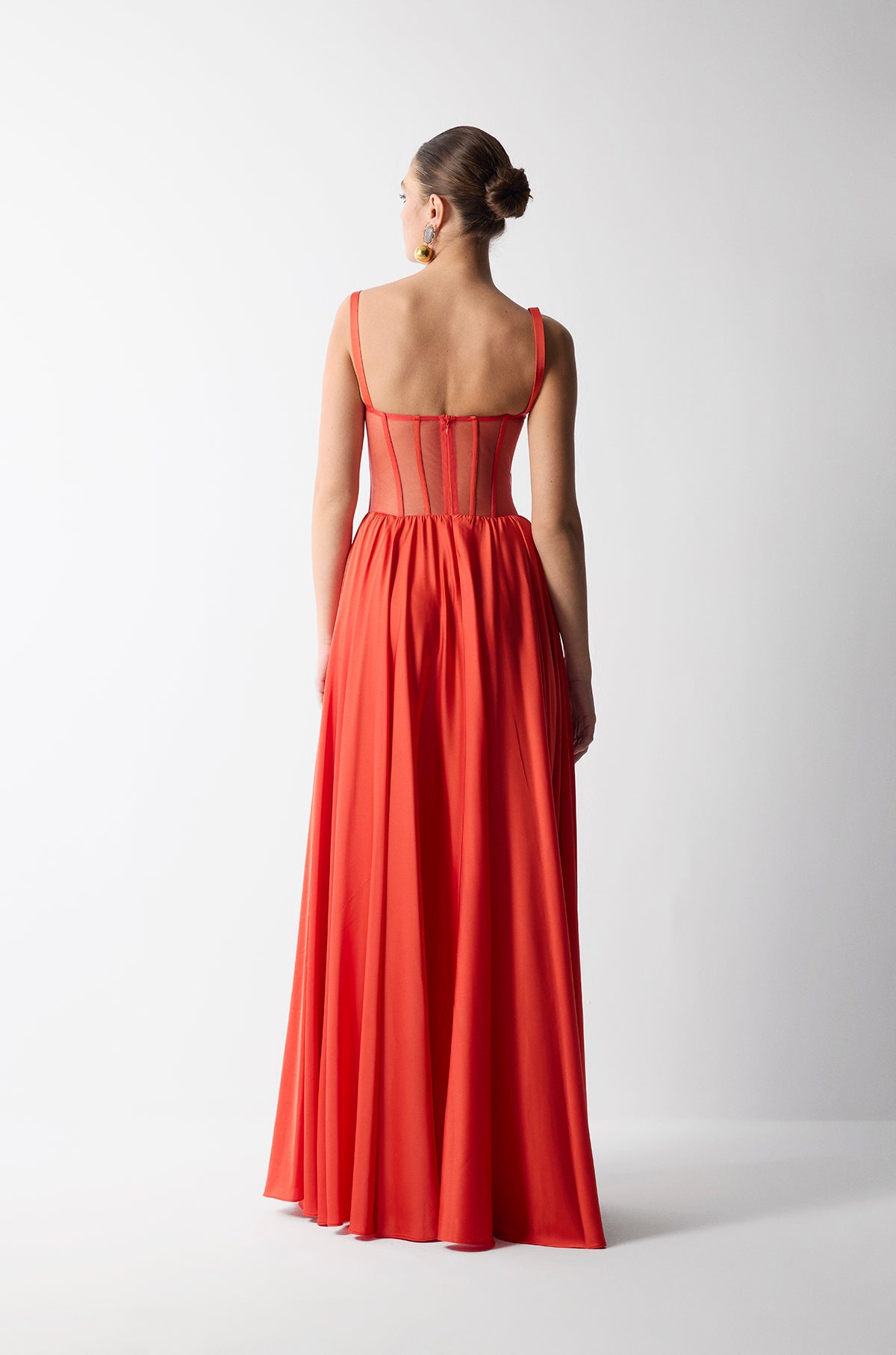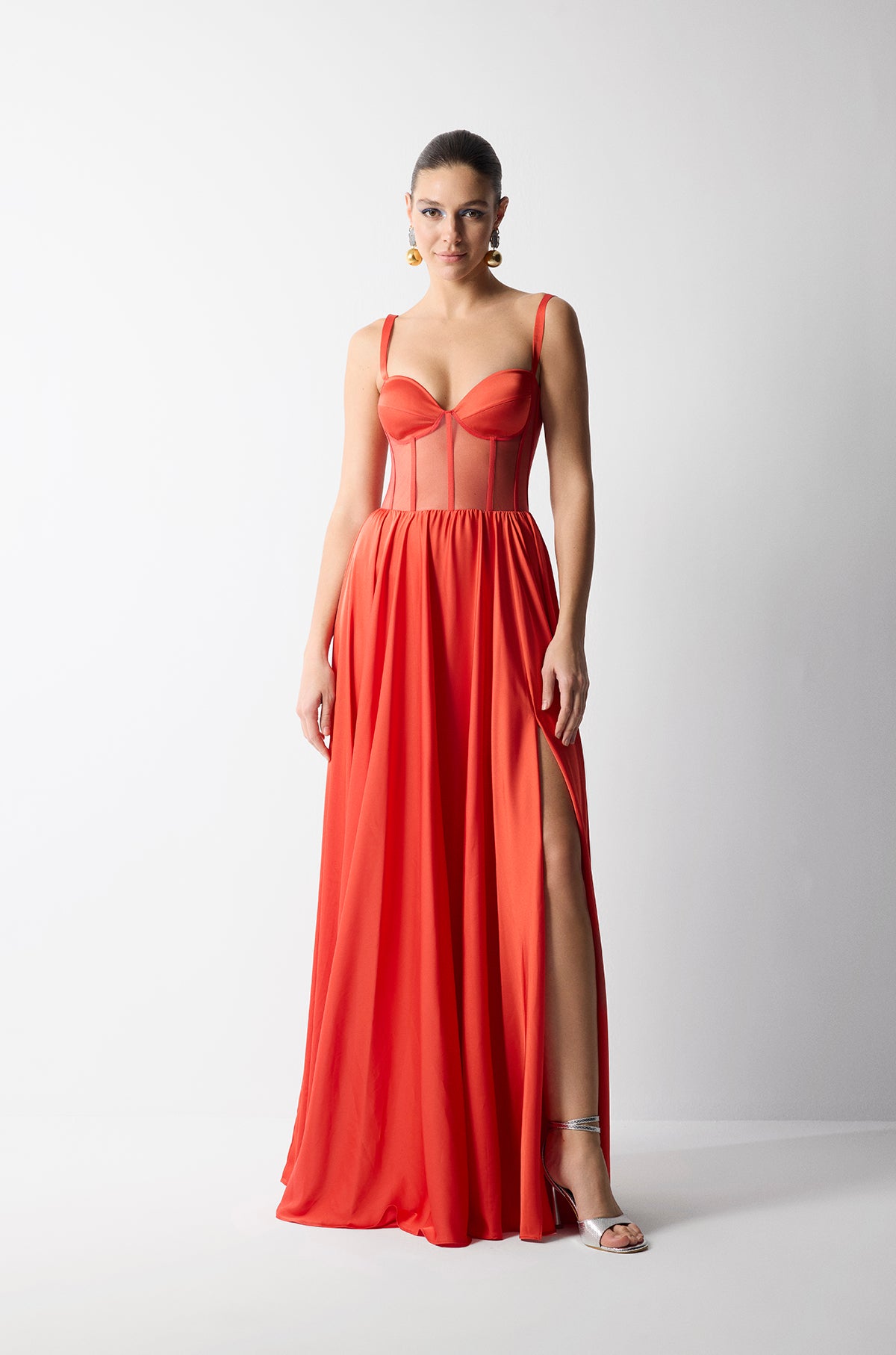 GÖĞÜS KUPLU TRANSPARAN BEDEN DETAYLI ELBİSE MERCAN