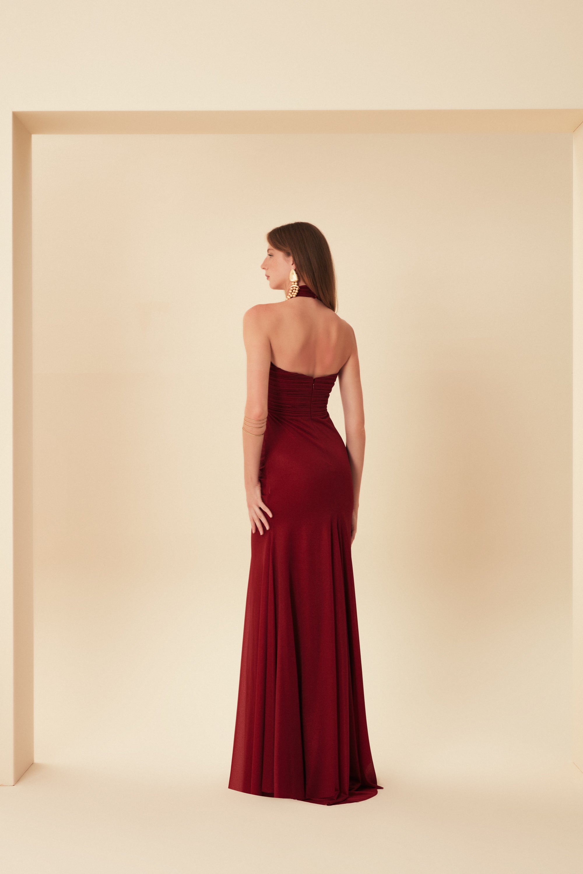SİMLİ KUMAŞ BOYUNDAN BAĞLAMALI VE YIRTMAÇLI ELBİSE KIRMIZI