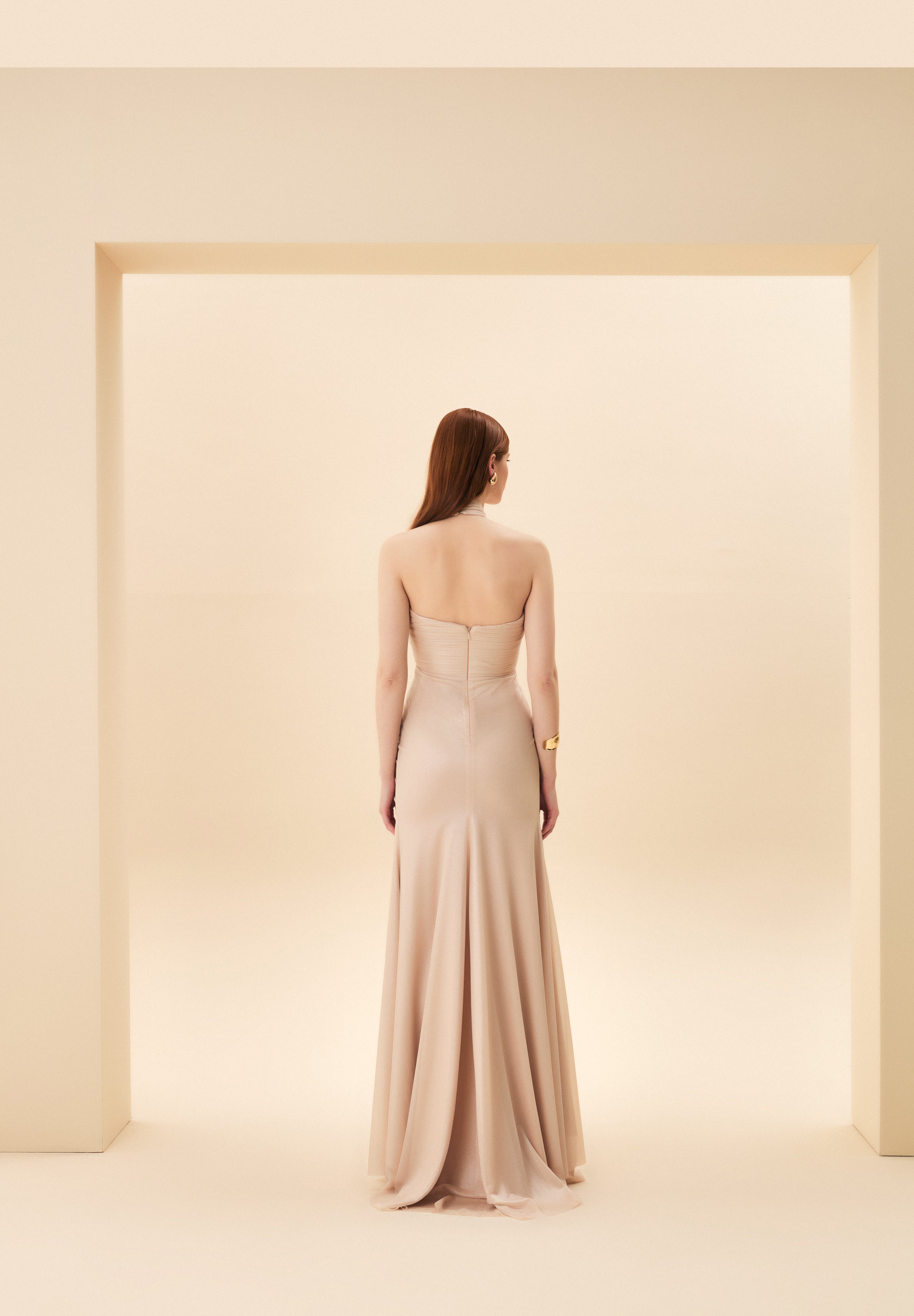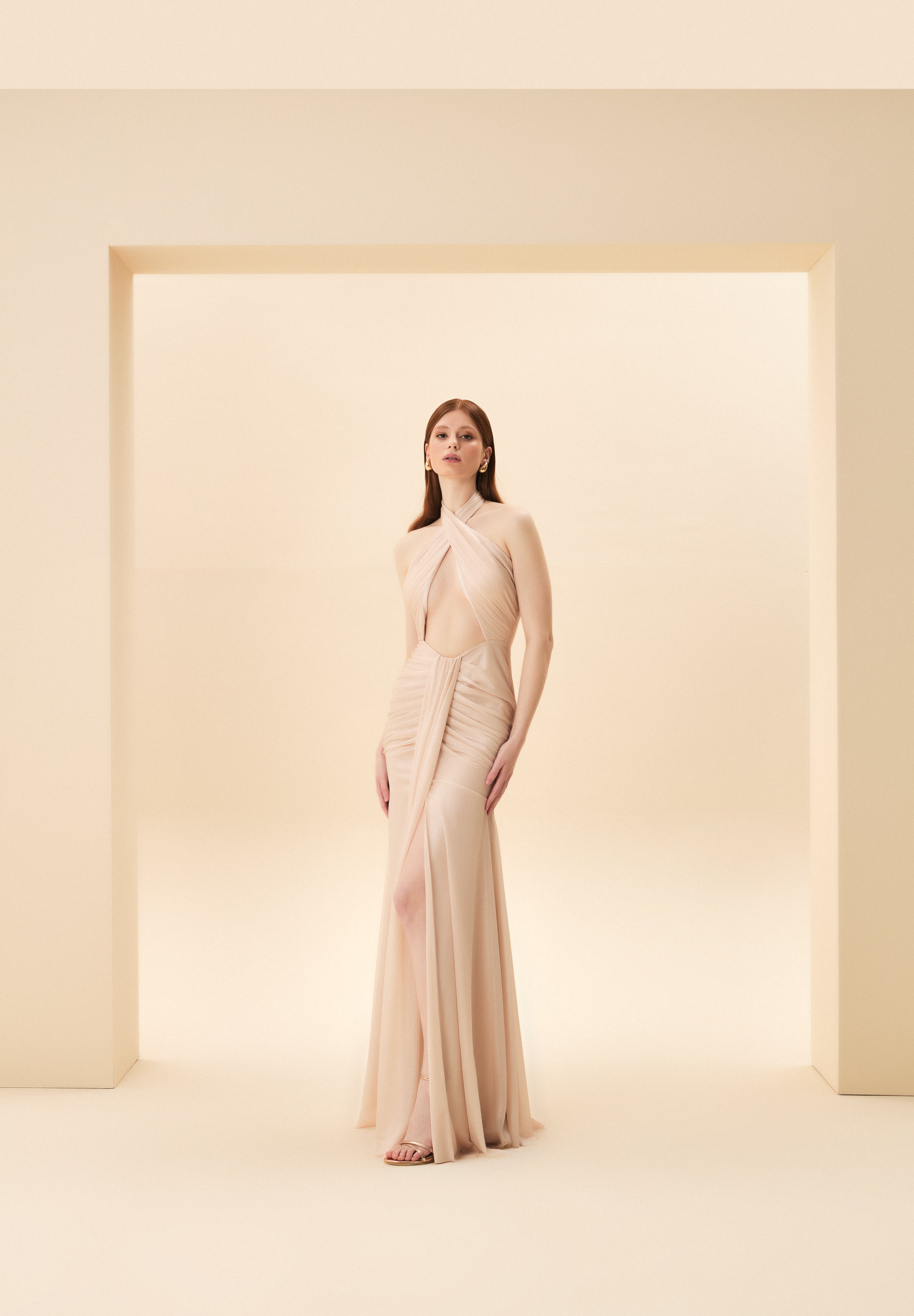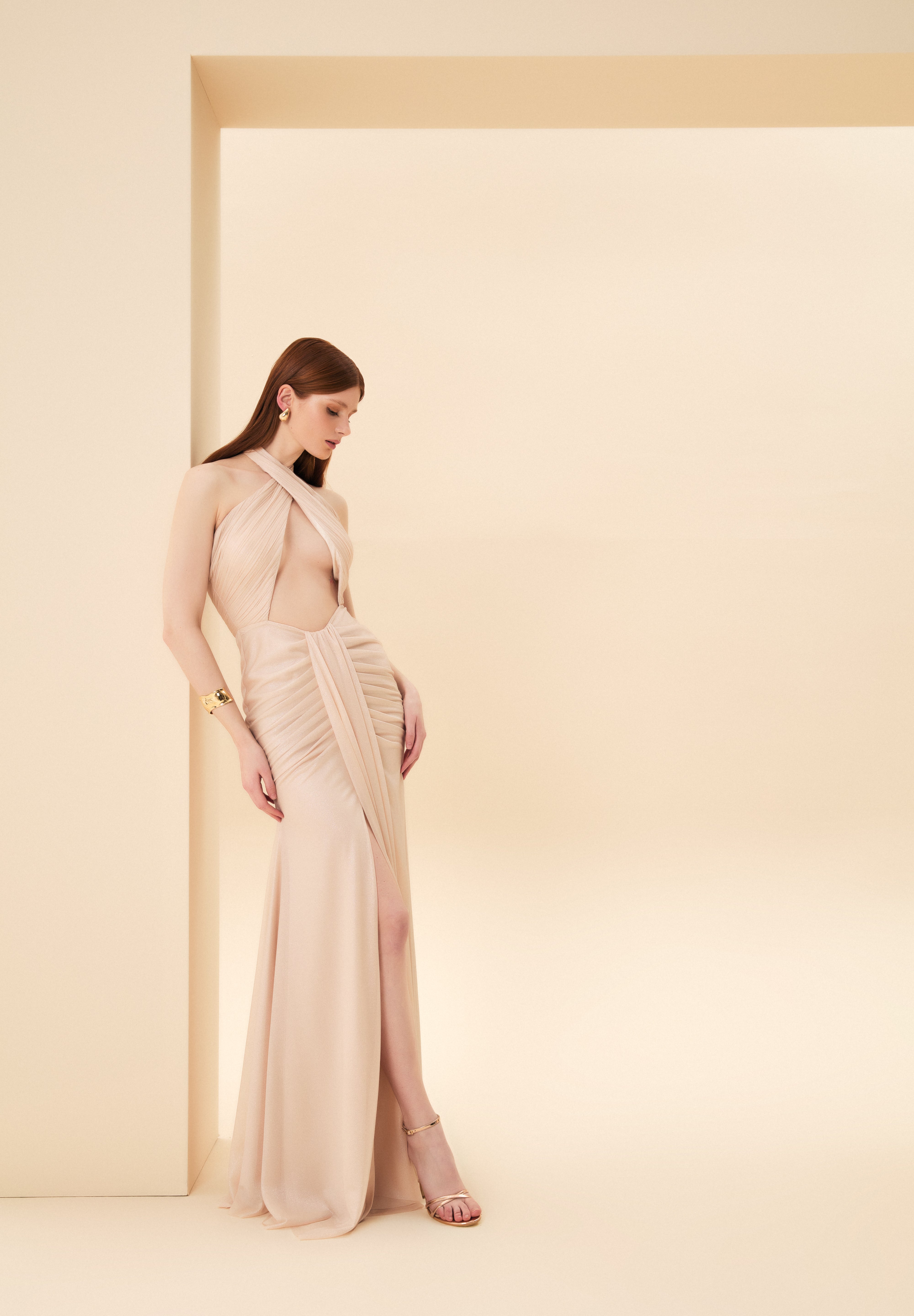 SİMLİ KUMAŞ BOYUNDAN BAĞLAMALI VE YIRTMAÇLI ELBİSE PUDRA