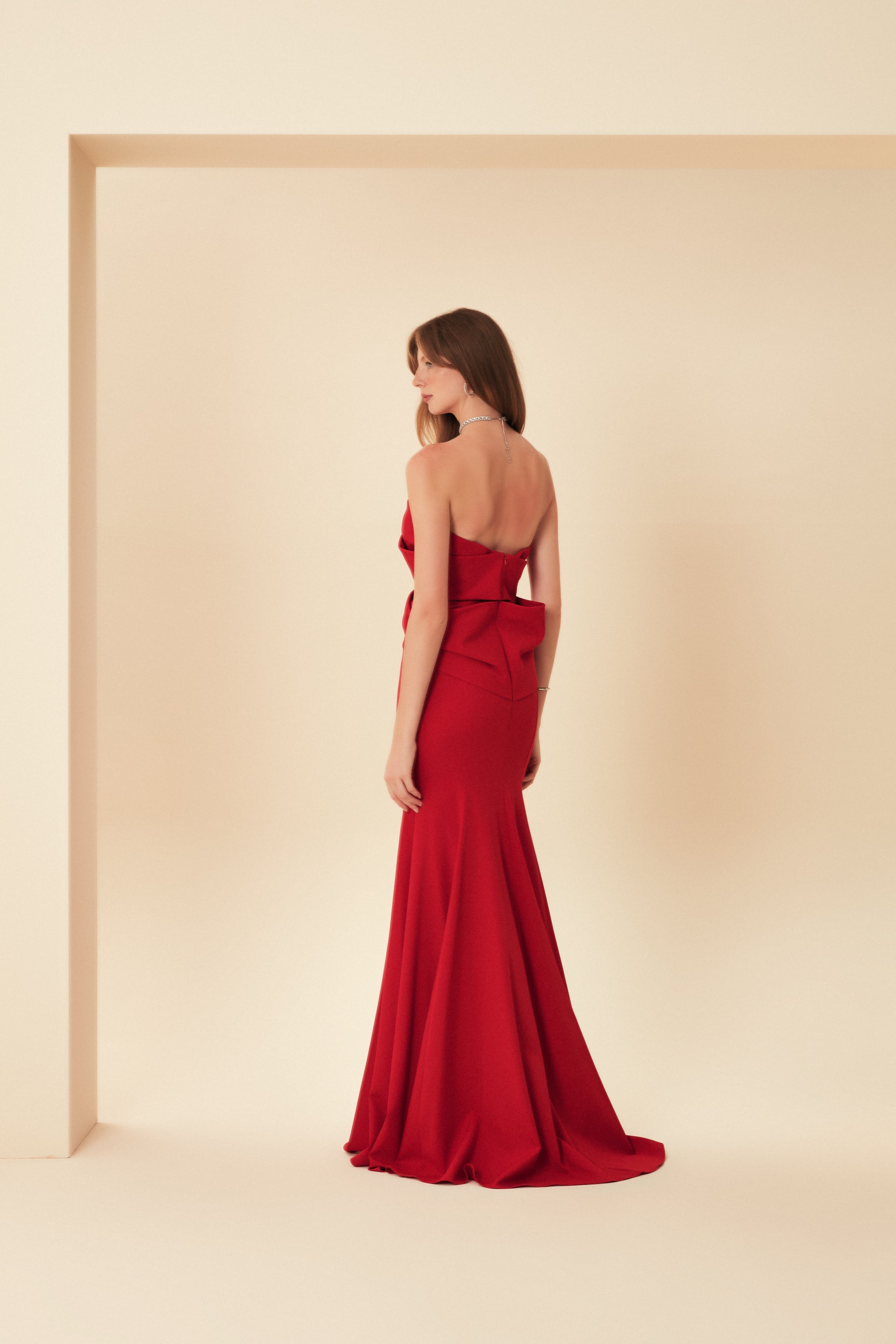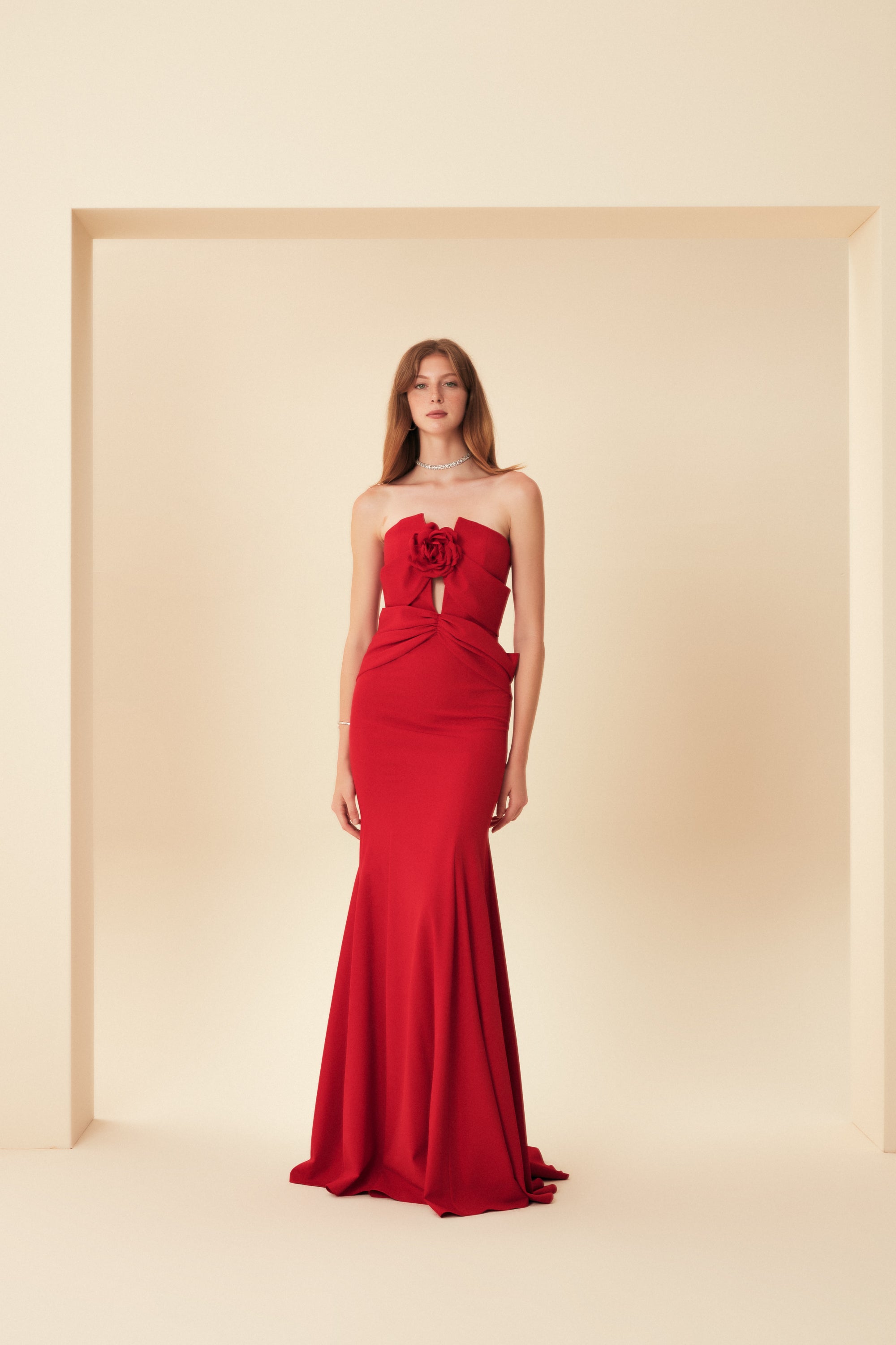 STRAPLEZ GÖĞÜSÜ GÜL DETAYLI BALIK ABİYE KIRMIZI