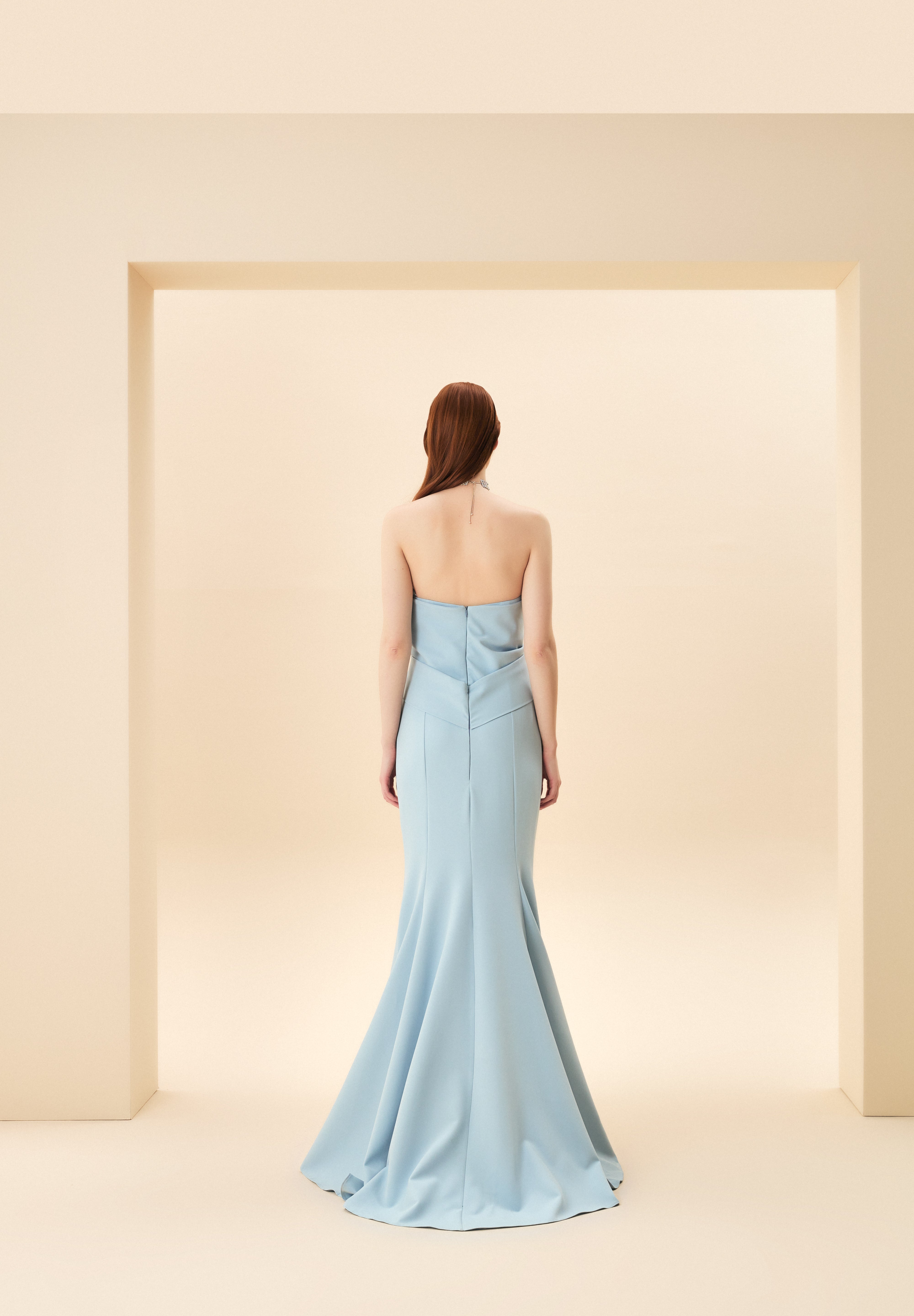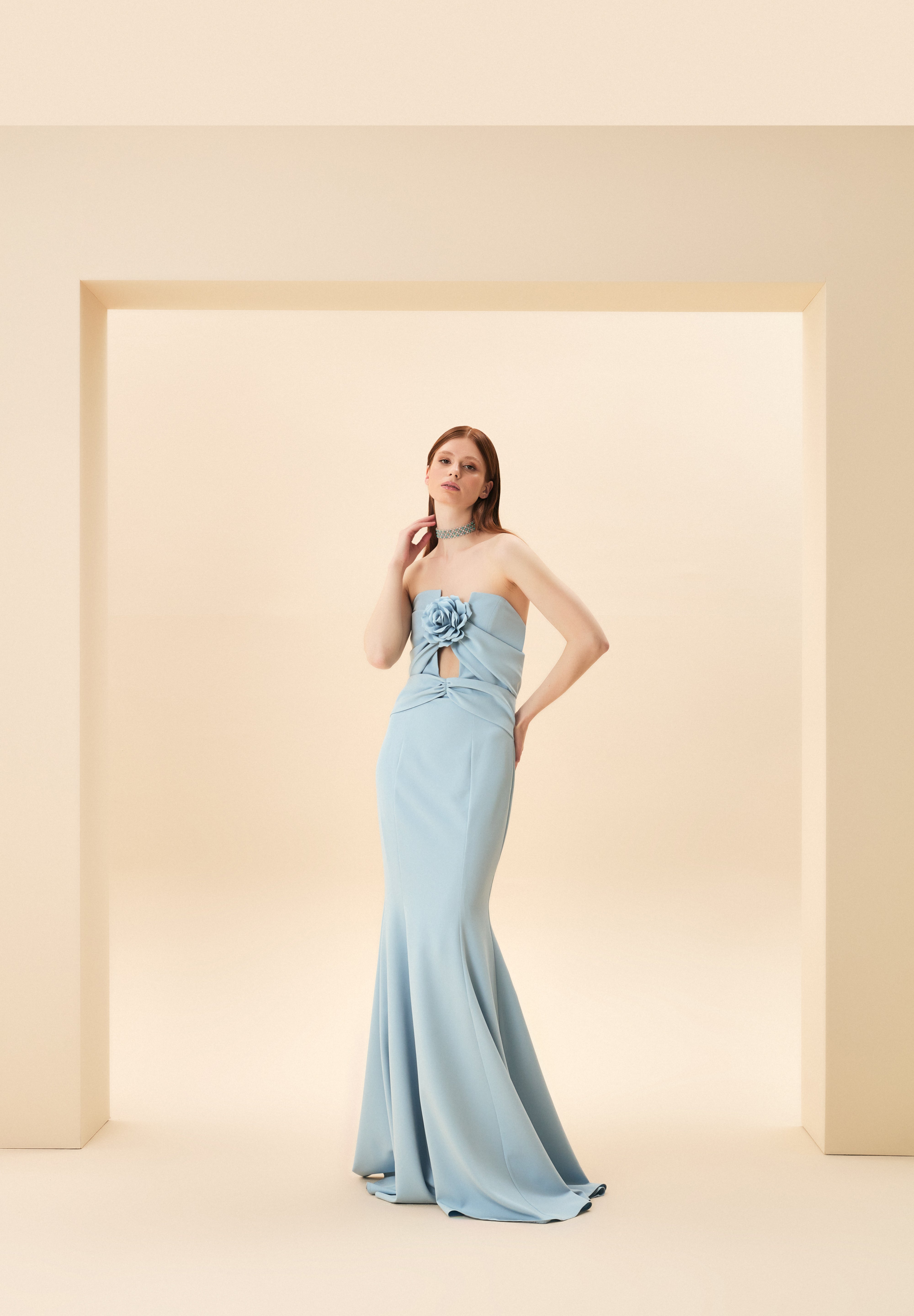 STRAPLEZ GÖĞÜSÜ GÜL DETAYLI BALIK ABİYE MAVİ