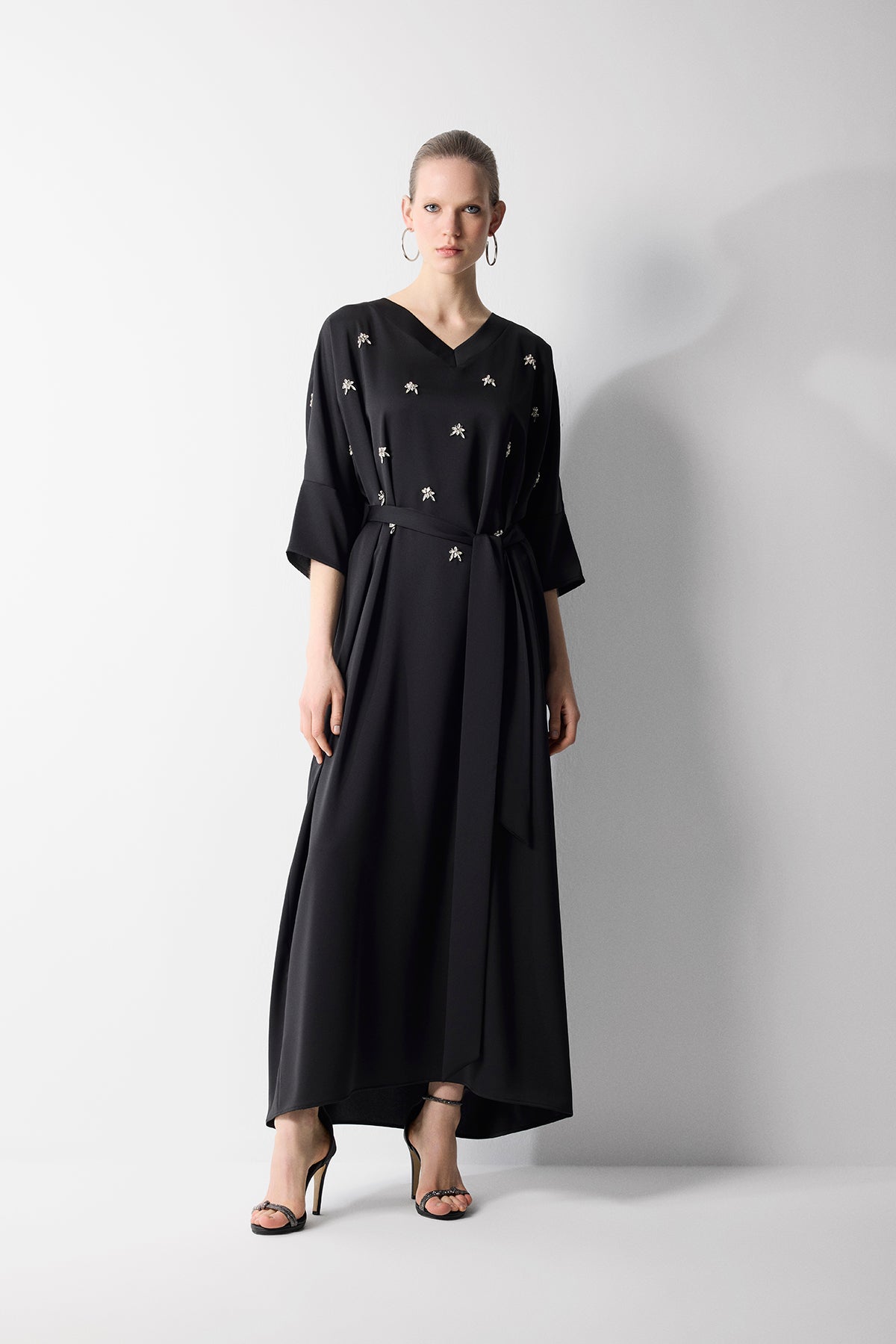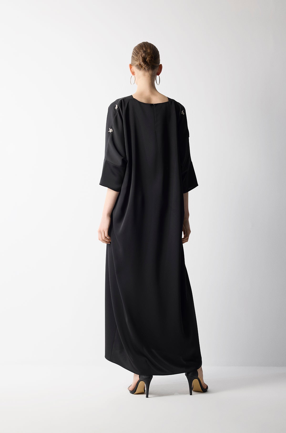 ÜZERİ KASALI TAŞLI İŞLEMELİ V YAKA UZUN ABİYE SİYAH