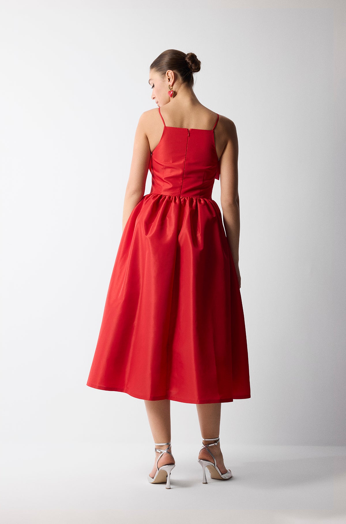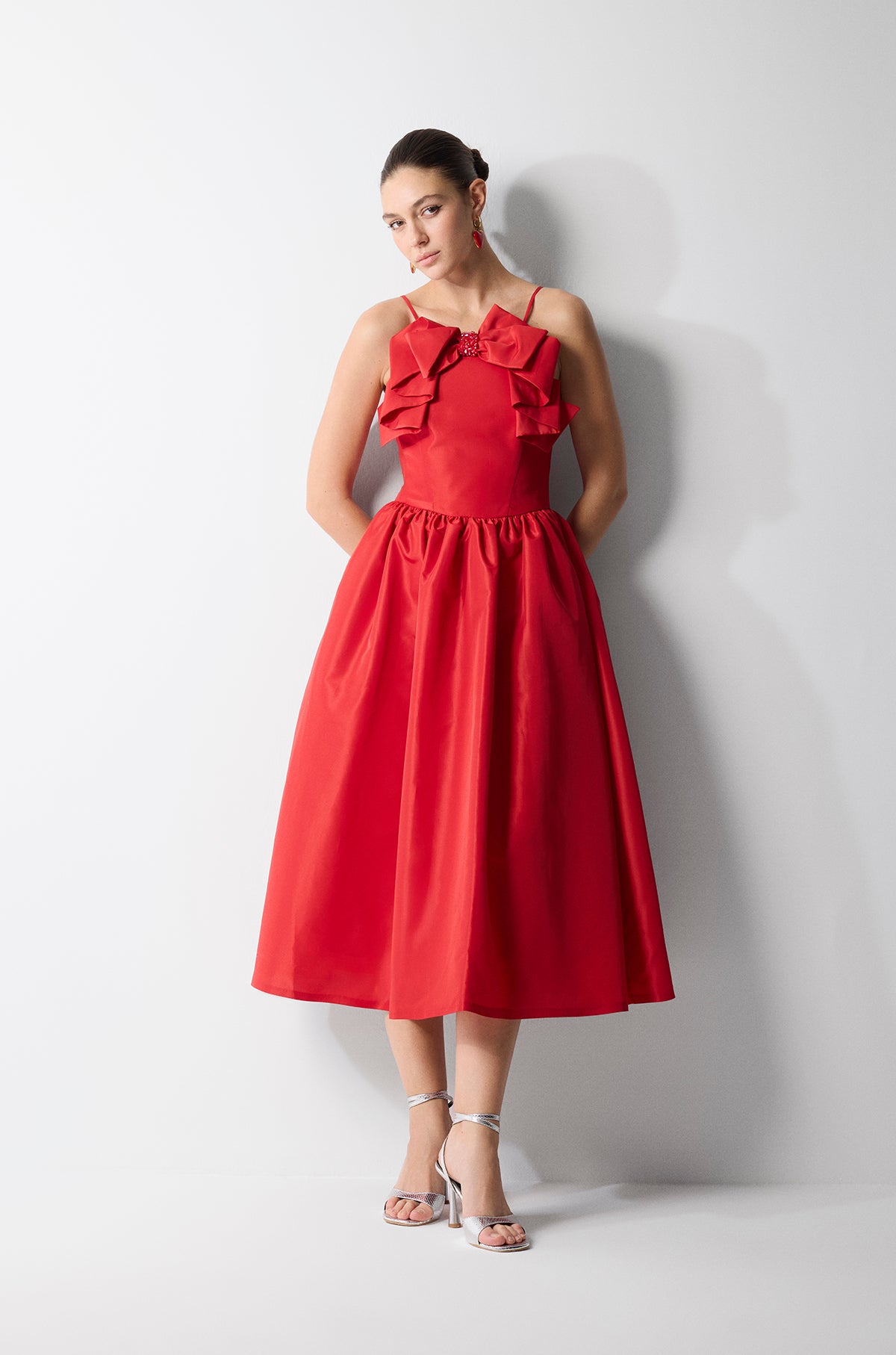 FİYONK VE İŞLEME DETAYLI MİDİ BOY TAFTA ELBİSE KIRMIZI