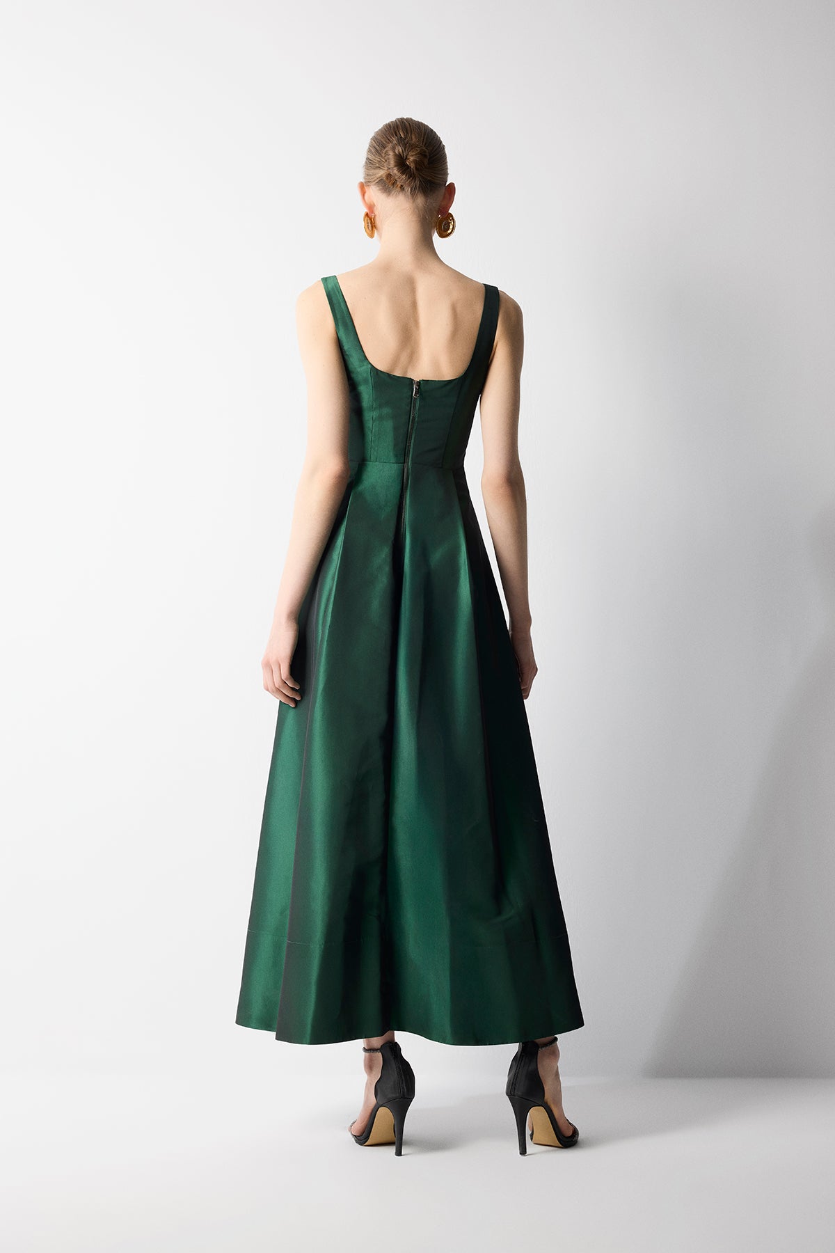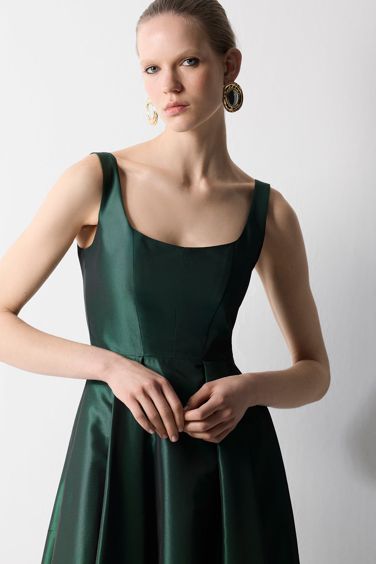 KALIN ASKILI BÜZGÜ ETEKLİ TAFTA MİDİ BOY ELBİSE ZÜMRÜT