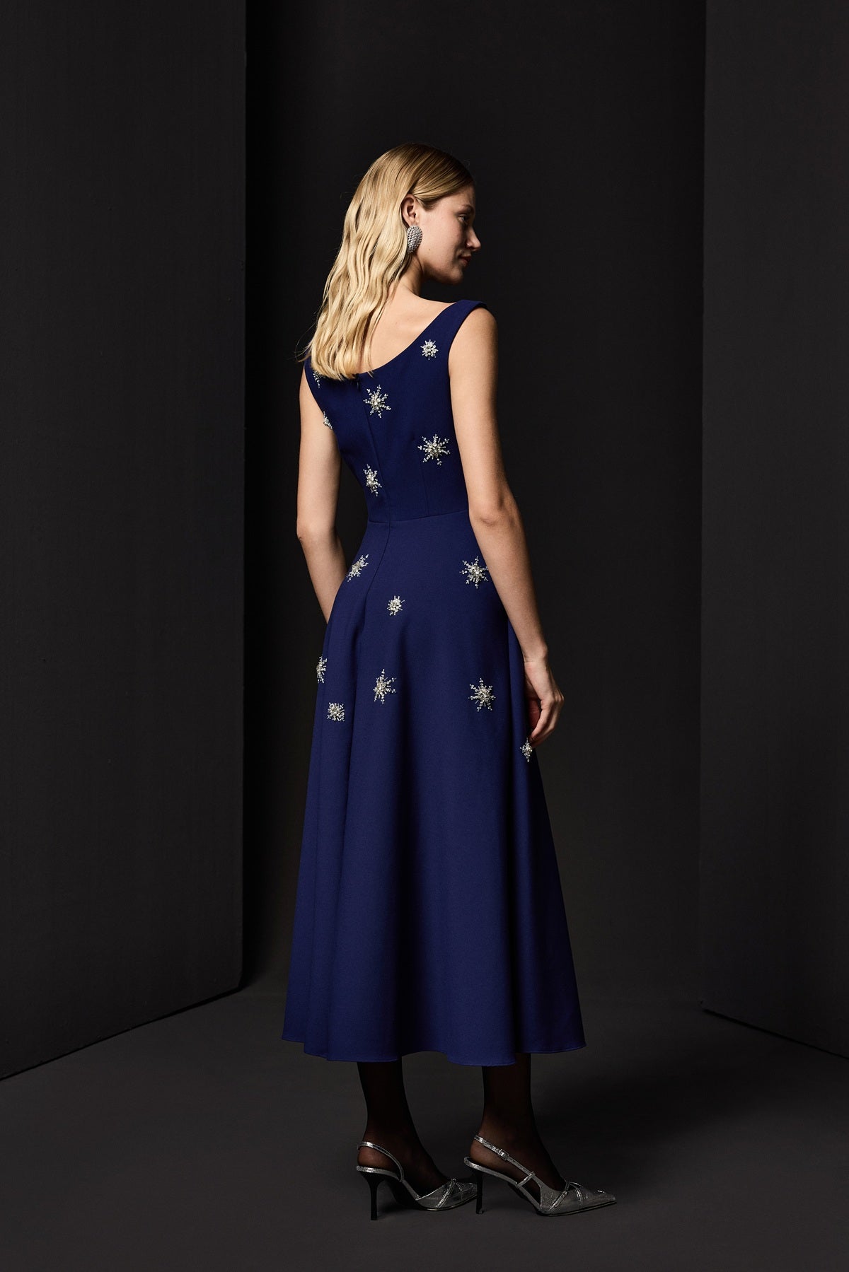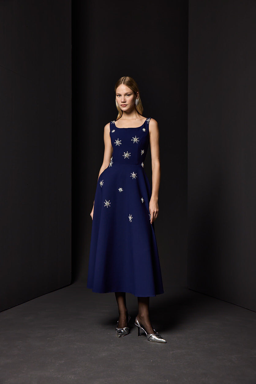 İŞLEMELİ MİDİ BOY ELBİSE SAKS