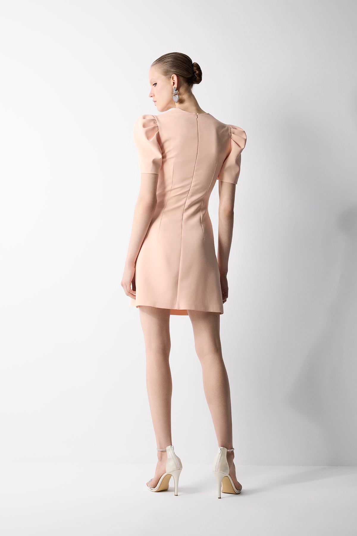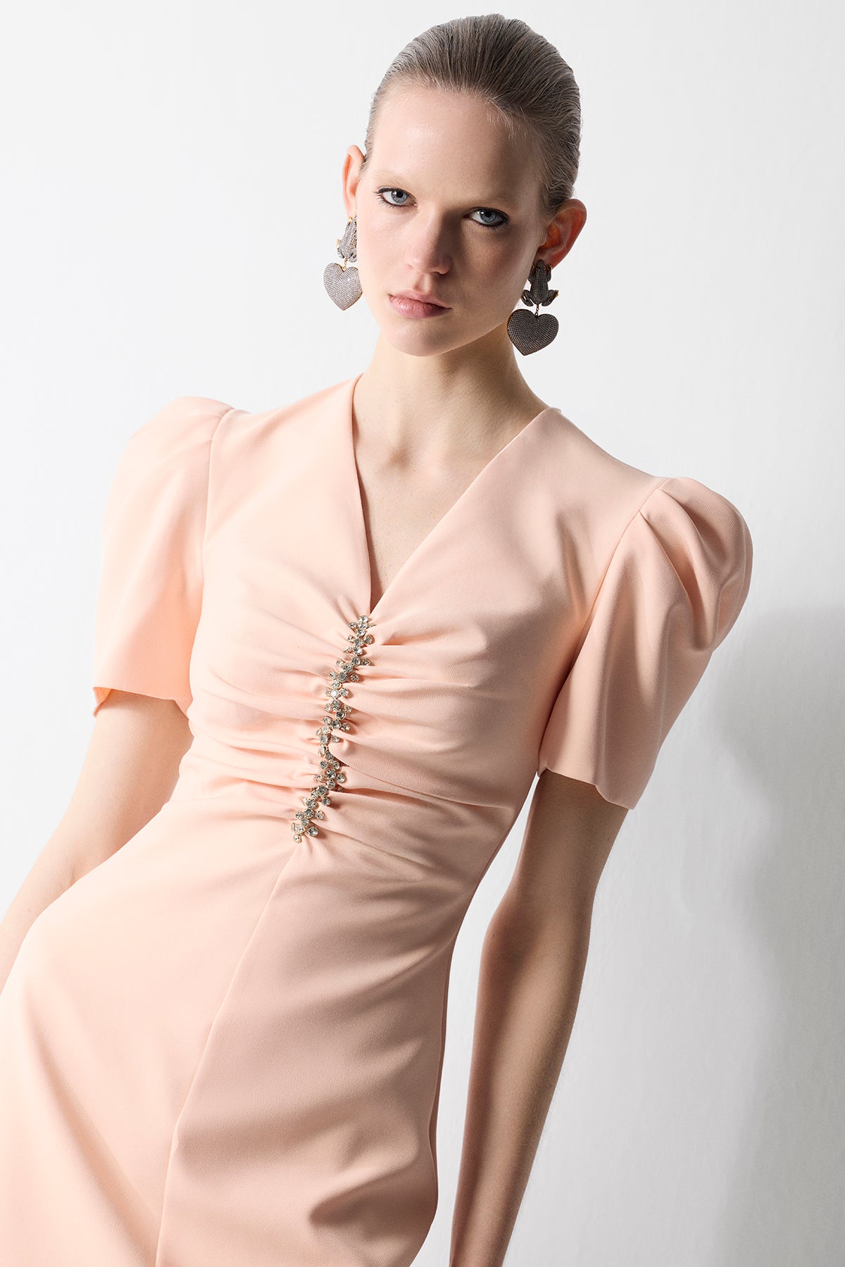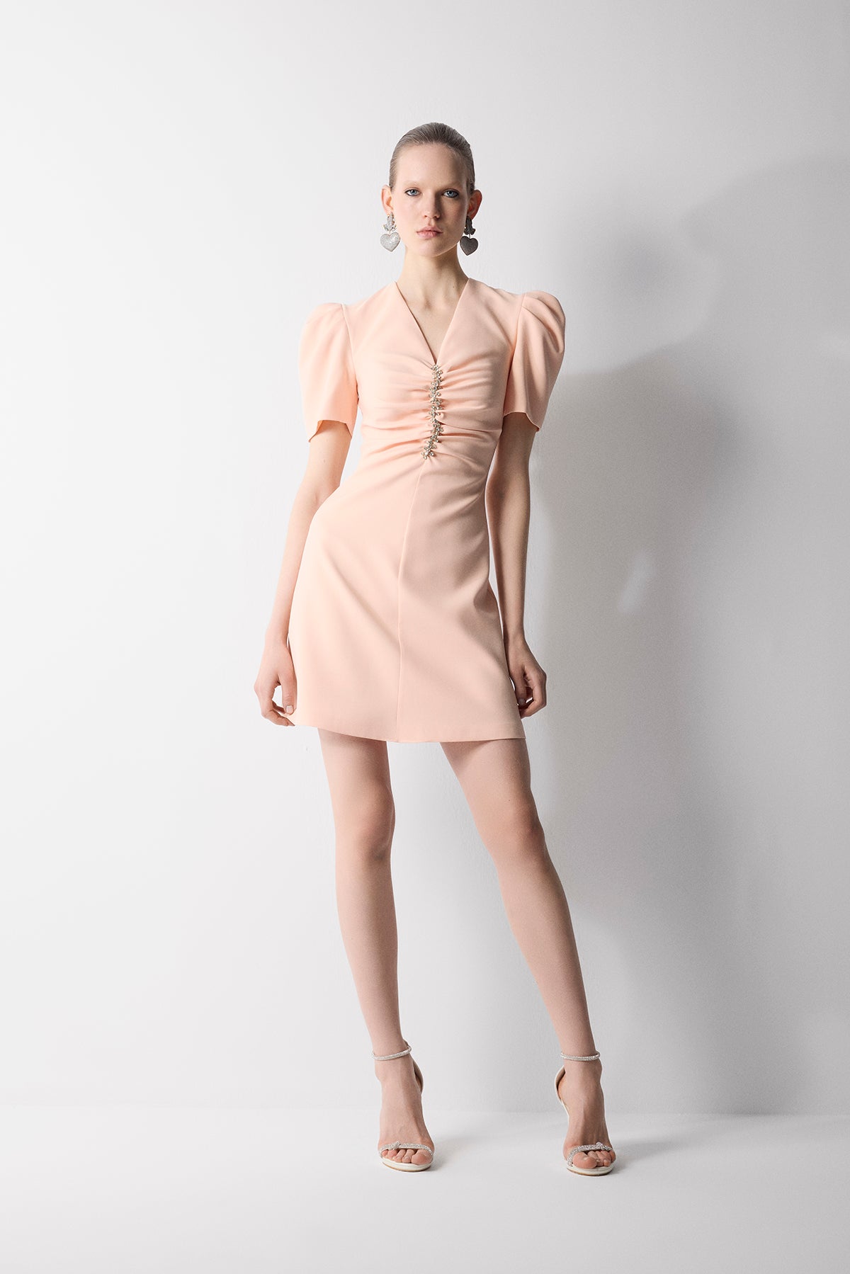 KISA KARPUZ KOLLU V YAKALI TAŞ İŞLEMELİ MİNİ KREP ELBİSE PUDRA
