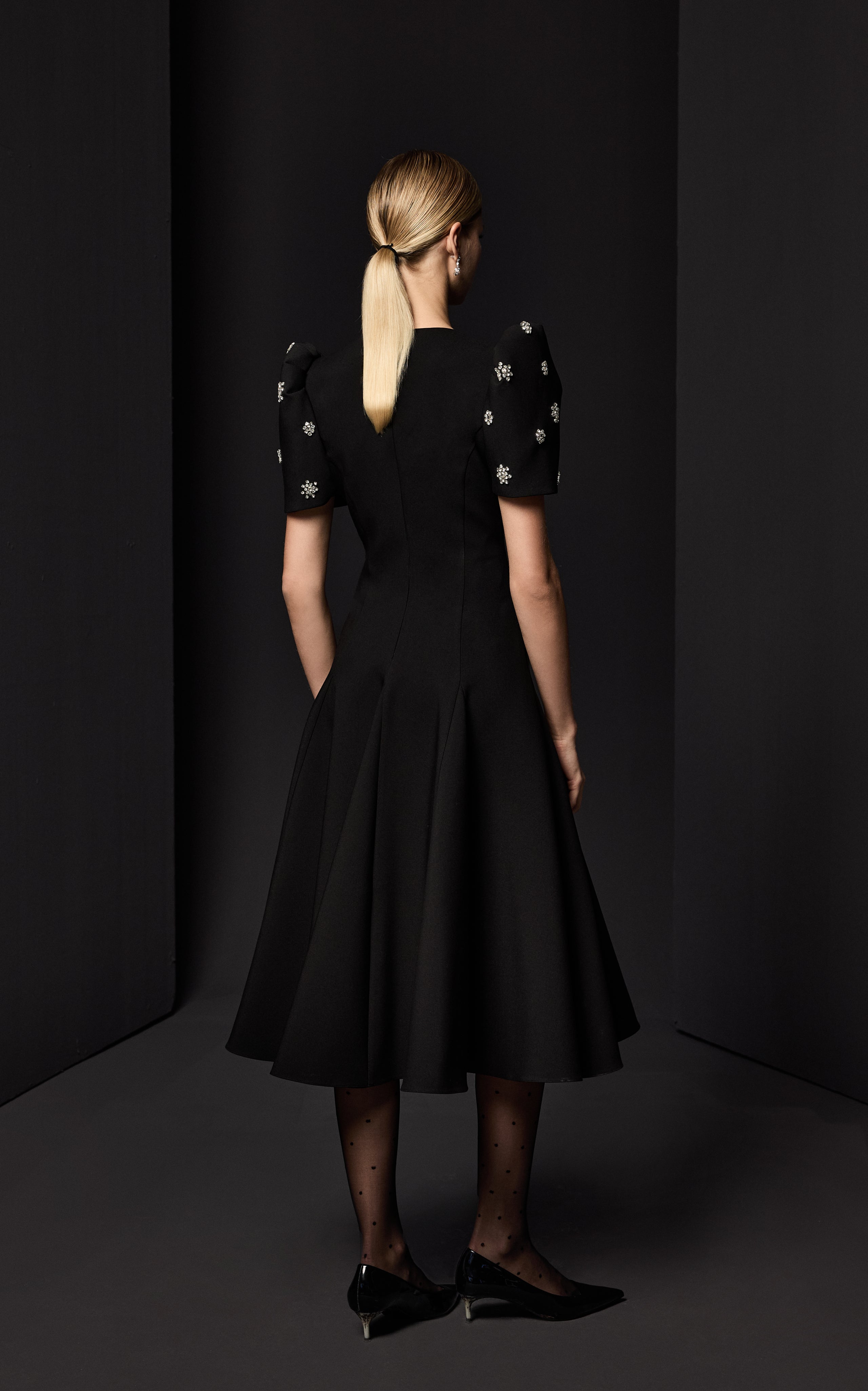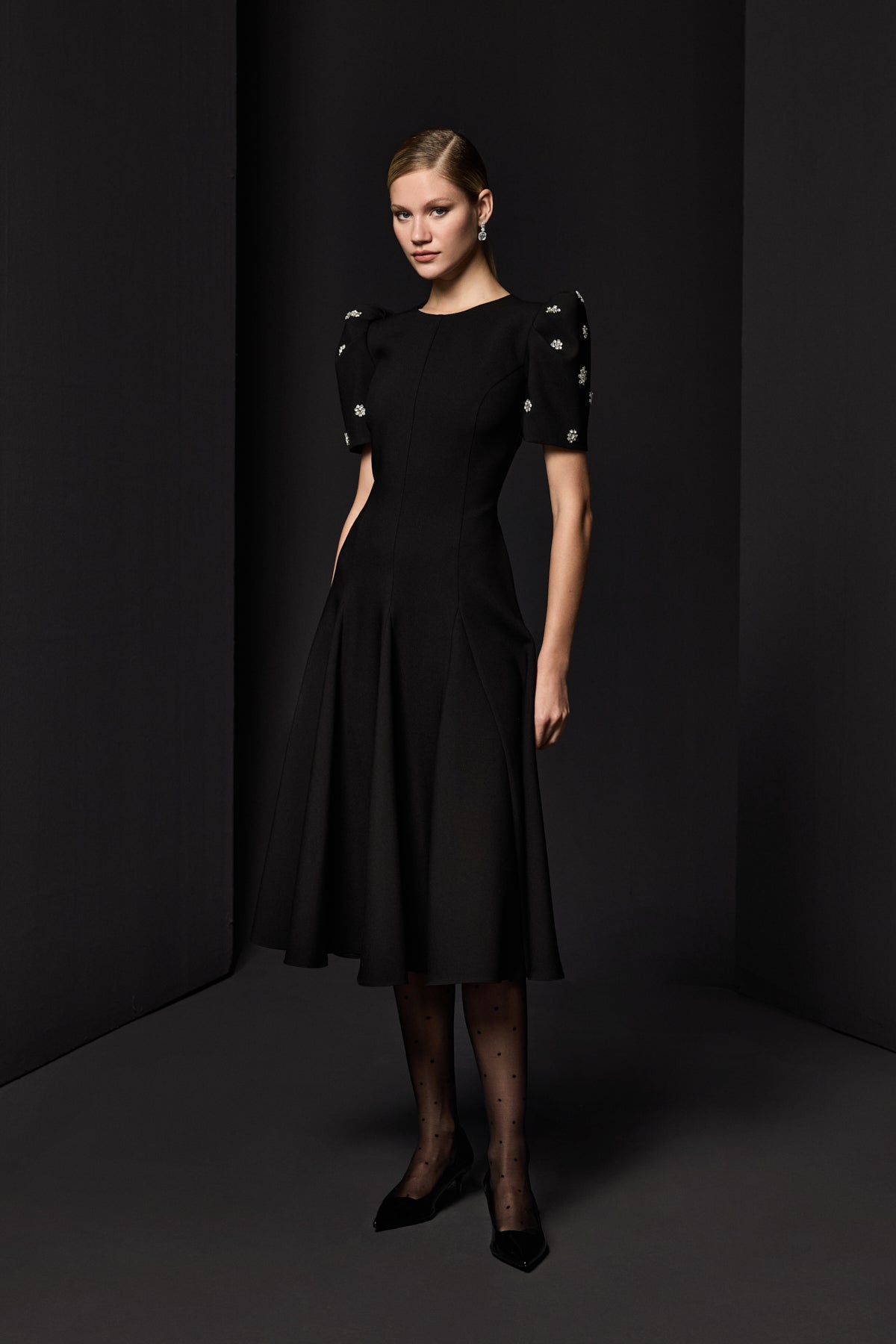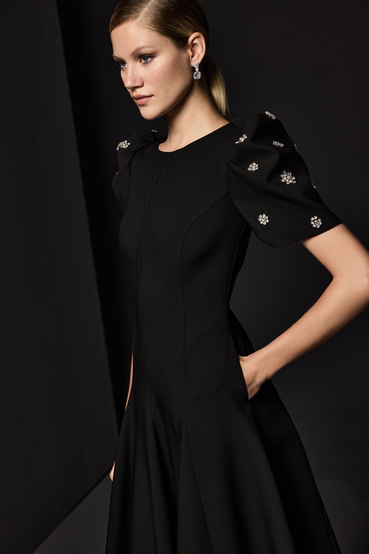 KOLLARI İŞLEME DETAYLI BEDENE OTURAN KLOŞ ETEKLİ MİDİ BOY ELBİSE SİYAH