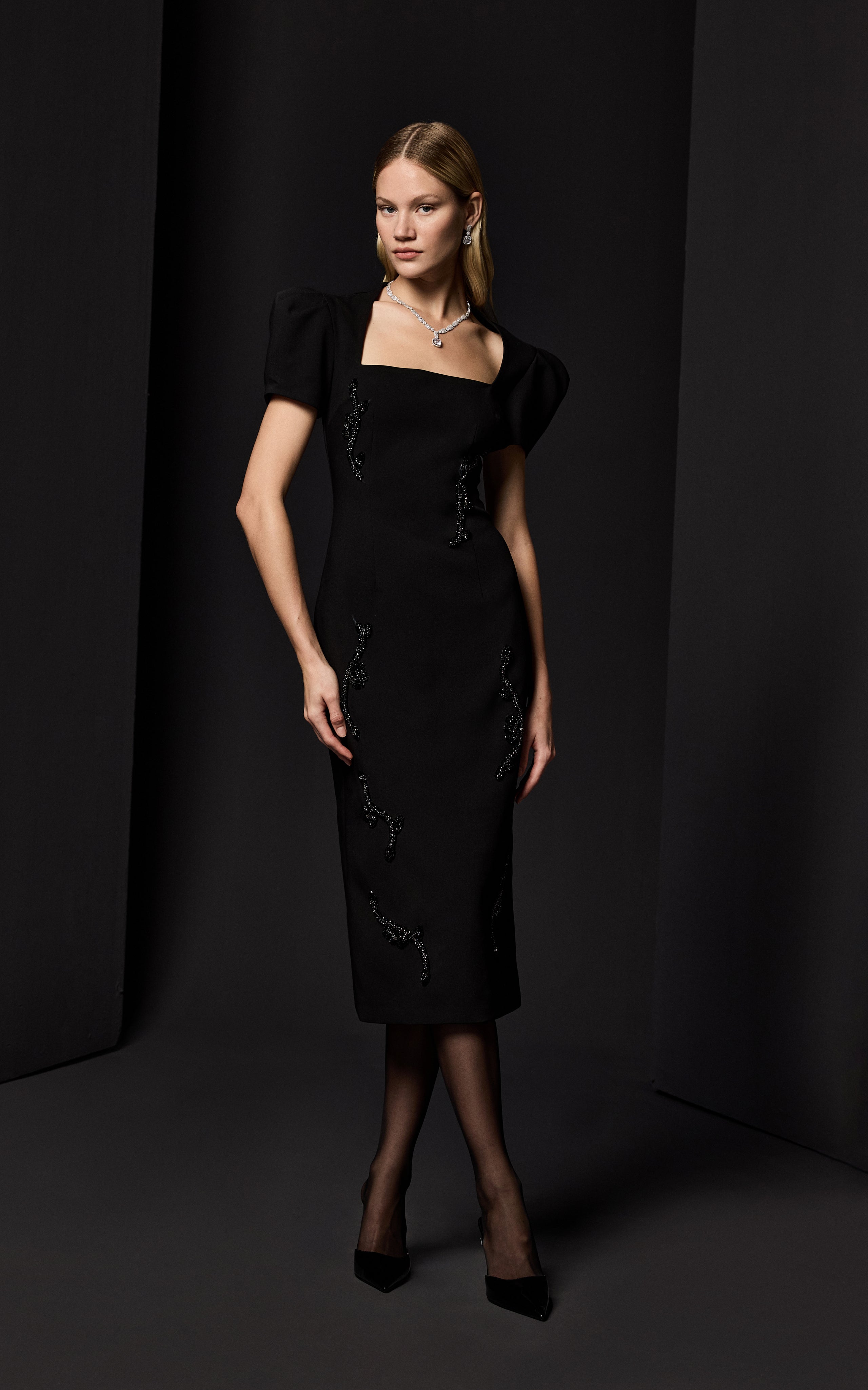 MOTİF İŞLEME DETAYLI BEDENE OTURAN MİDİ BOY ELBİSE SİYAH