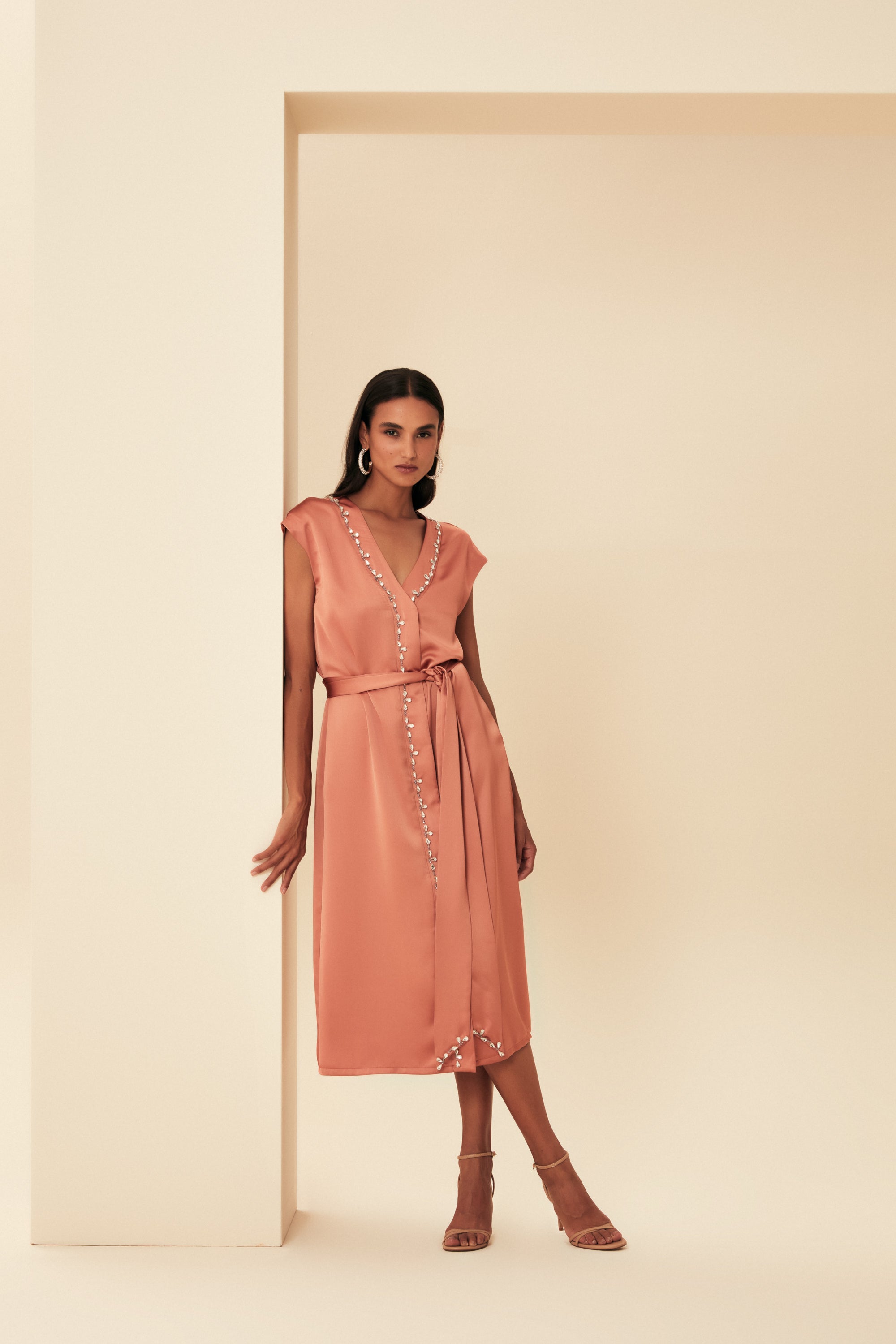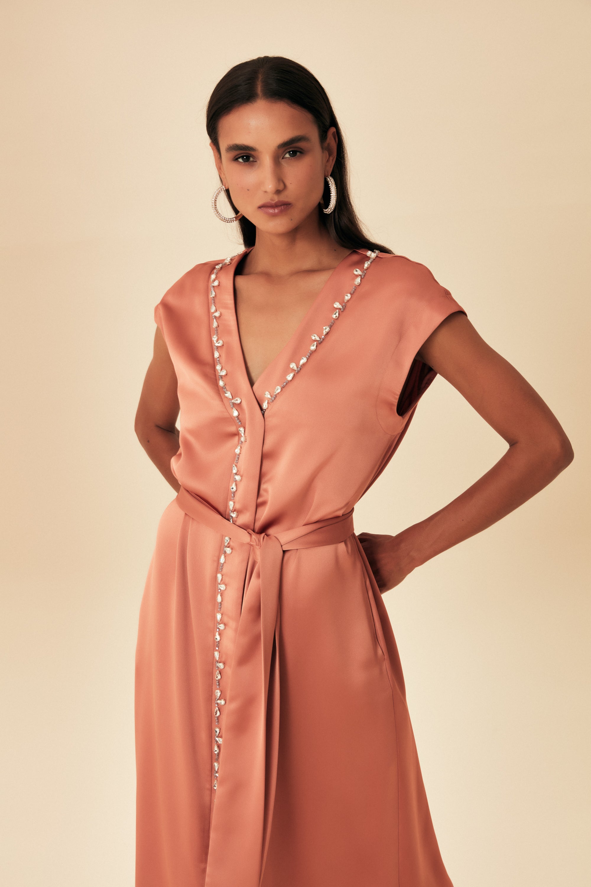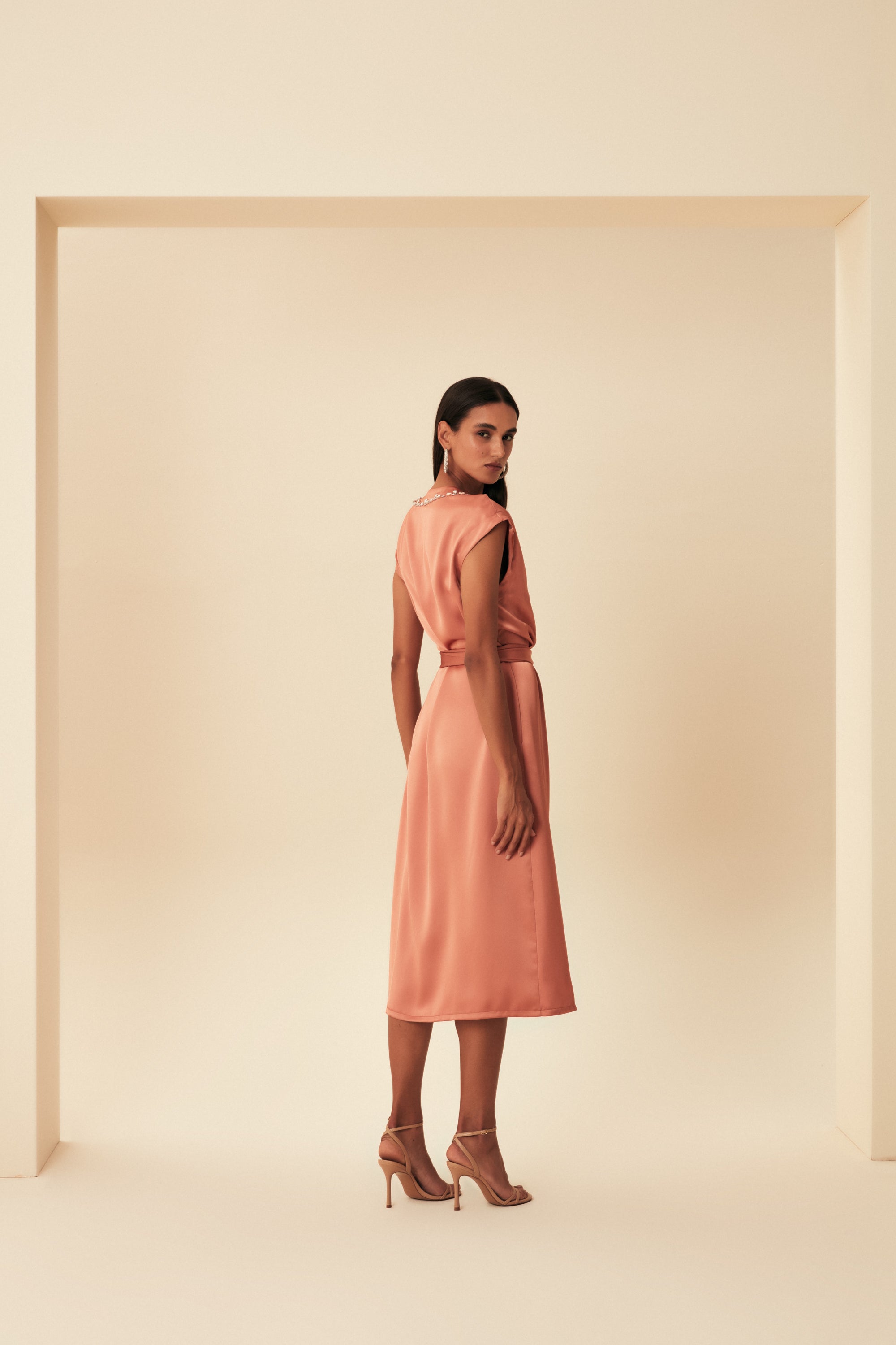 YAKA ÇEVRESİ İŞLEMELİ BELİ KUŞAKLI MİDİ BOY ELBİSE SOĞAN KABUĞU