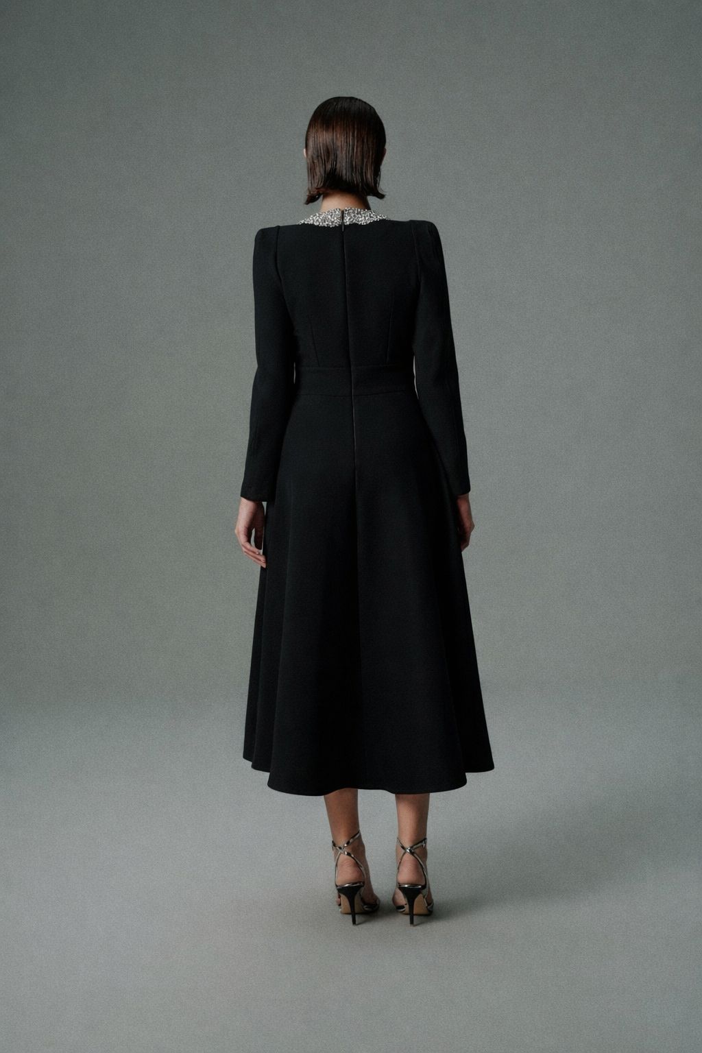 YAKASI TAŞ İŞLİ PENS DİKİŞ DETAYLI KLOŞ ETEKLİ KREP ELBİSE SİYAH