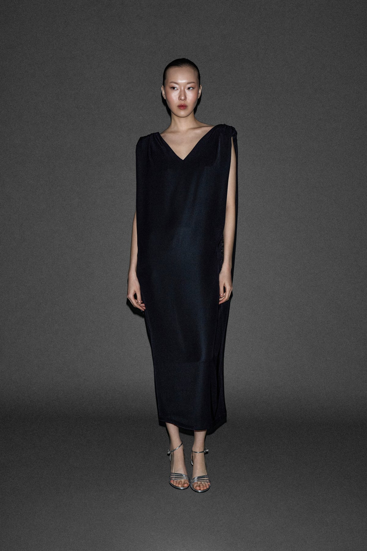 V YAKALI ARKADAN FERMUARLI BOL KESİM MİDİ BOY DÜZ KREP ELBİSE SİYAH