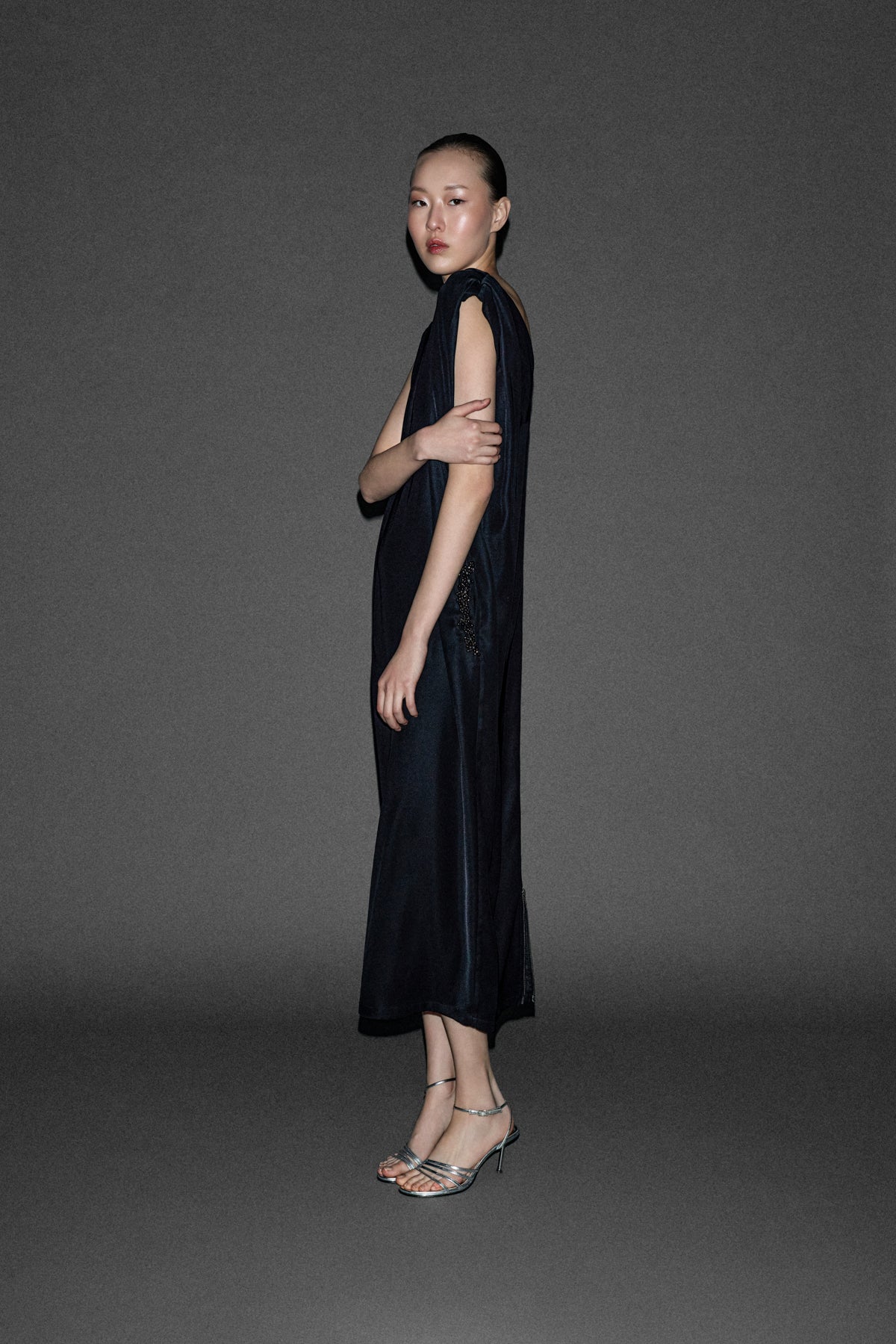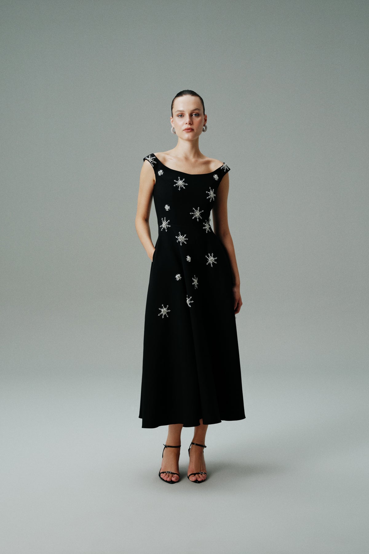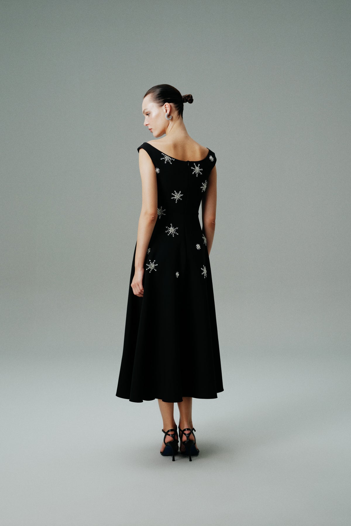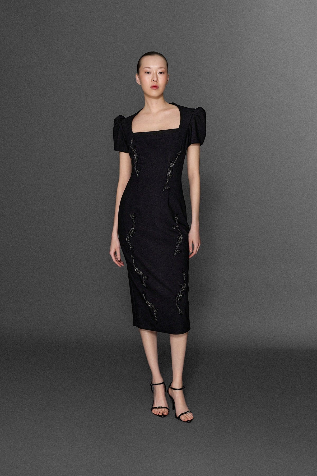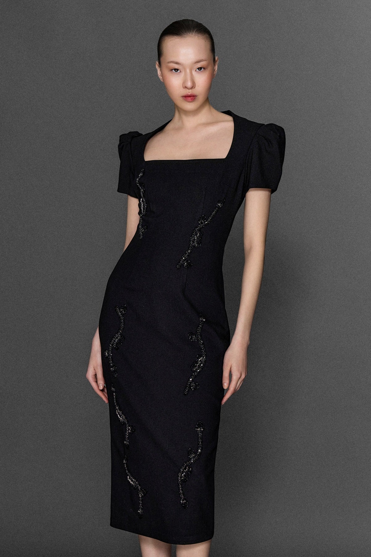 MOTİF İŞLEME DETAYLI BEDENE OTURAN MİDİ BOY ELBİSE SİYAH