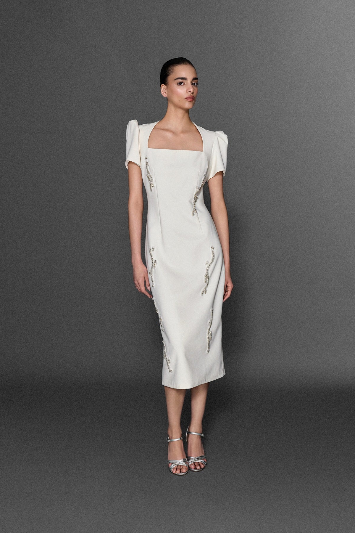 MOTİF İŞLEME DETAYLI BEDENE OTURAN MİDİ BOY ELBİSE EKRU
