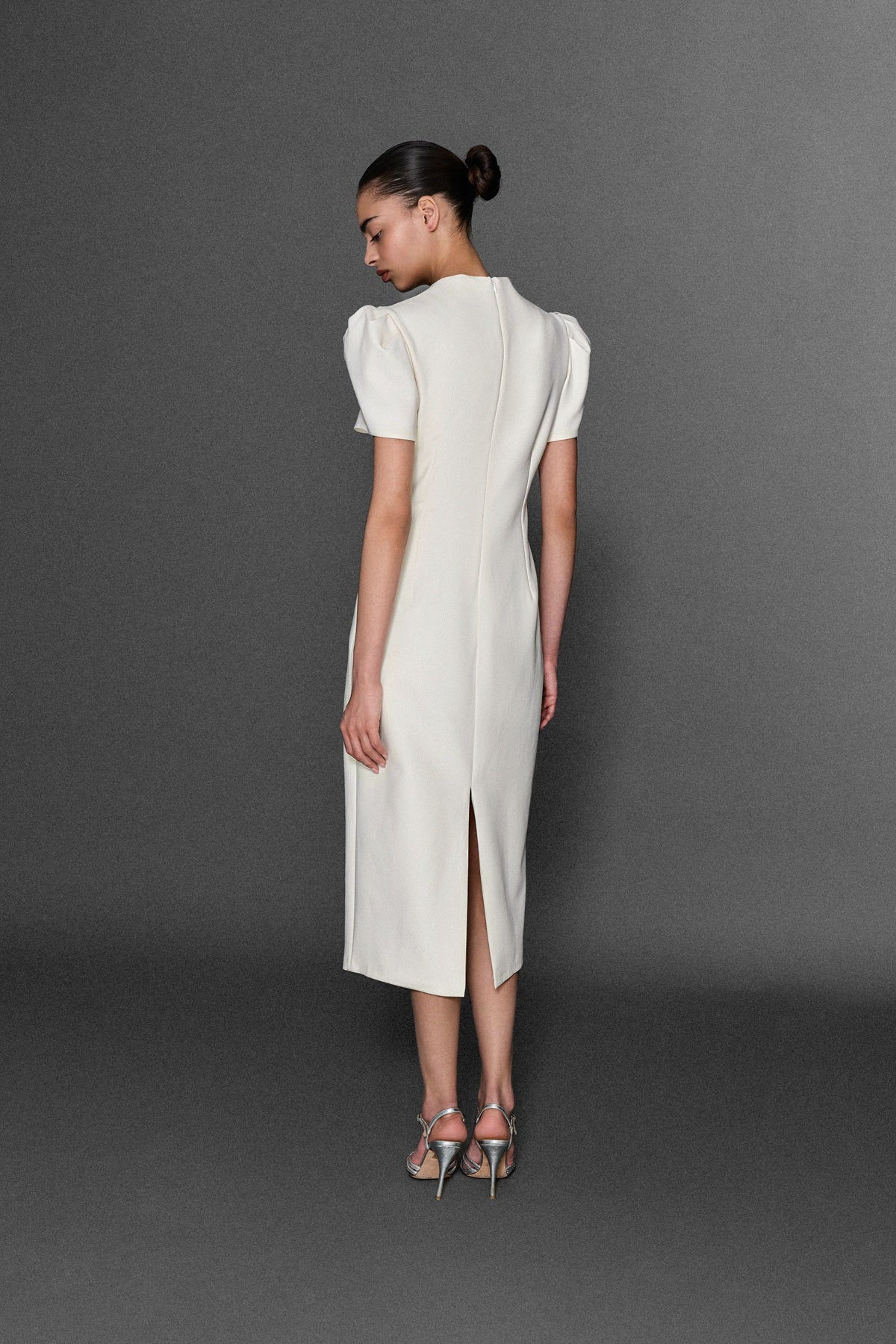 YAKASI TAŞ İŞLİ PENS DİKİŞ DETAYLI KLOŞ ETEKLİ KREP ELBİSE EKRU