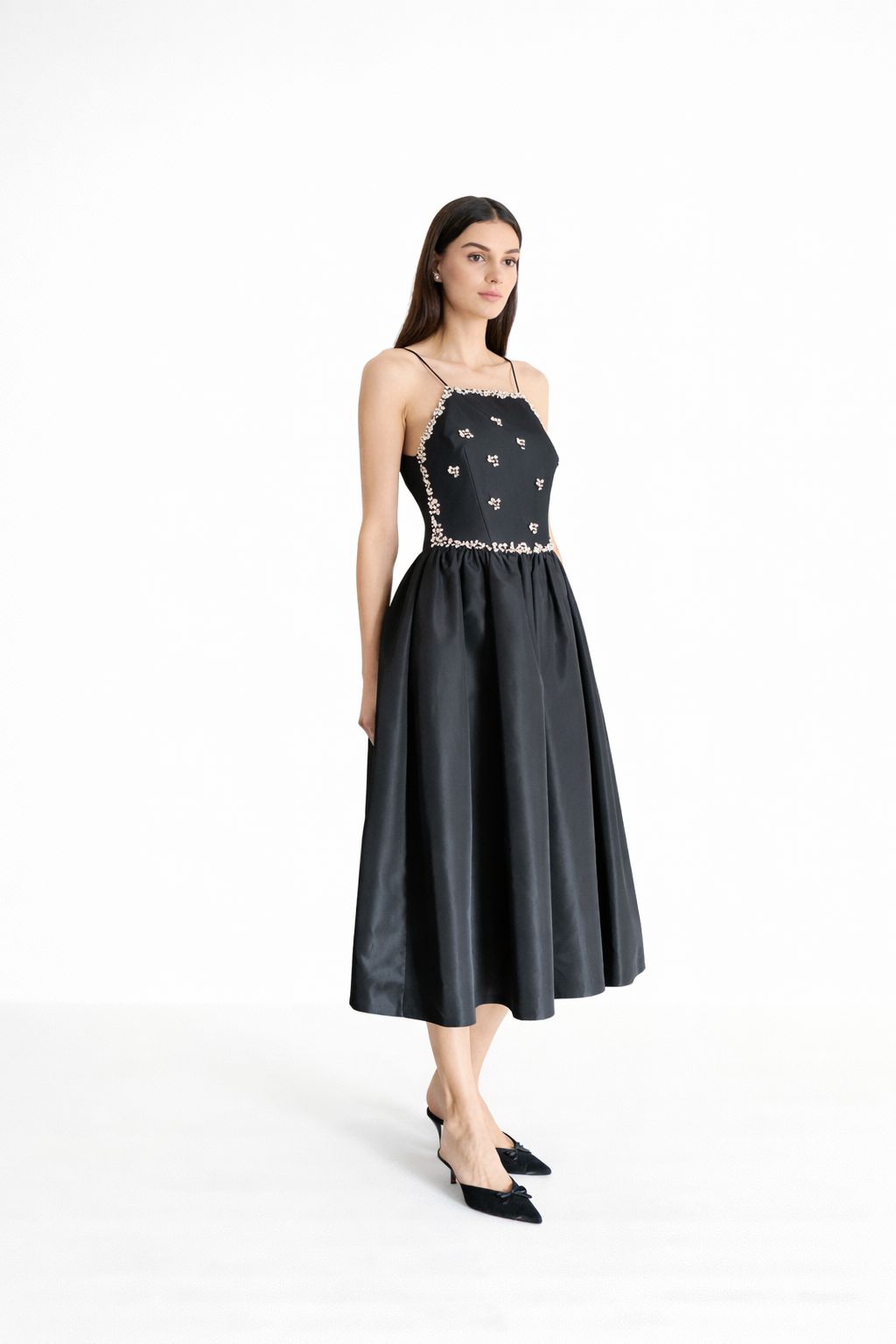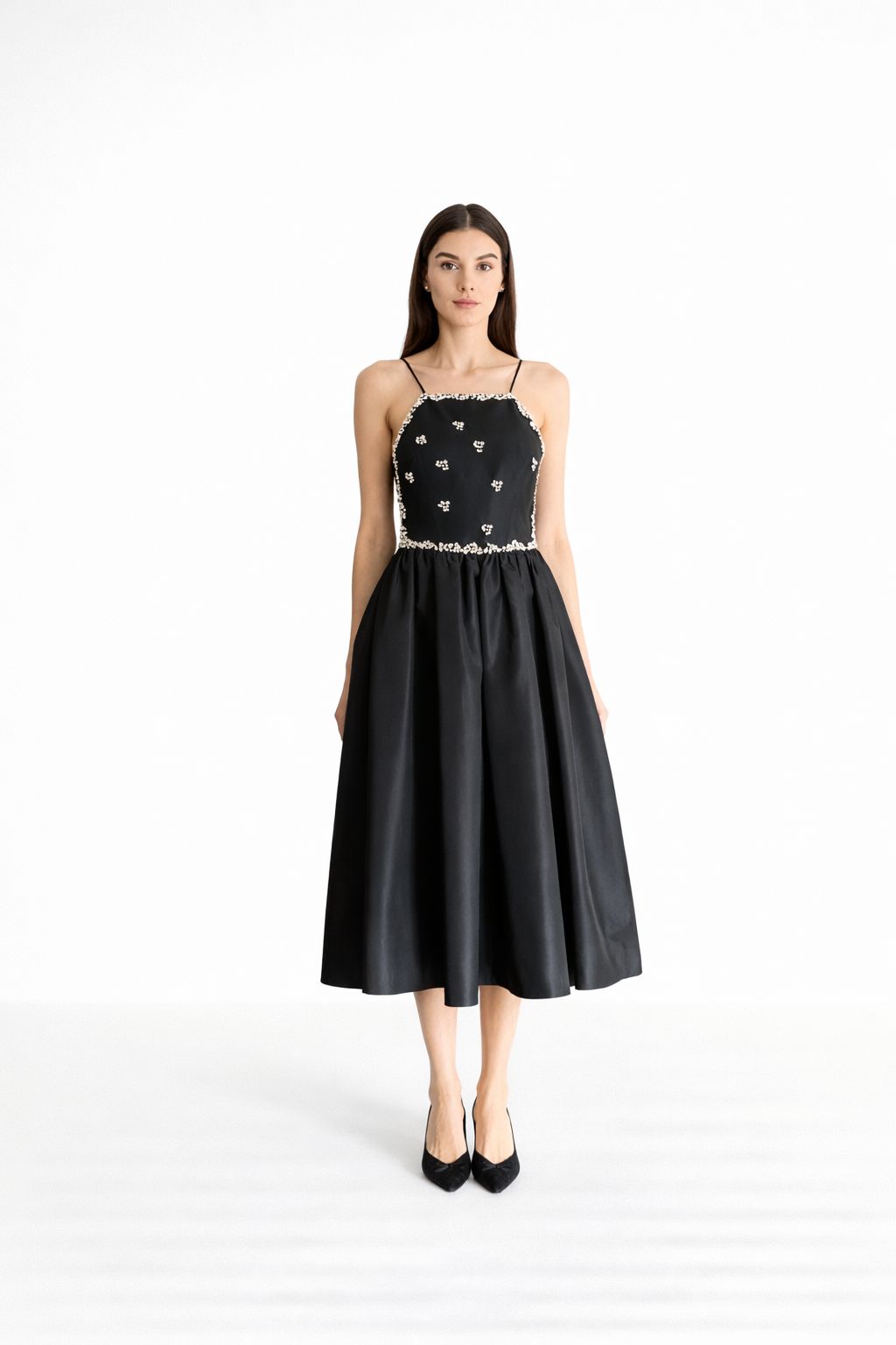 İŞLEME DETAYLI MİDİ BOY TAFTA ELBİSE SİYAH