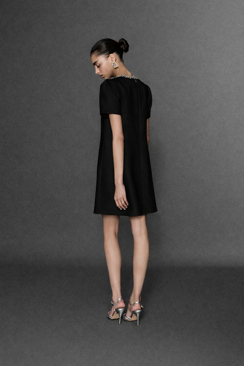 KISA KOLLU YAKADA TAŞ İŞLEMELİ KISA KREP ELBİSE SİYAH