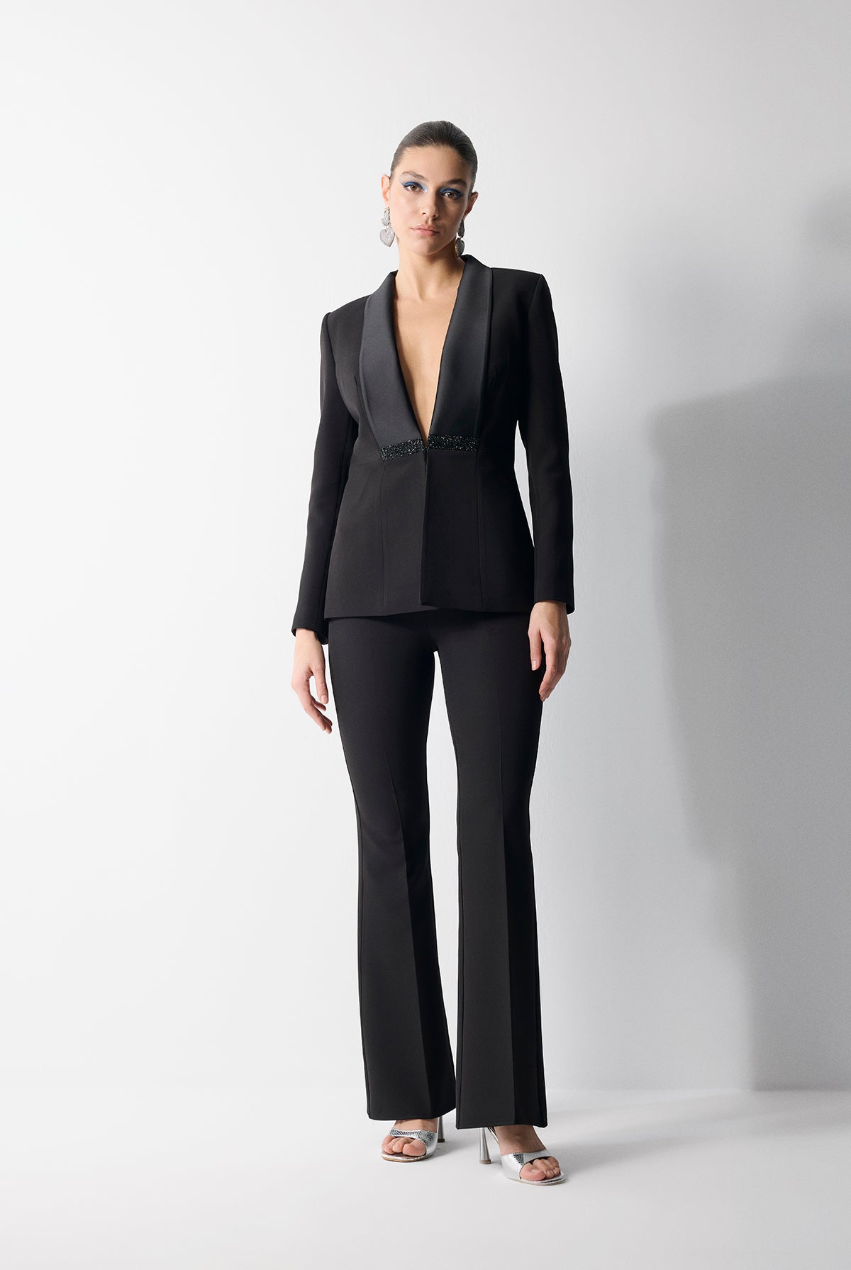 ÖNDE TAŞ DETAYLI SATEN GARNİ YAKALI KREP CEKET SİYAH