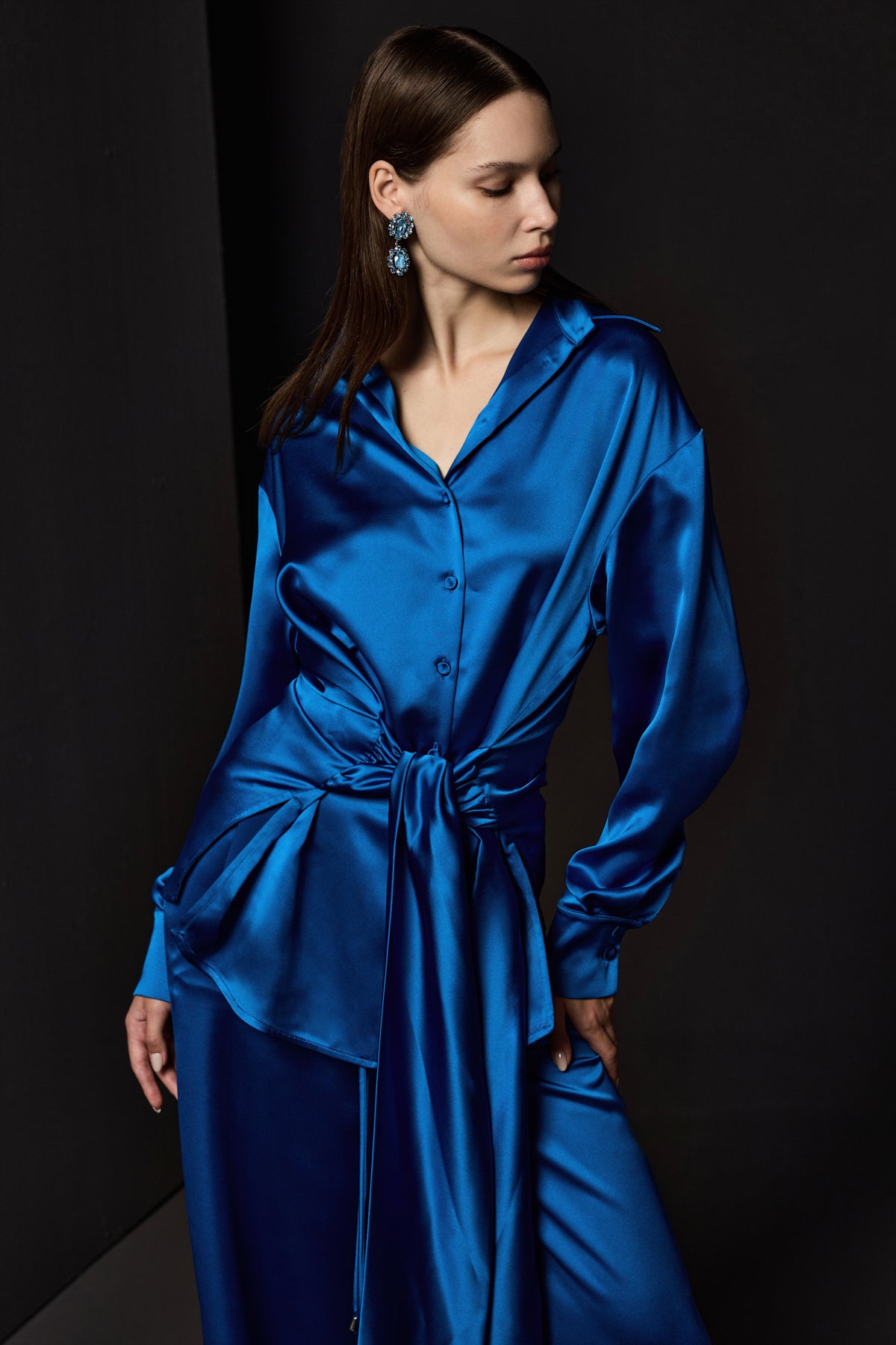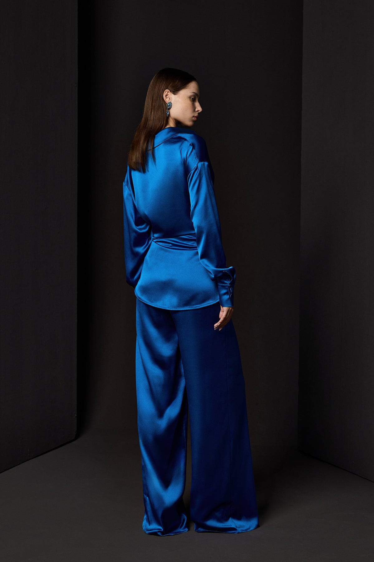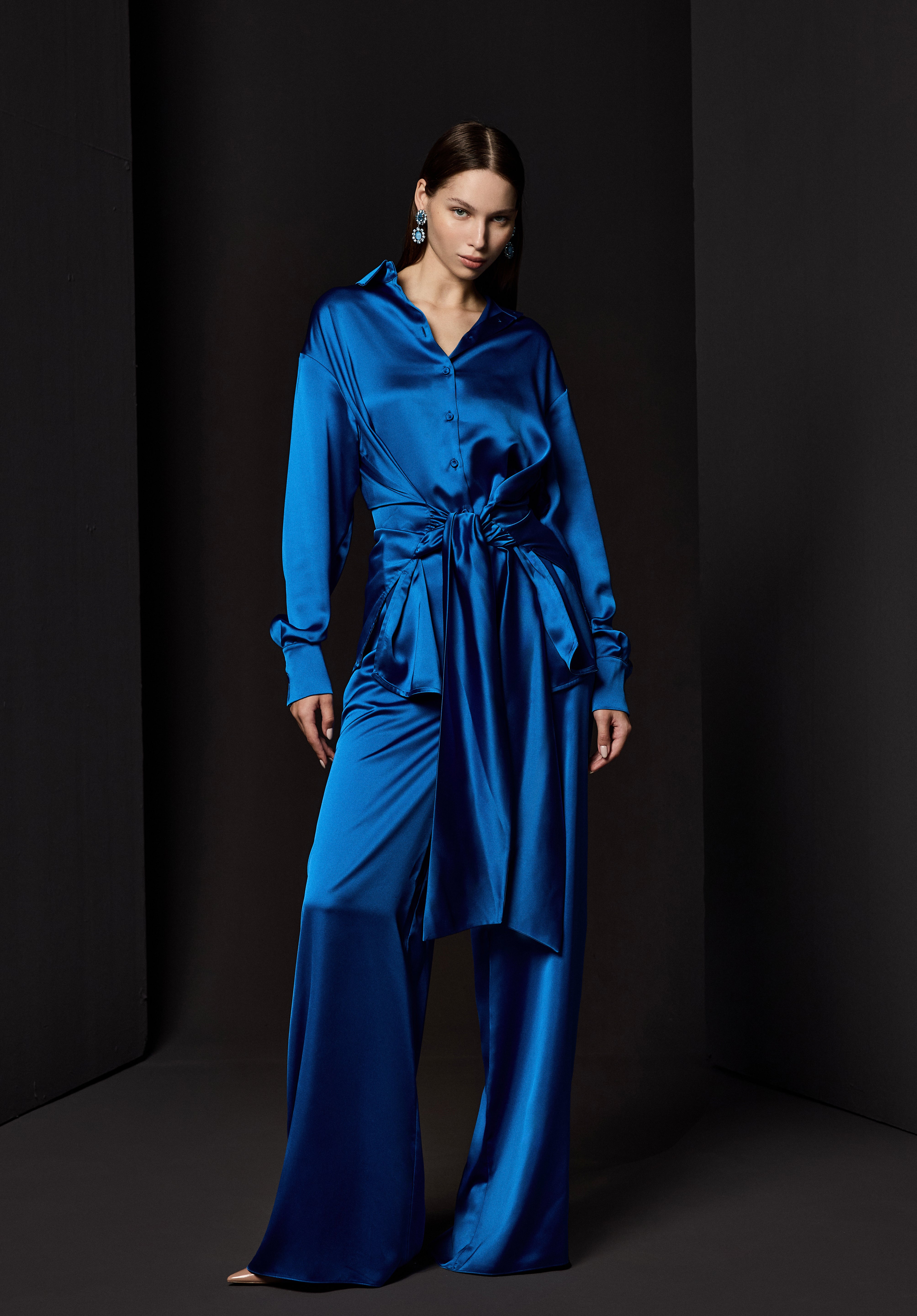 ÖNDEN KUŞAK BAĞLAMALI GÖMLEK VE PANTOLON TAKIM SAKS
