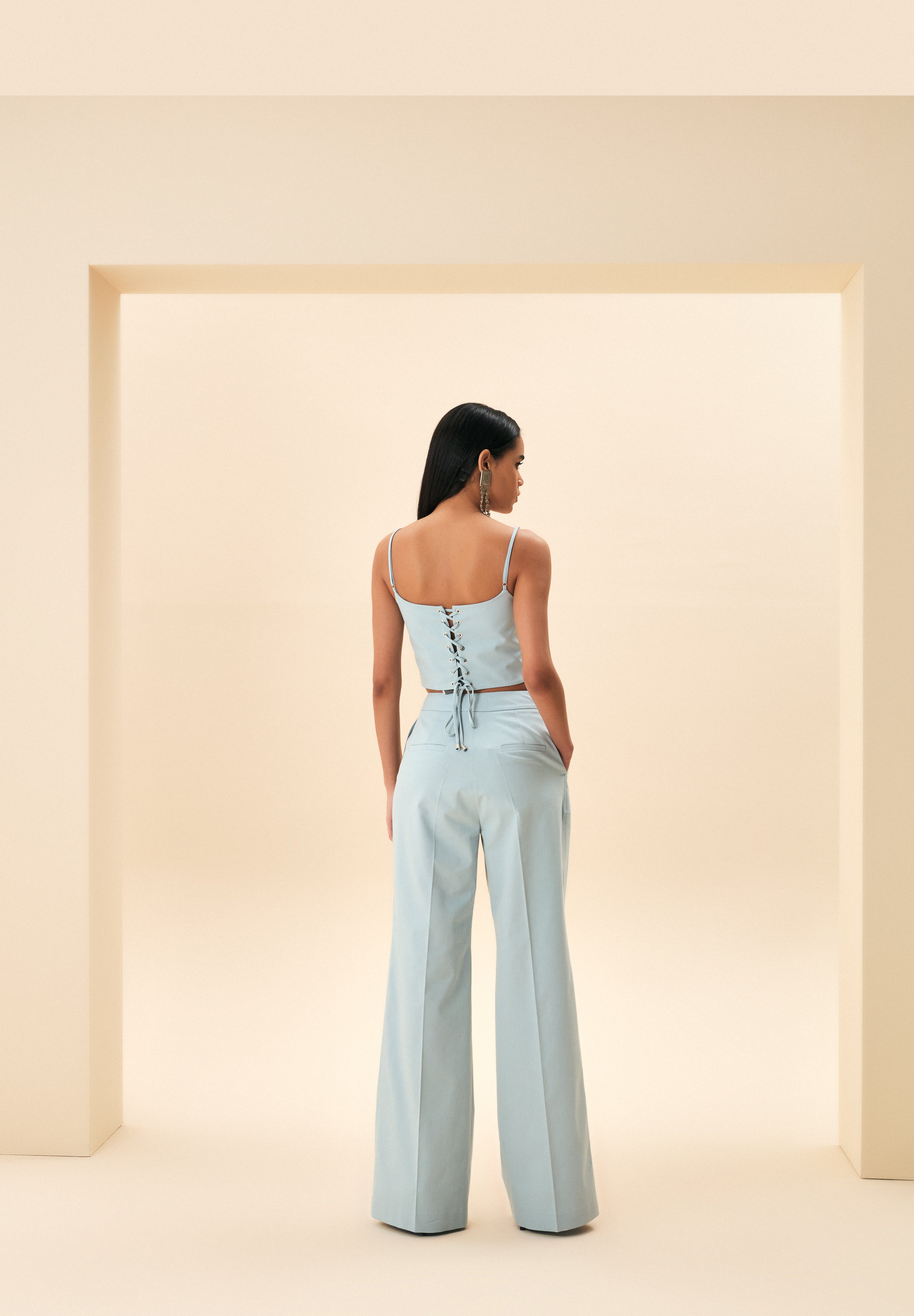 YÜKSEL BEL BOL KESİM ÜTÜ ÇİZGİLİ COTTON PANTOLON MAVİ