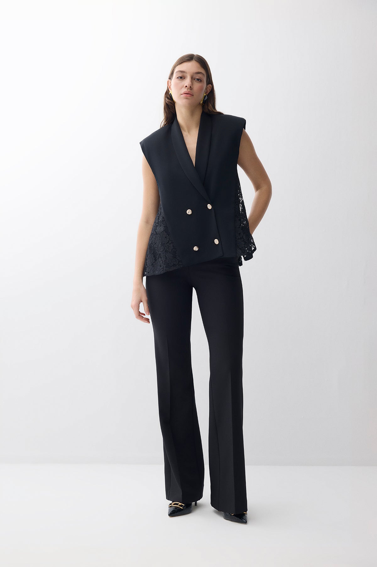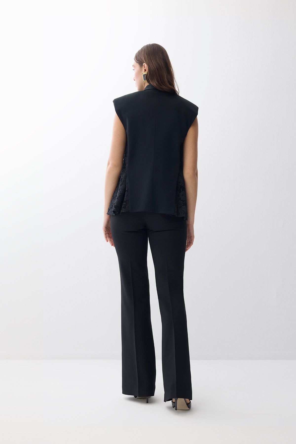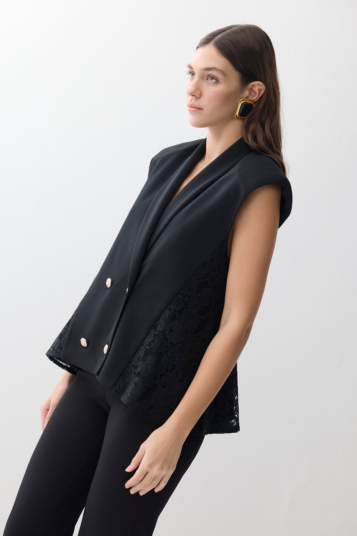 KRUVAZE KAPAMALI YANLAR DANTELLİ KREP YELEK SİYAH