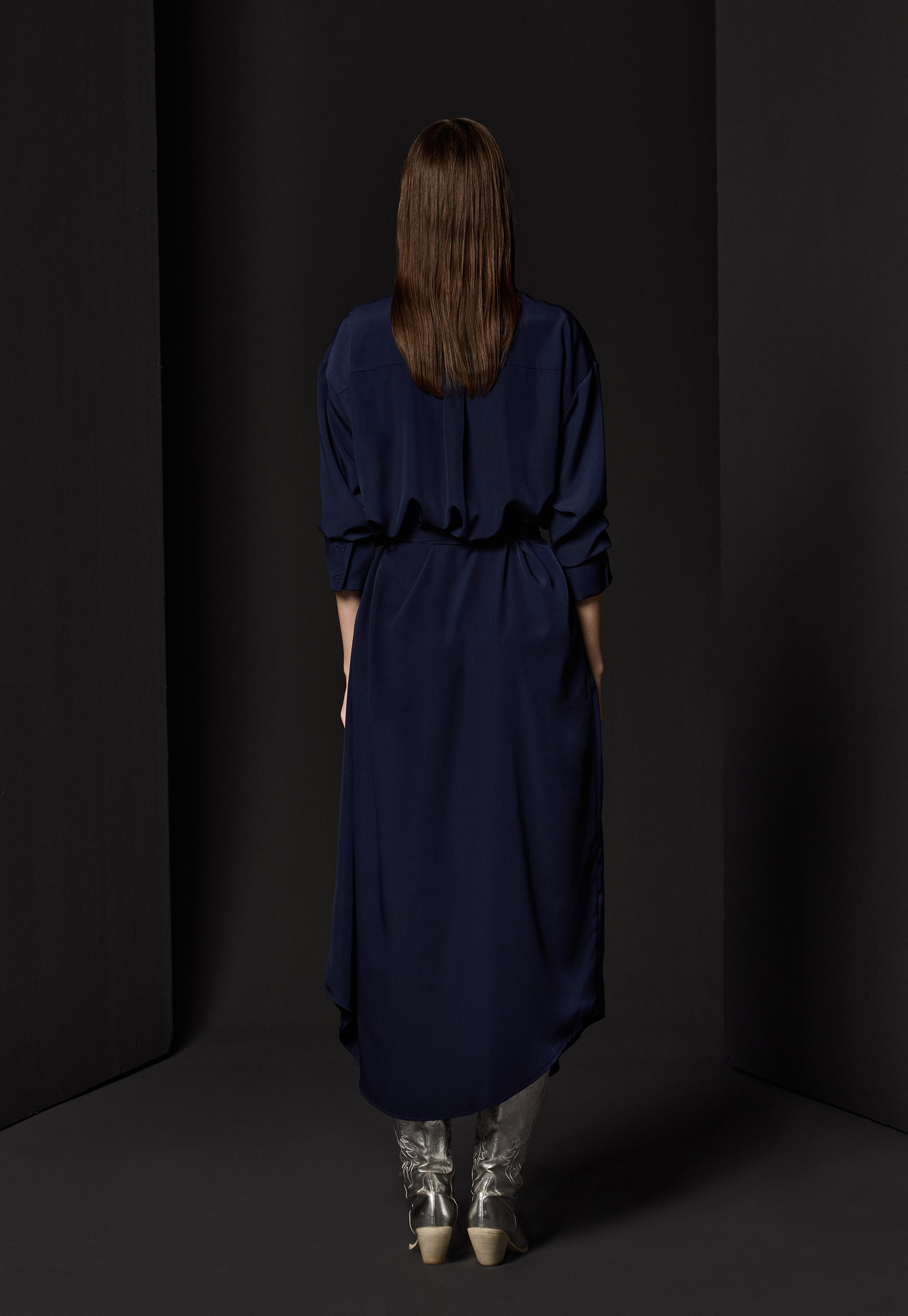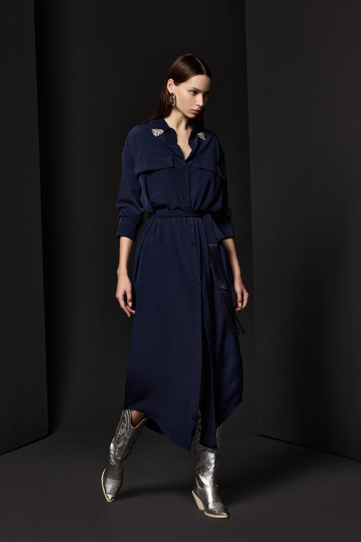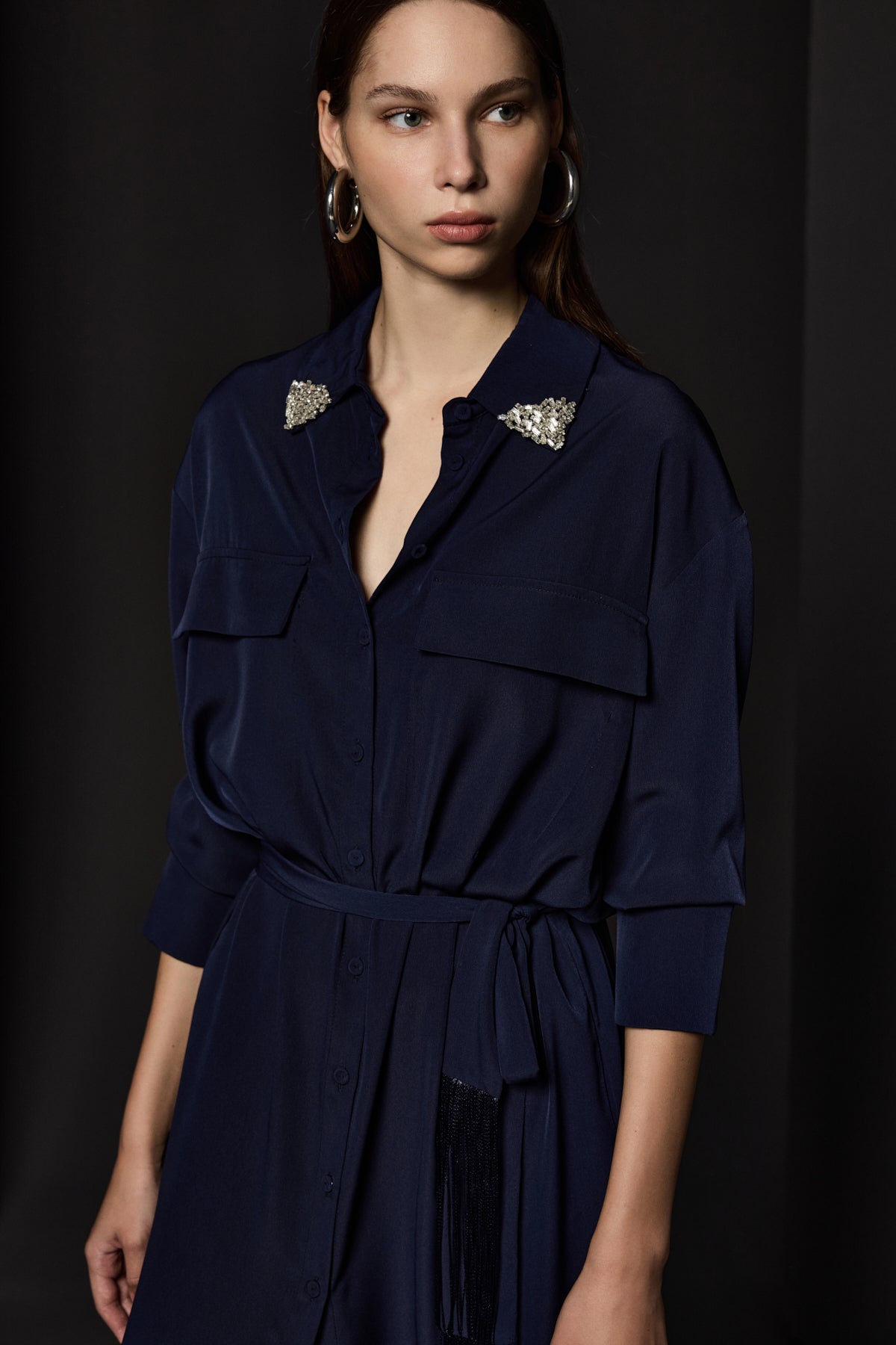 YAKASI TAŞ İŞLEMELİ FULARLI GÖMLEK ELBİSE LACİVERT