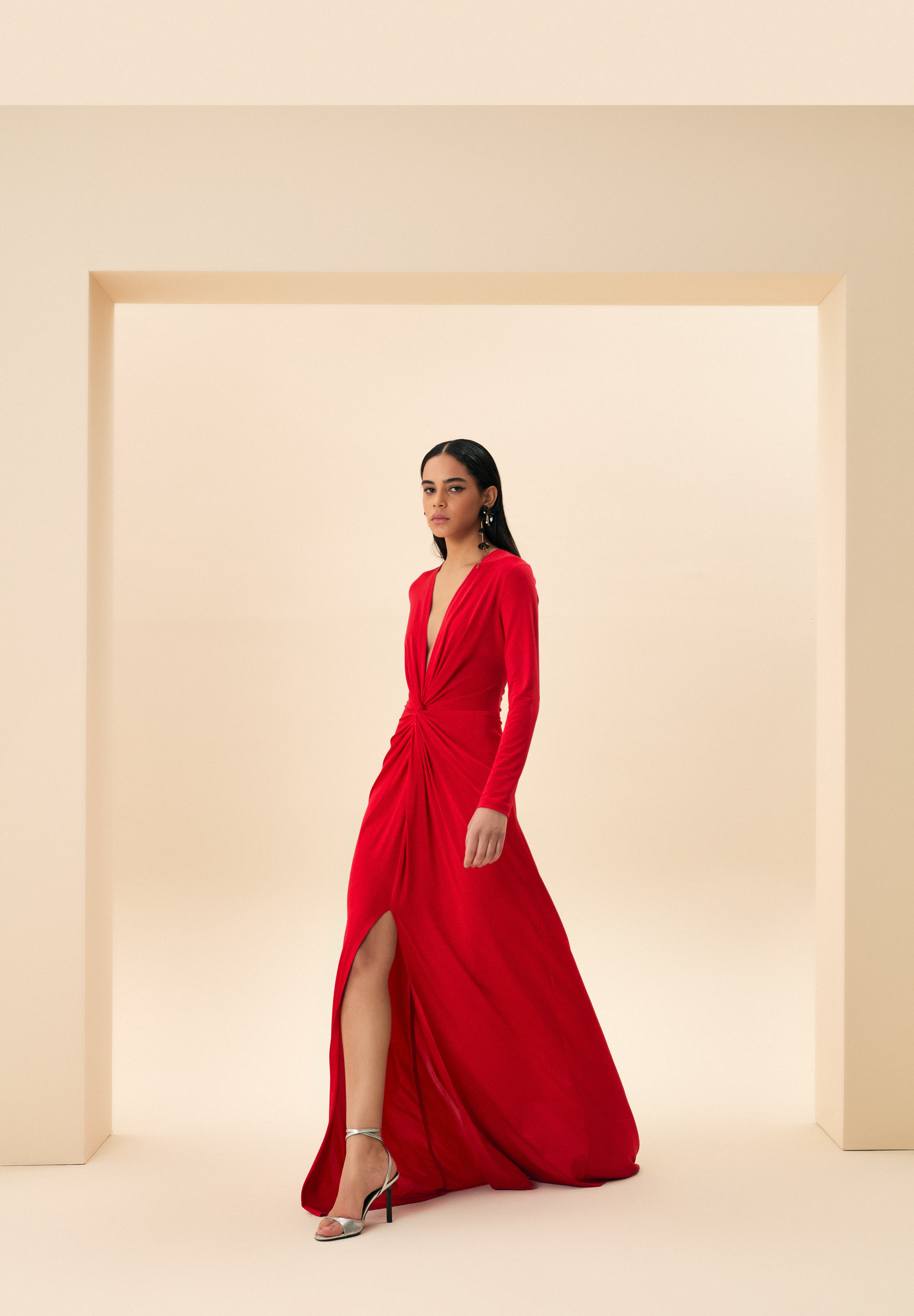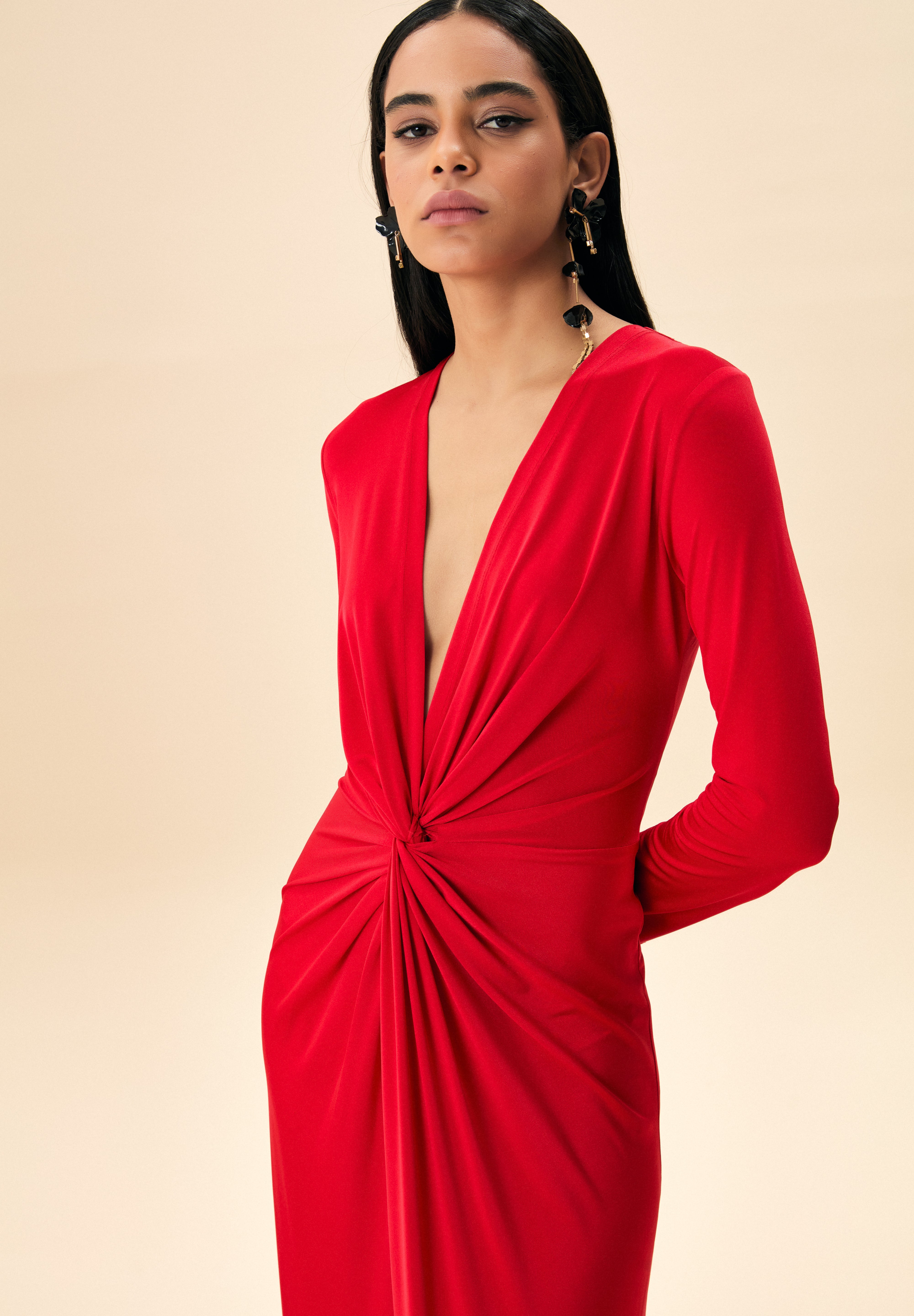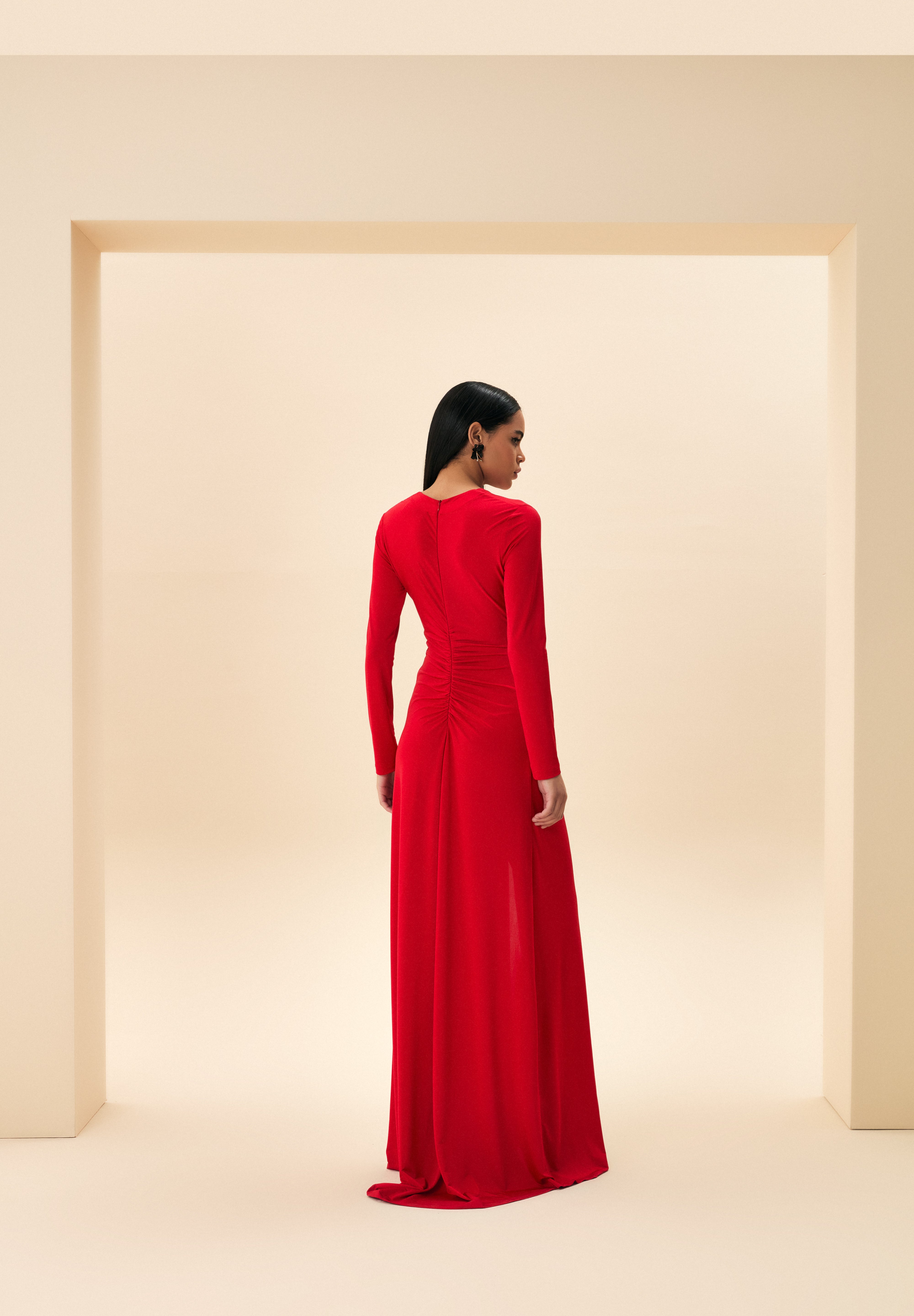 JARSE ÖNDEN YIRTMAÇLI UZUN KOLLU ELBİSE KIRMIZI